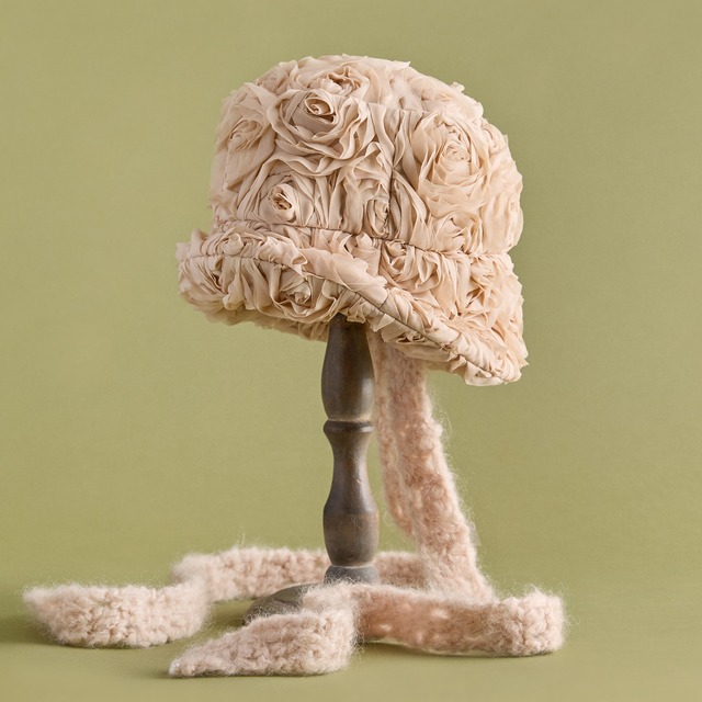 〜薔薇の巣〜 イタリア製の薔薇刺繍生地を使用した特別なハット。 キルト綿芯を生地の裏側に纏わせることで、まるで巣に包まれるような温さと、程よいボリューム感を実現しました。ベースはバケットハット型。つばを後ろだけ上げたり、全体を上げたりと、シーンに合わせて表情を変えてお楽しみいただけます。 手編みのマフラーを思わせる、可愛らしいボリュームのある顎紐。モヘア毛糸で手編みしています。顎紐の先端には天然パールをあしらい、上品な優しさをプラス(ループ式で容易に取り外し可能。帽子本体にリボンとして巻いても可愛らしくアレンジできます)。 薔薇刺繍生地が華やかで、冬の装いに特別感を添えます。防寒性とデザイン性を兼ね備え、日常使いから特別なお出かけまで幅広く活躍。「薔薇の巣」という名の意味の通り、身に着ける人を優しく包み込みます。 【カラー】 Beige 【素材】 本体:ポリエステル100% 裏地:ポリエステル100% リボン:モヘヤ69% ウール29% ナイロン2% 【サイズ】 ONESIZE 約57.5cm(サイズ調節付き-2cm) 【生産国】 日本製 CIQ259