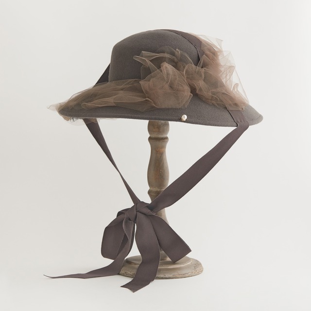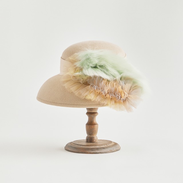 フォックスファーとフリルが躍るドラマチックなカサブランカハットです。 アンティークの木型で製作したハットで、クラウン、ブリム共に美しい膨らみと曲線を持ったボディです。 カサブランカ、と呼ばれている湾曲したブリムは女性のお顔を妖艶に見せてくれます。 水彩画を描くように幾色ものチュールをフリルに縫い、重ねることで絵画のような帽子に仕立てました。フォックスファーとフリルのコンビネーションがとても華やかなのですが、更につば裏にもフリルを繰り返すことによって、お顔の隣に常に寄り添い、一層にドラマチックです。 長く寒い冬にも、春を感じることができるように、という気持ちを込めて製作しました。 *こちらのフォックスファーはマフラーとして作られたものを分解しアップサイクルしております。そのため見えない裏側の部分で縫製の跡がある場合があります。 *ファーの毛並み、色の出方には個体差がありますのでご了承ください。 *素材の性質上、斑点のような小さな不純物や小さな凹みがございますので、予めご了承の上、ご購入くださいませ。 【カラー】 Gray beige Charcoal Pink beige 【素材】 本体:ウール100% リボン:レーヨン100% チュール:ナイロン100% ファー:フォックス 【サイズ】 頭周り約57.5cm。(サイズ調節有り-2cm) 【機能】 サイズ調節付きです。スベリ内側のアジャスターで、2cm程度小さくすることができます。 【生産国】 日本製 CIQ155