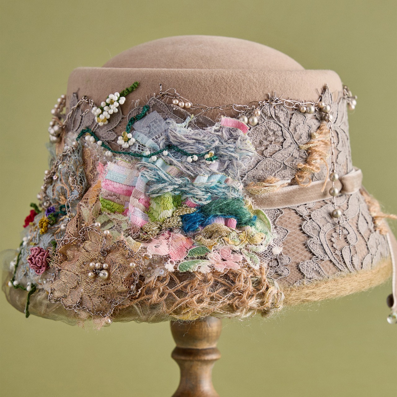 フランス製の最高級レースやスパングル、刺繍の絹糸、手描きで染めたレース、そして一点一点かぎ針で編んだ花やビーズ細工。数え切れないほどの素材と手仕事を重ね、360度どこから見ても美しい装飾を施しています。