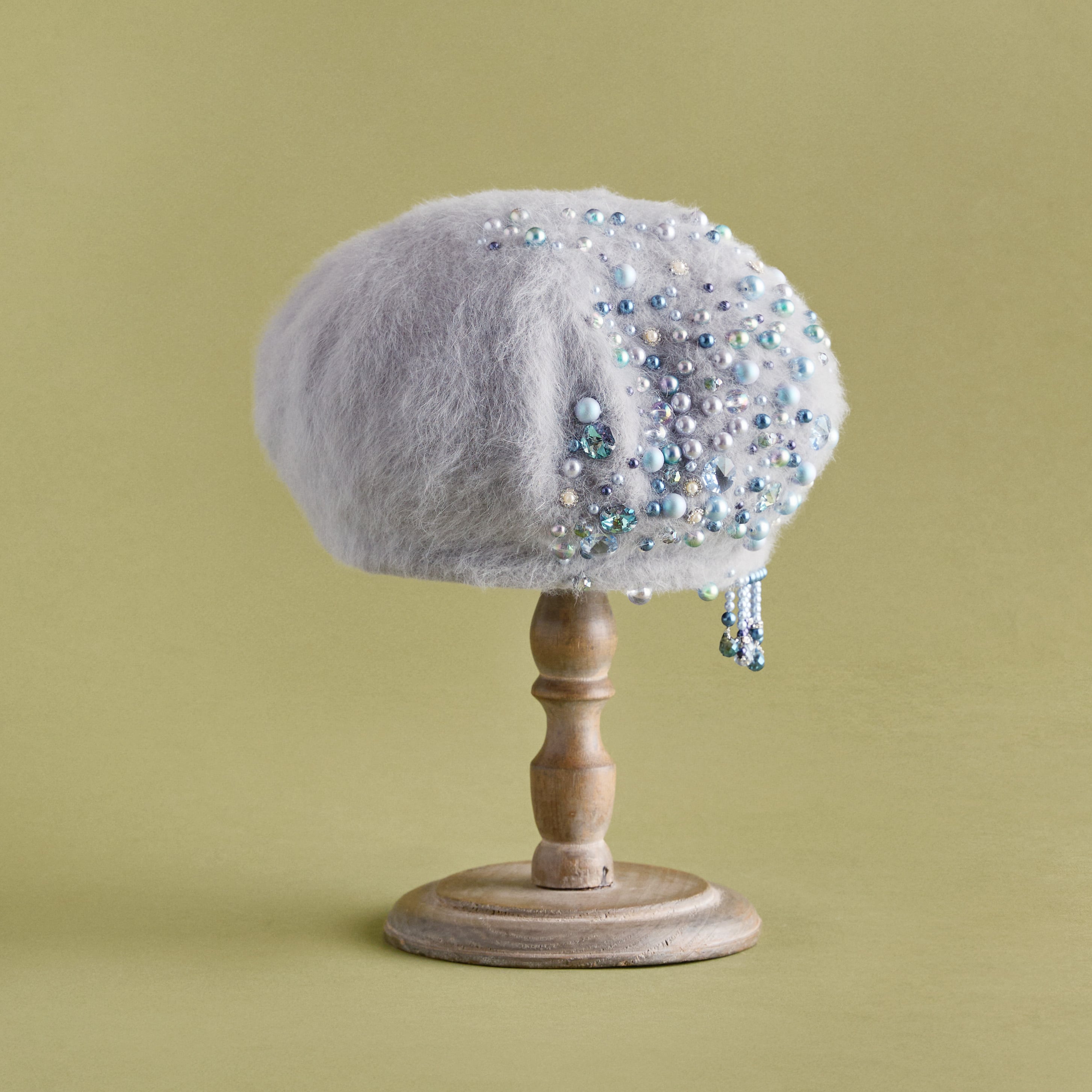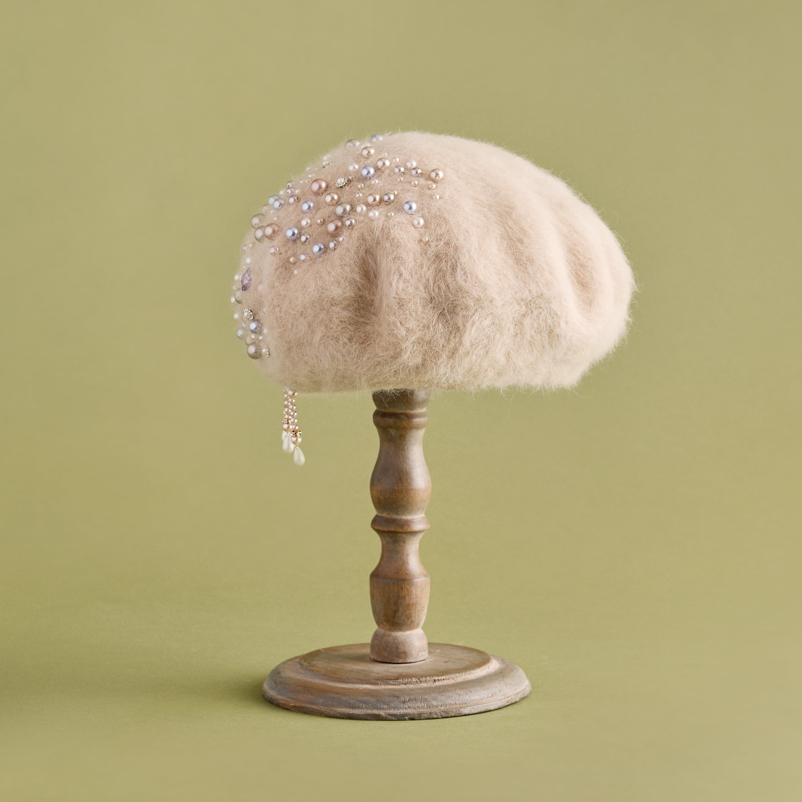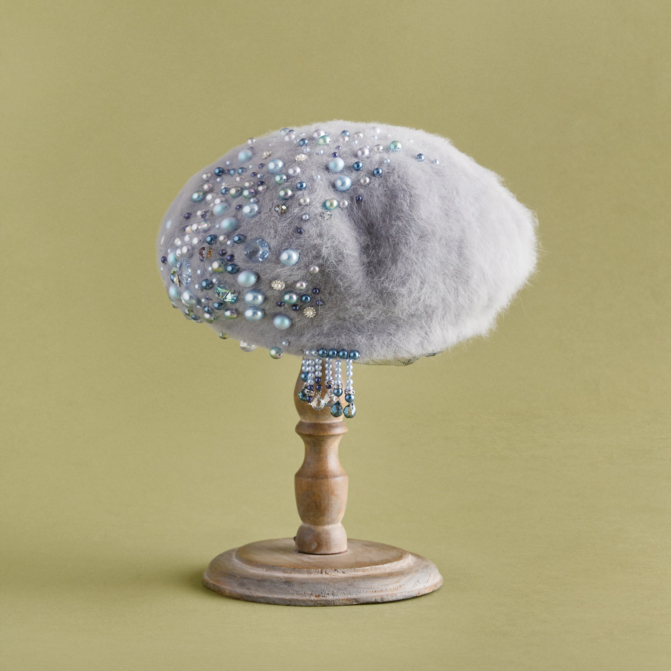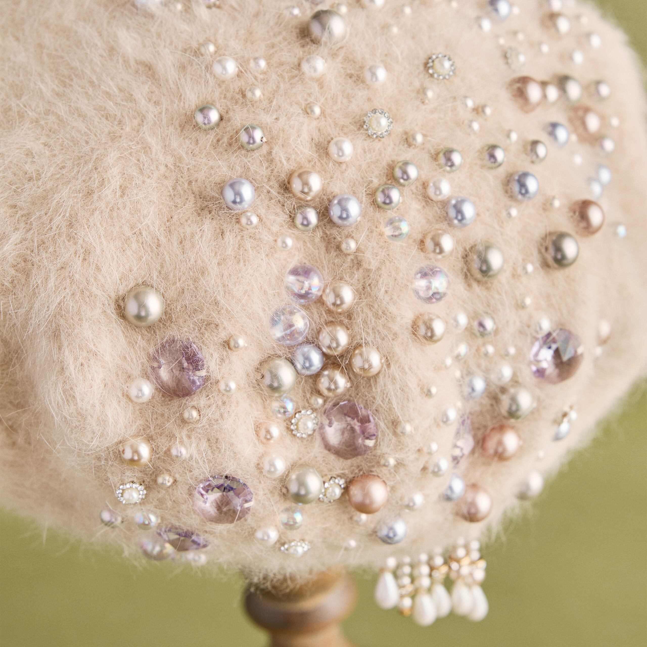 ラインストーン、パール、ガラスパーツ、様々な種類のビーズ。およそ200粒のパーツを飾ったベレー帽は1粒づつ手縫いで丁寧に製作しました。被るとドラマチックな空気を纏う事ができます。