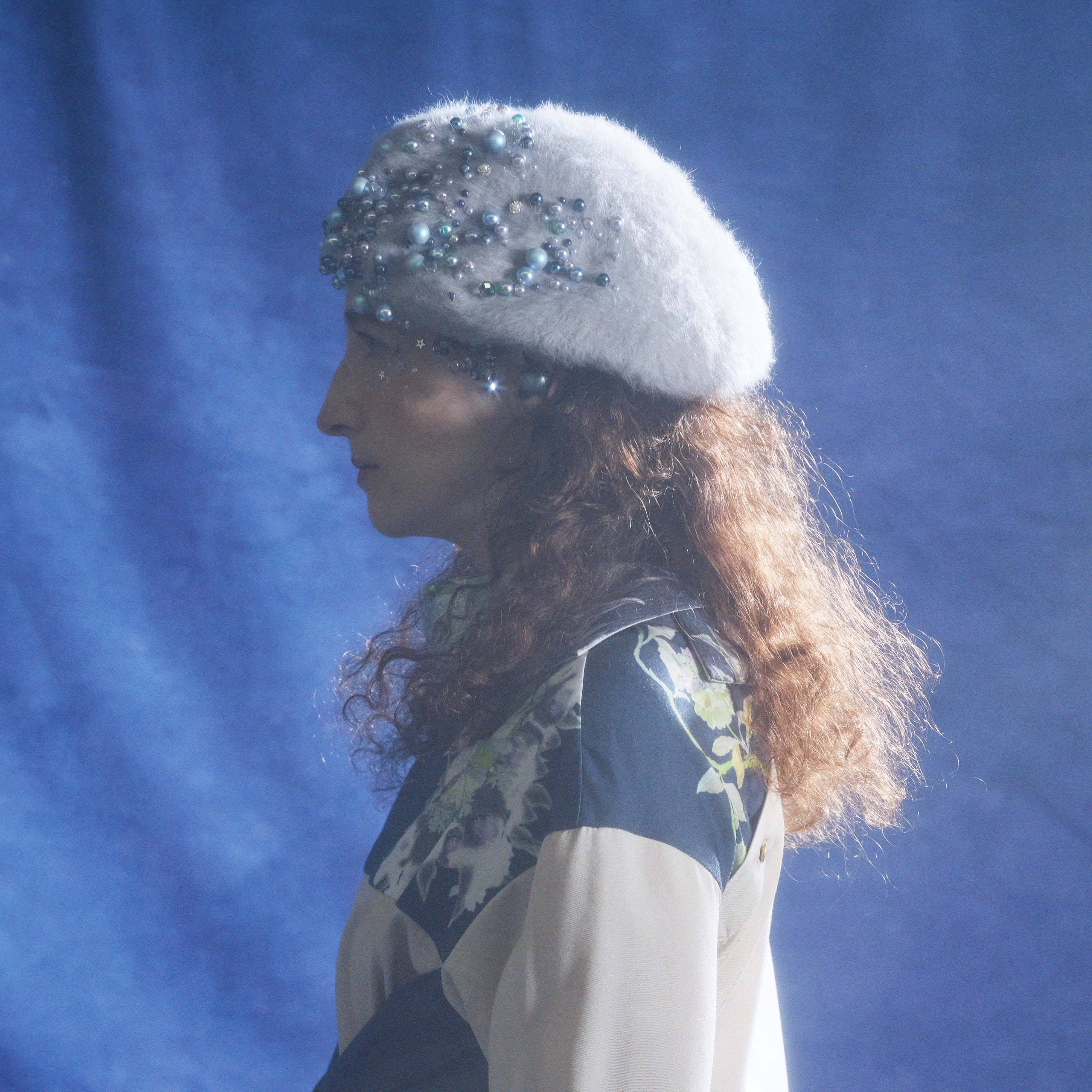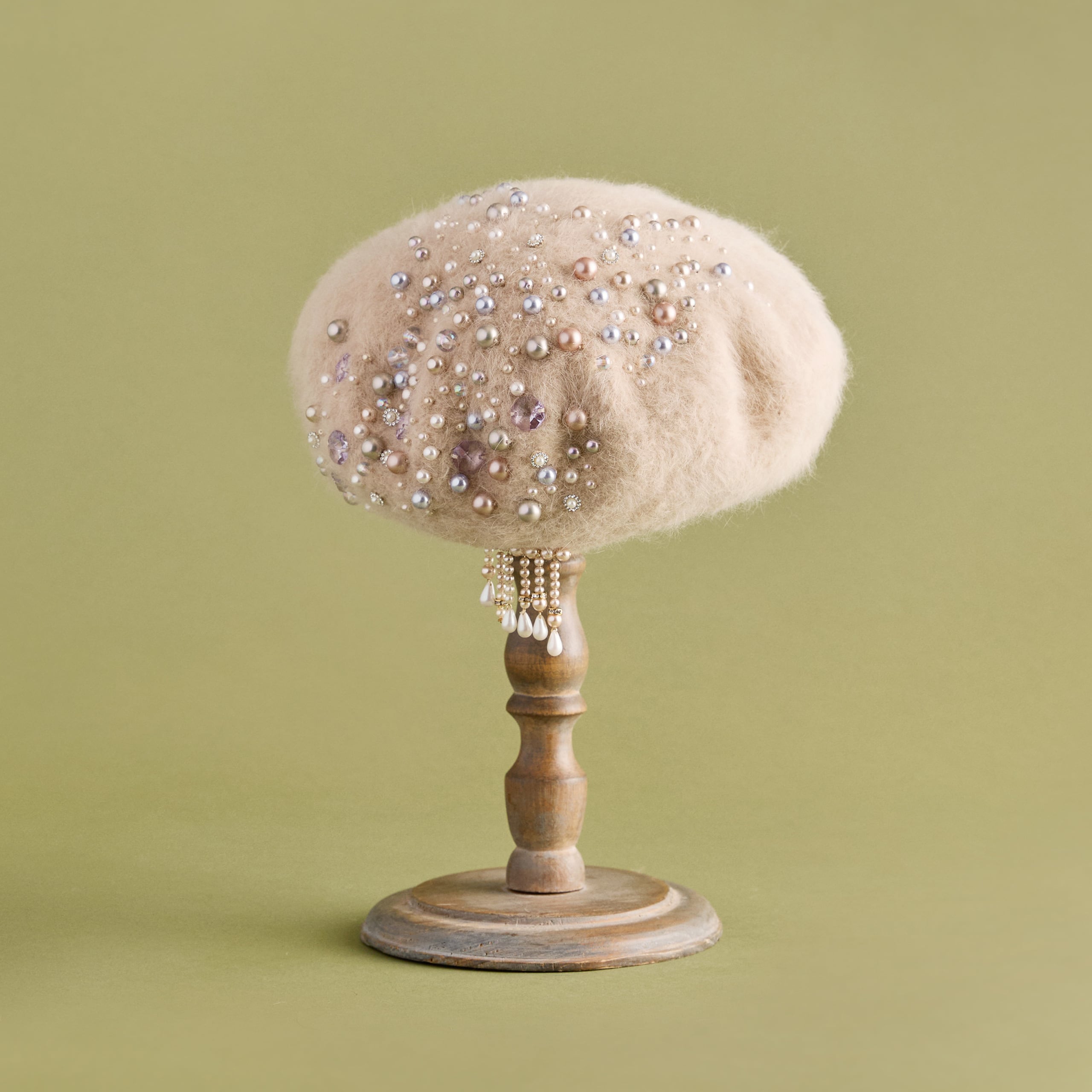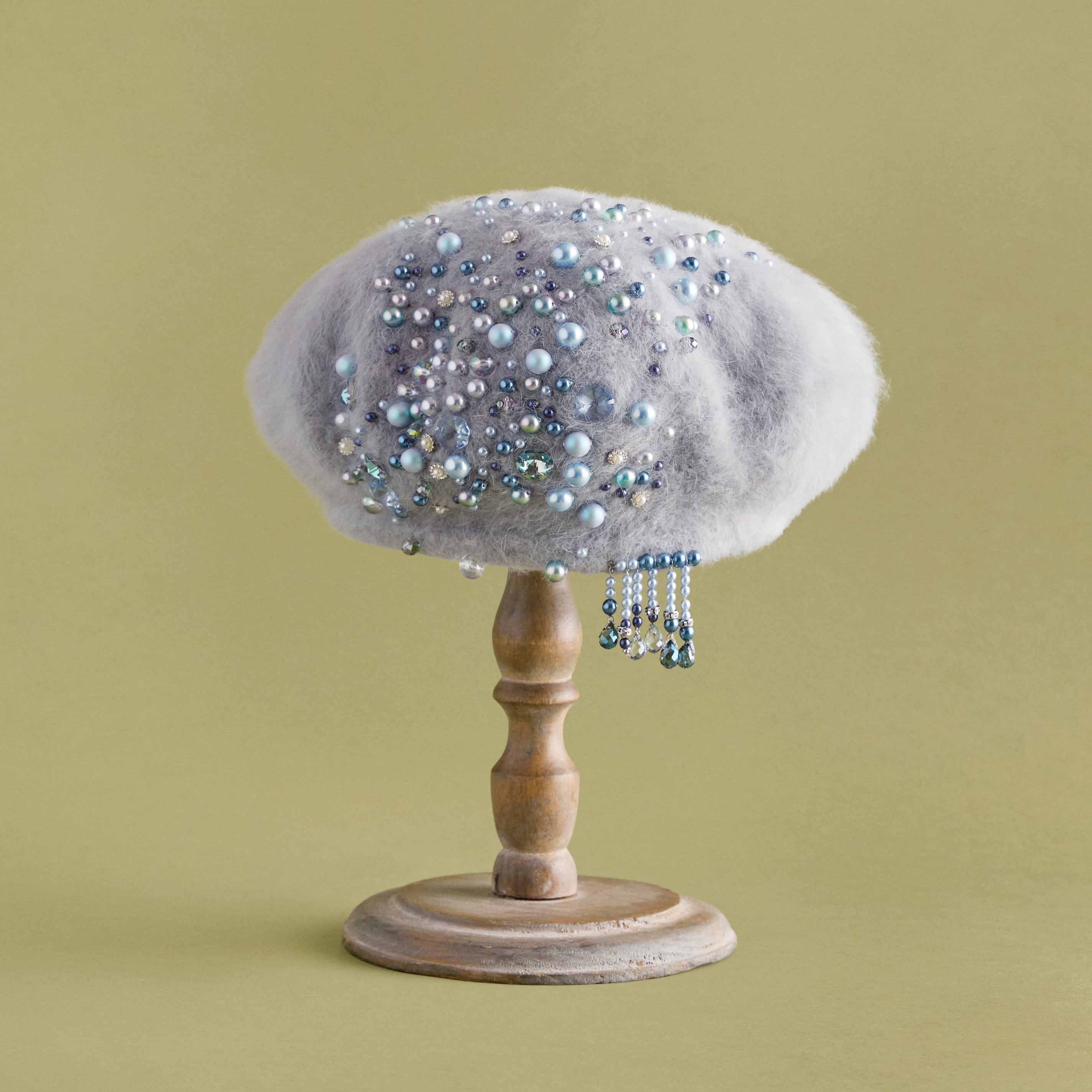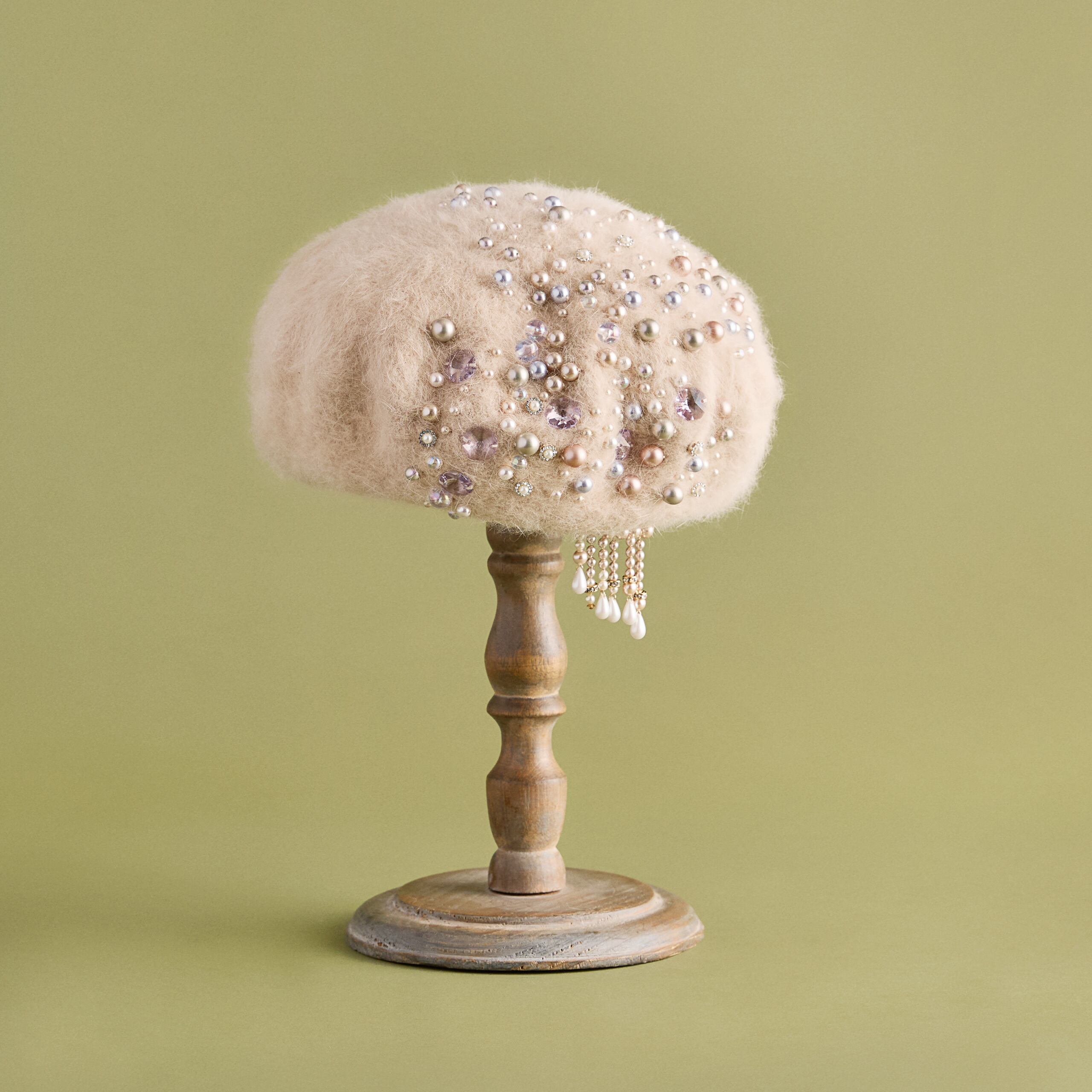 ラインストーン、パール、ガラスパーツ、様々な種類のビーズ。およそ200粒のパーツを飾ったベレー帽は1粒づつ手縫いで丁寧に製作しました。被るとドラマチックな空気を纏う事ができます。