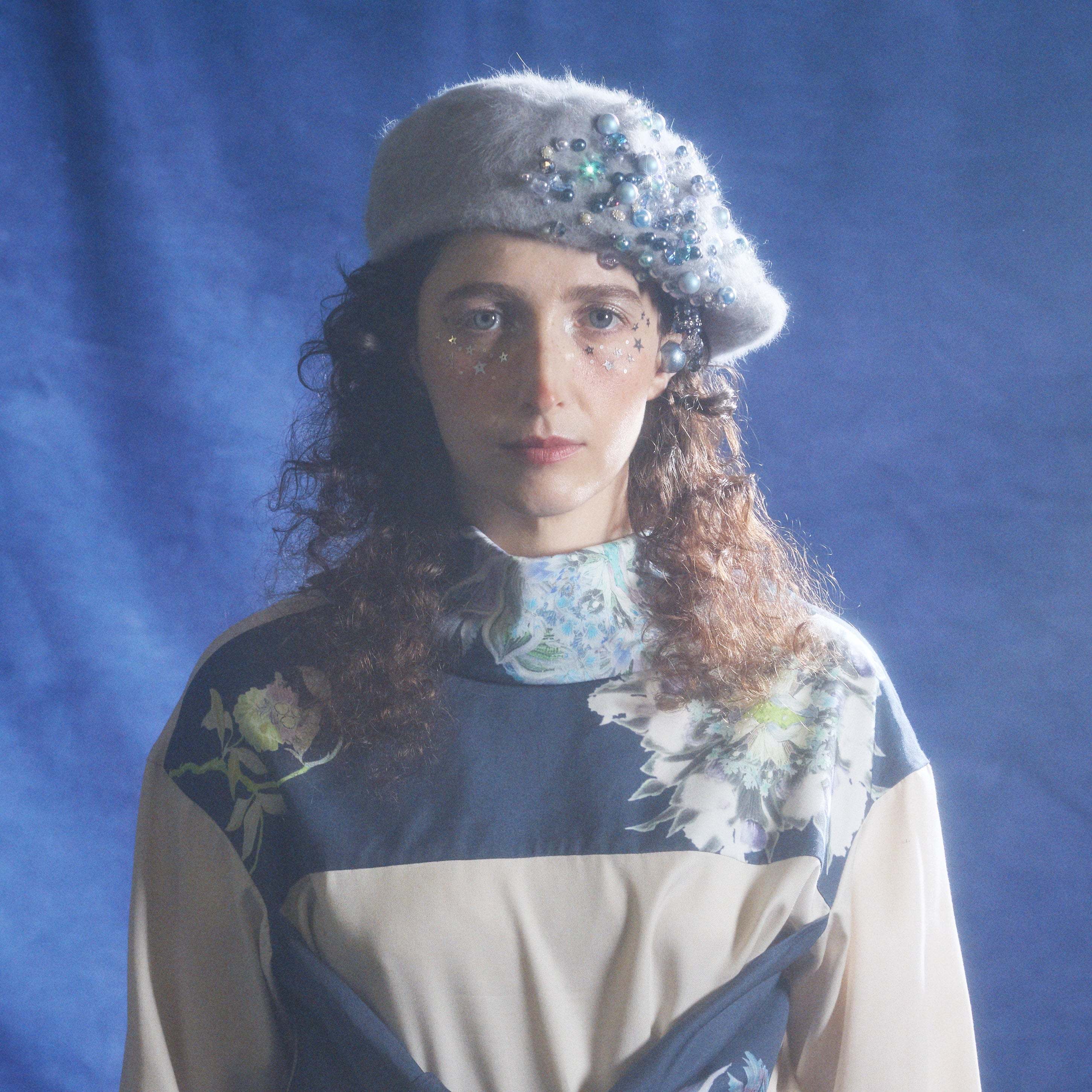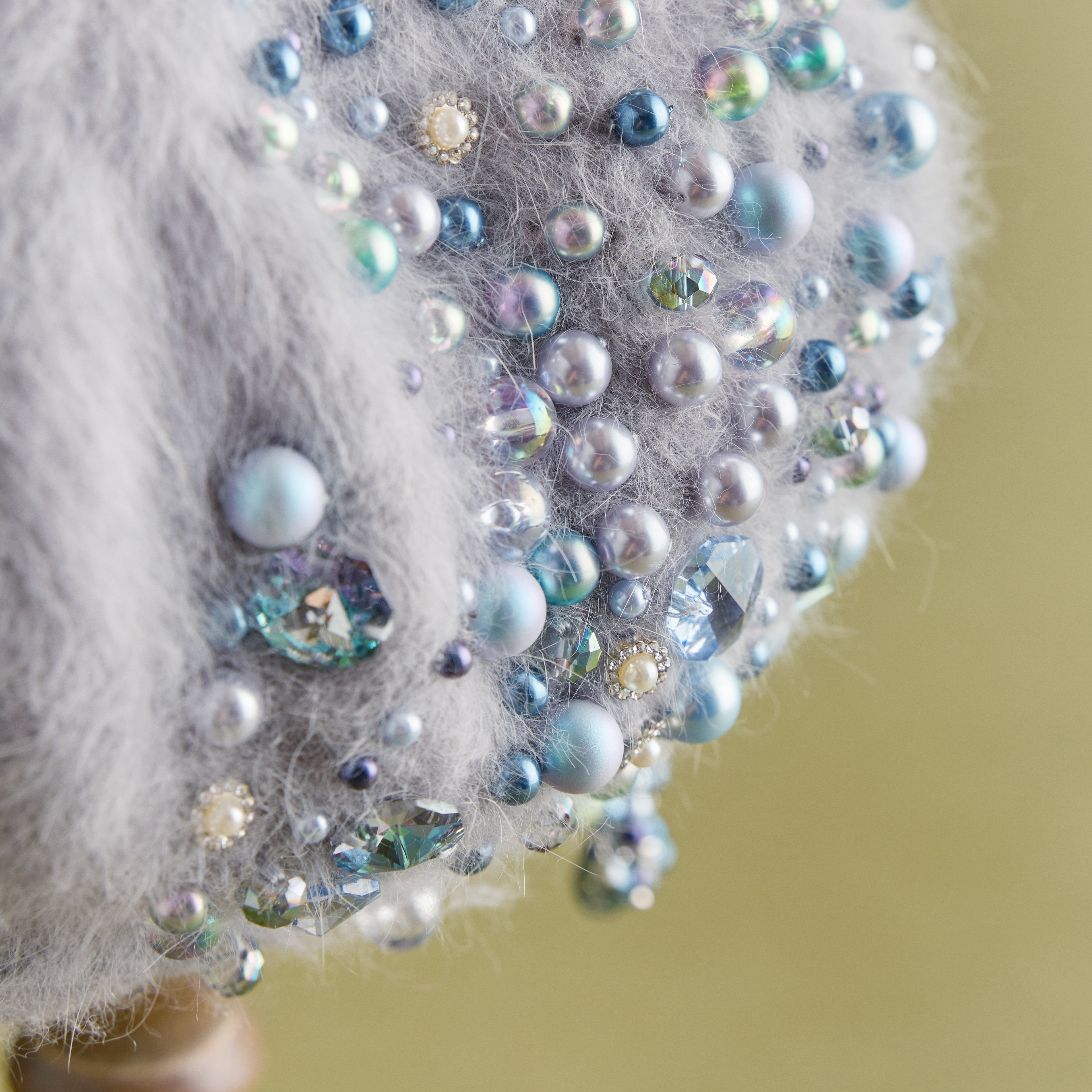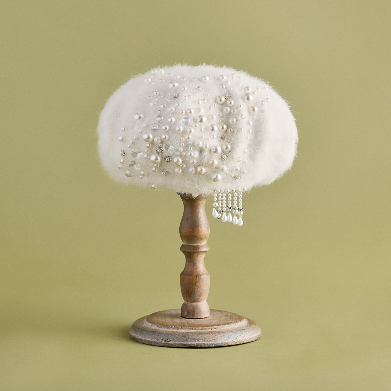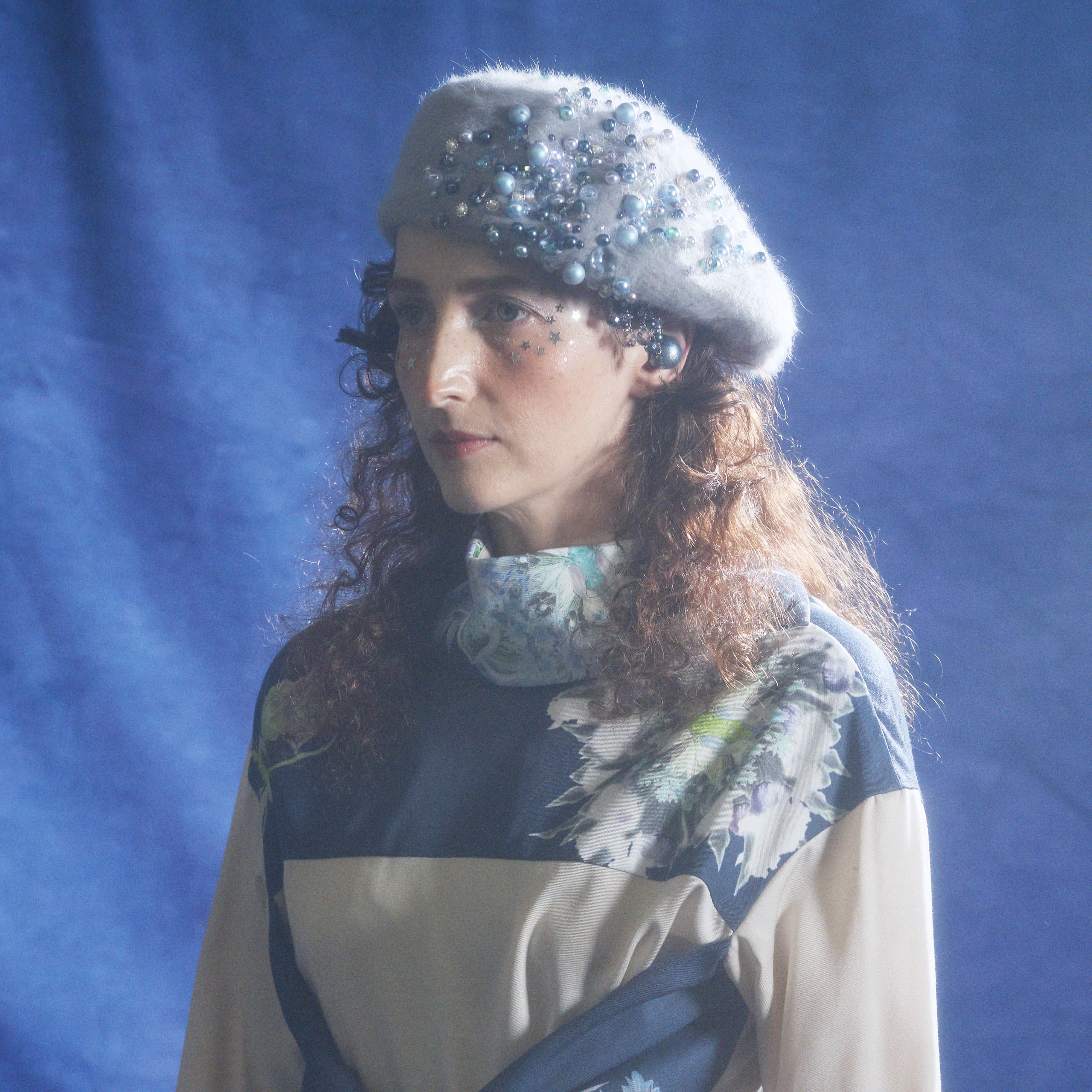 ラインストーン、パール、ガラスパーツ、様々な種類のビーズ。およそ200粒のパーツを飾ったベレー帽は1粒づつ手縫いで丁寧に製作しました。被るとドラマチックな空気を纏う事ができます。