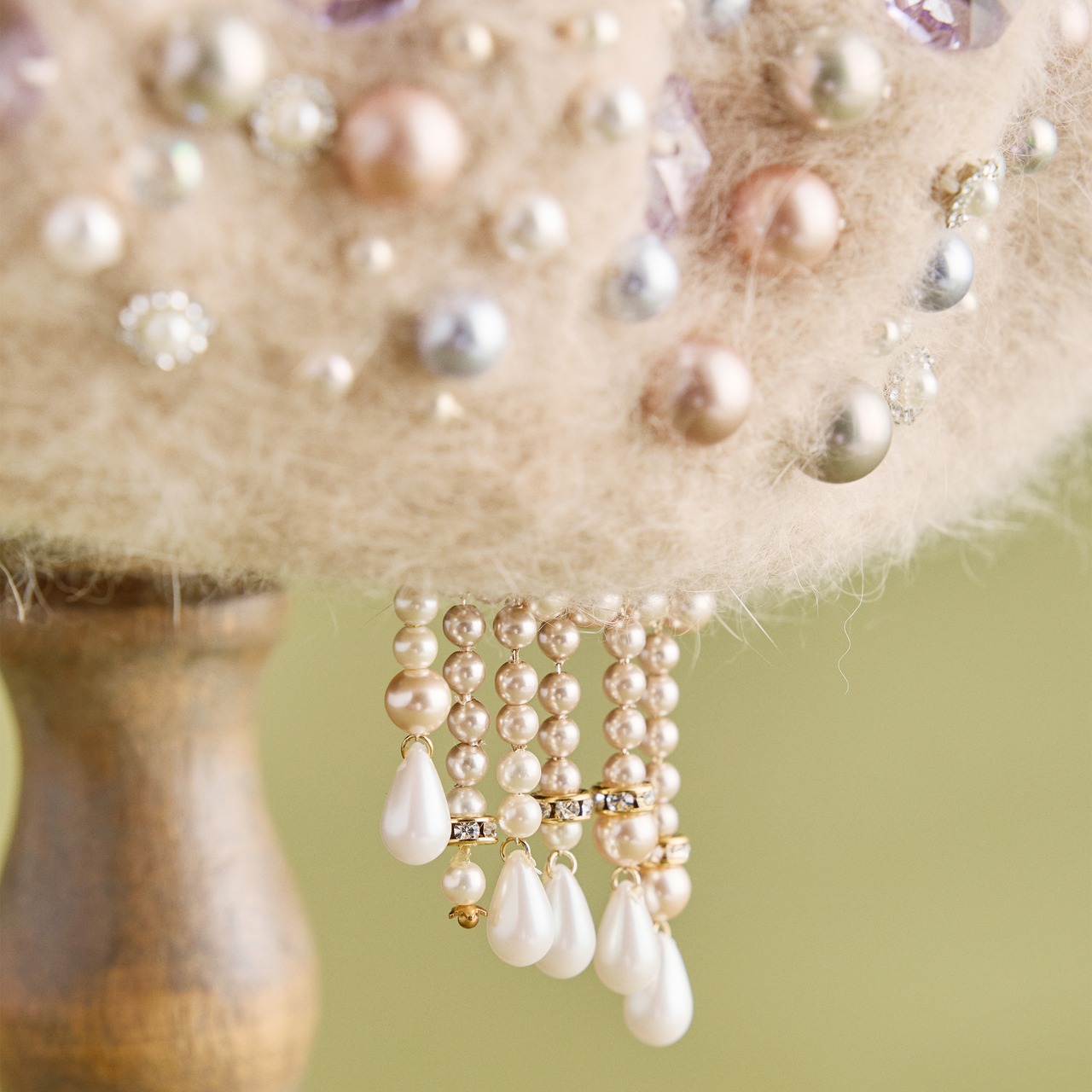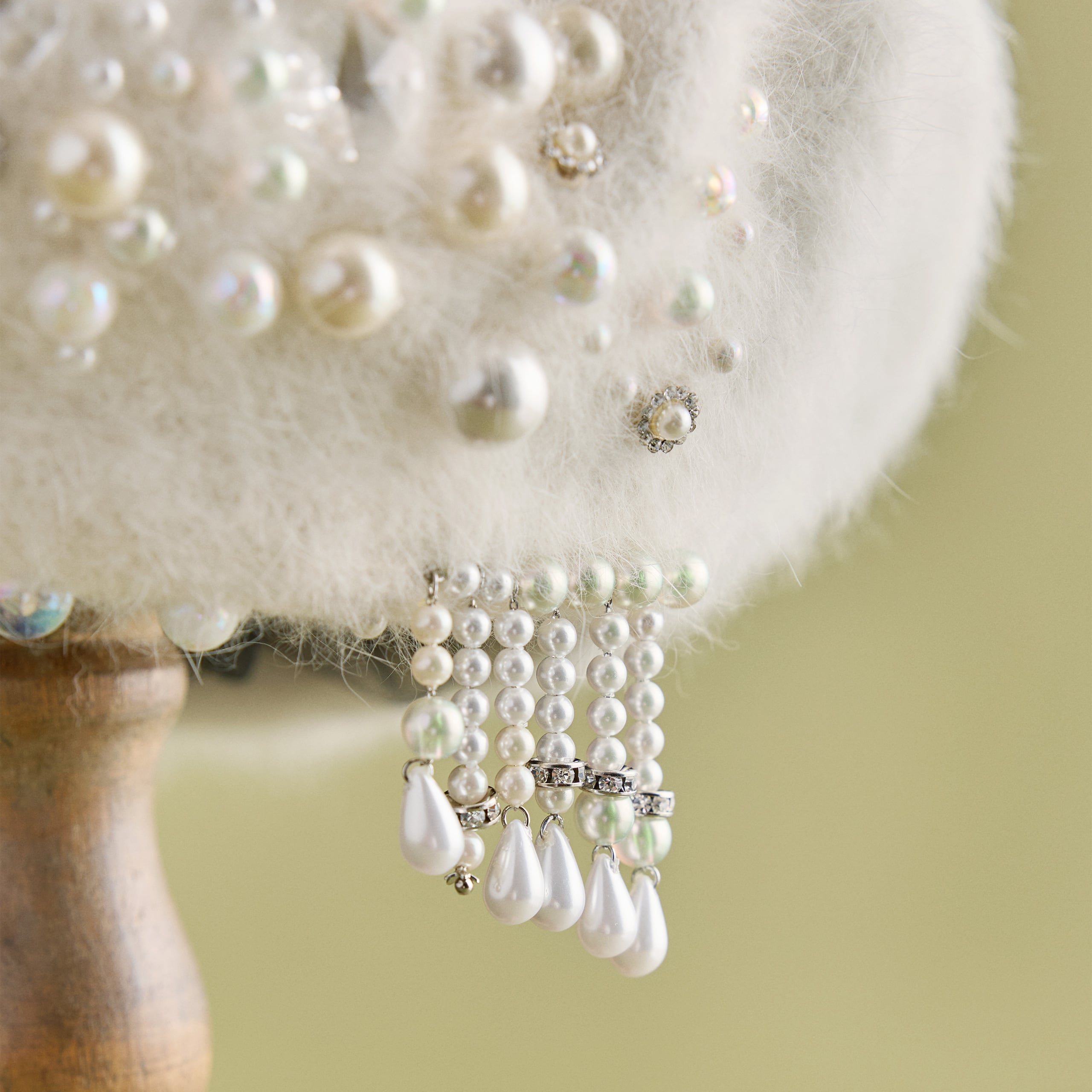 舞妓さんの髪飾りをイメージした耳元で揺れるパール飾りは、シャラリシャラリと耳元で音を奏でてくれて、なんとも女性らしい気分になります。ビーズたちが帽子からこぼれ落ちてきているような、そんなイメージでデザインしました。