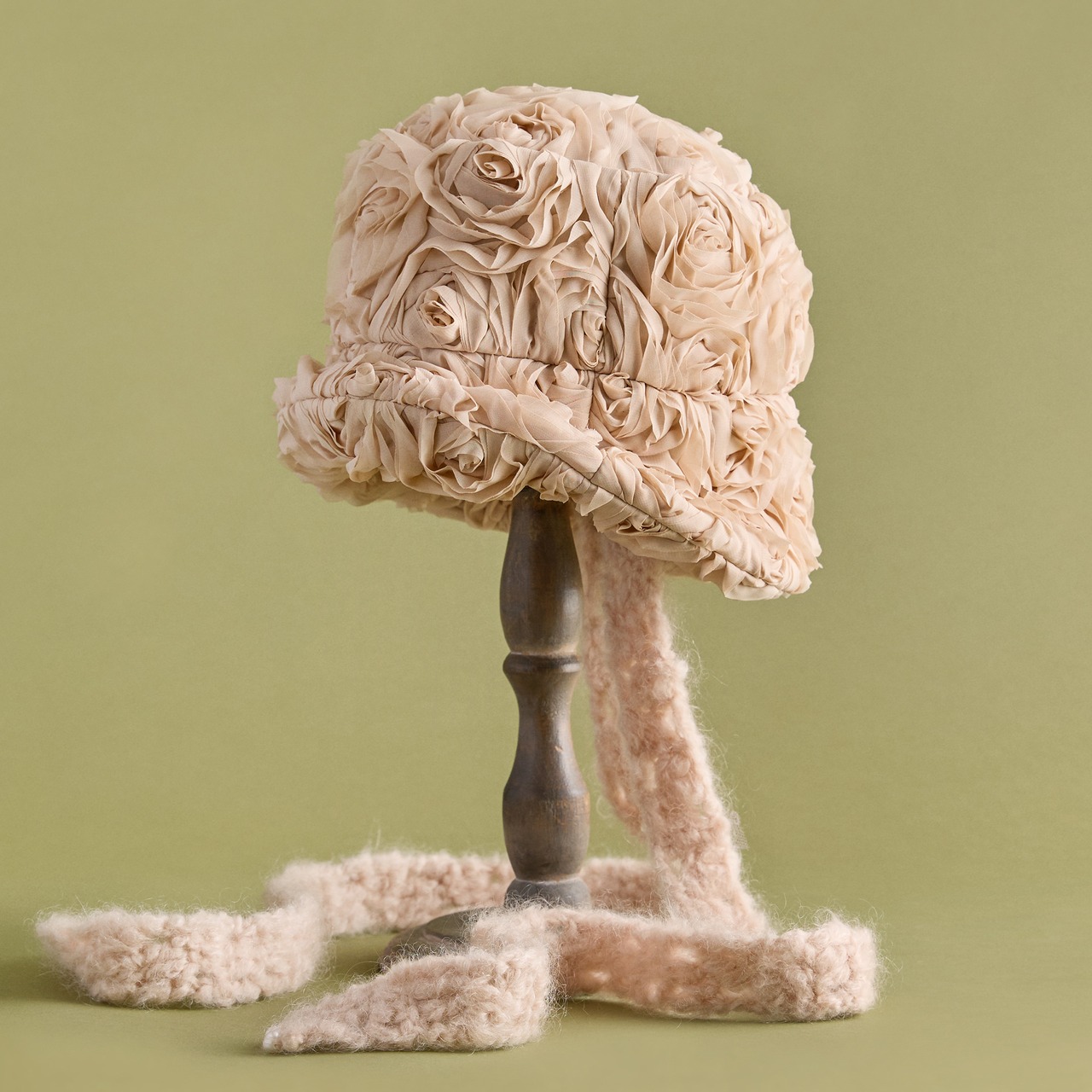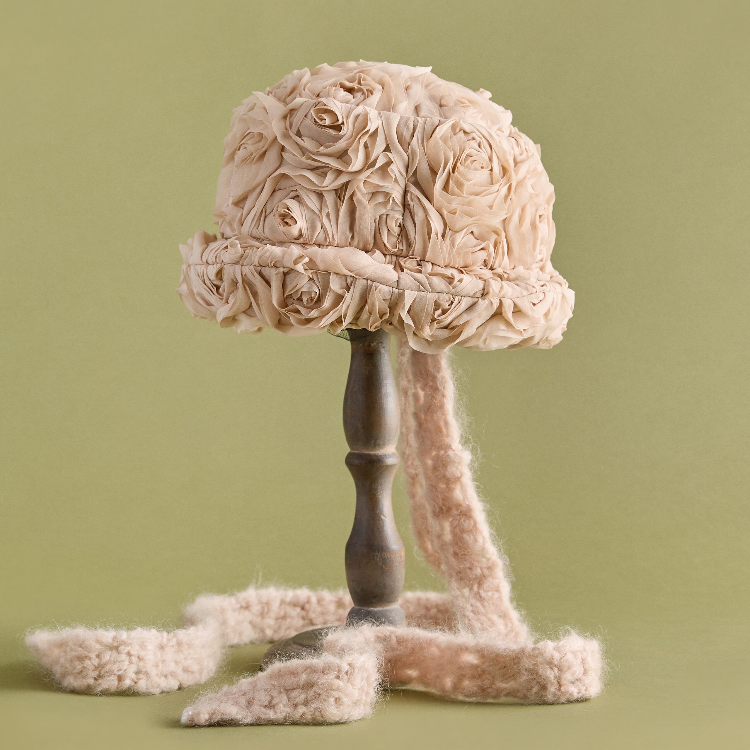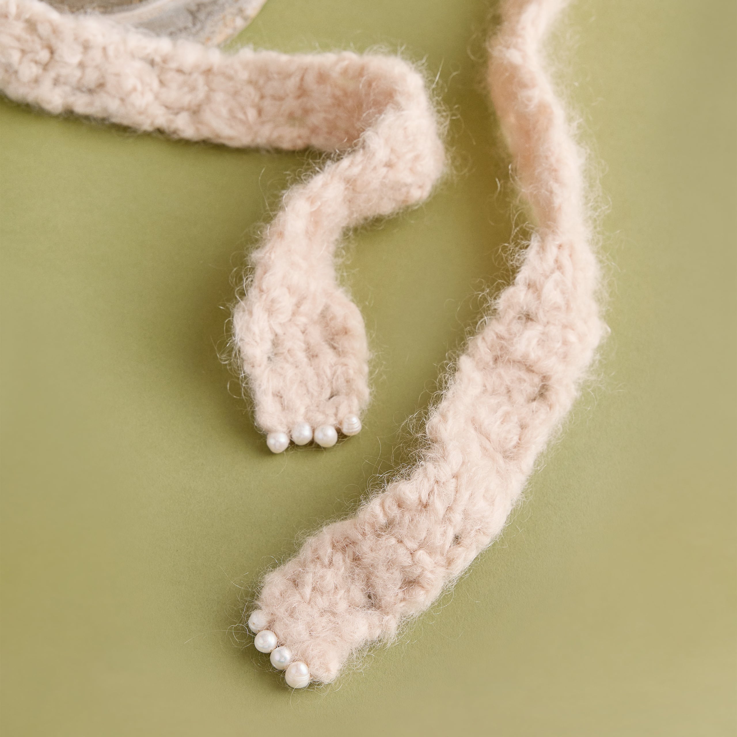 手編みのマフラーを思わせる、可愛らしいボリュームのある顎紐。モヘア毛糸で手編みしています。顎紐の先端には天然パールをあしらい、上品な優しさをプラス(ループ式で容易に取り外し可能。帽子本体にリボンとして巻いても可愛らしくアレンジできます)。