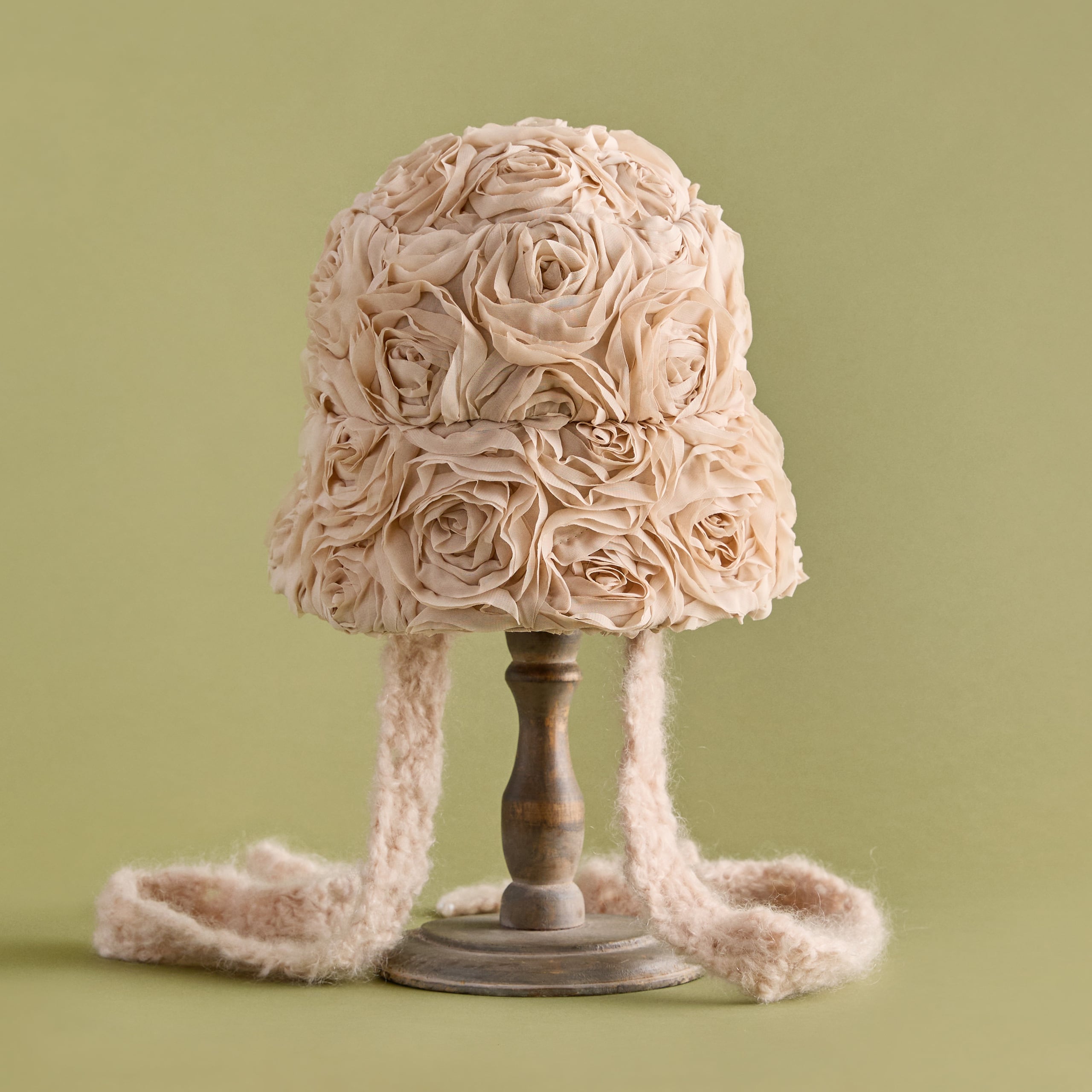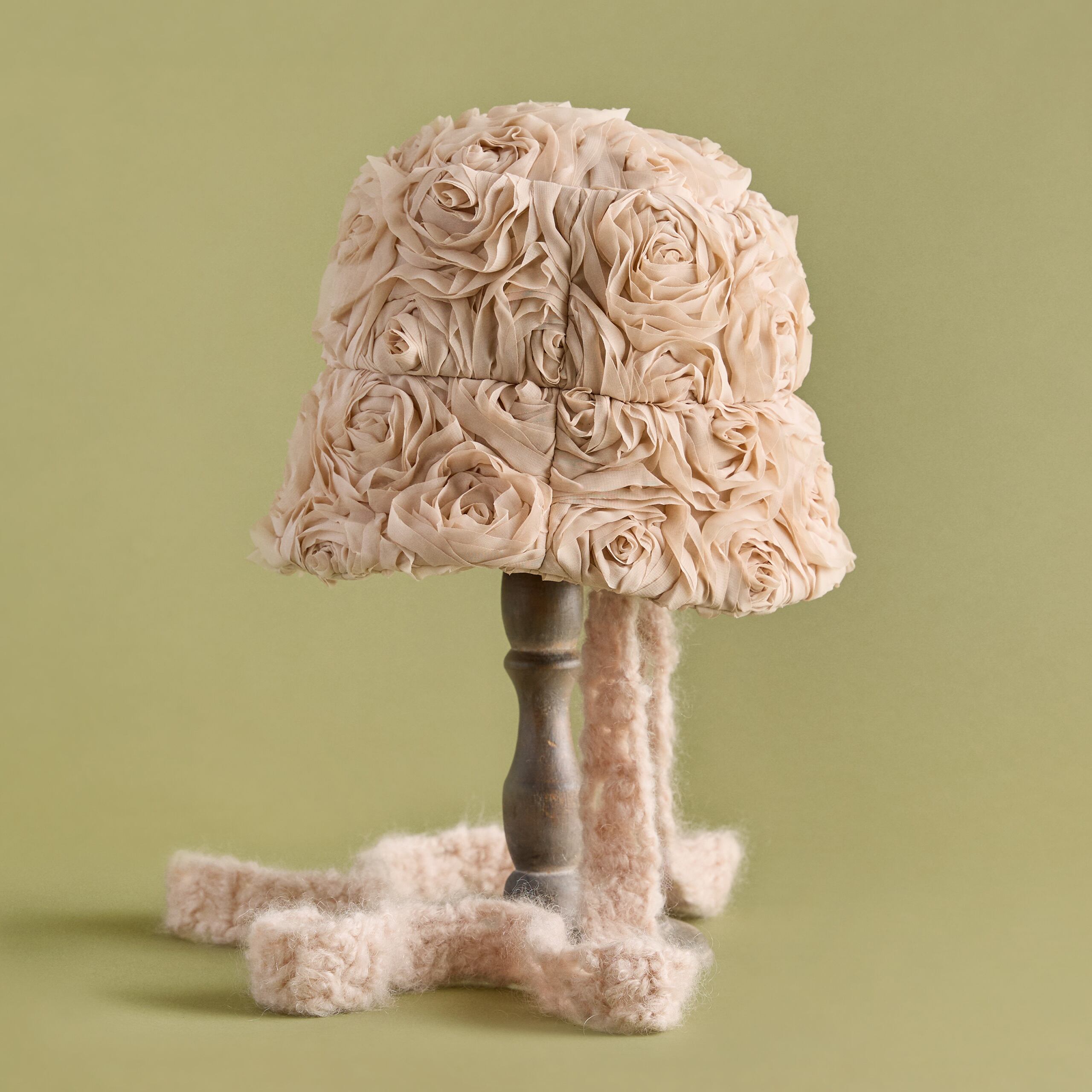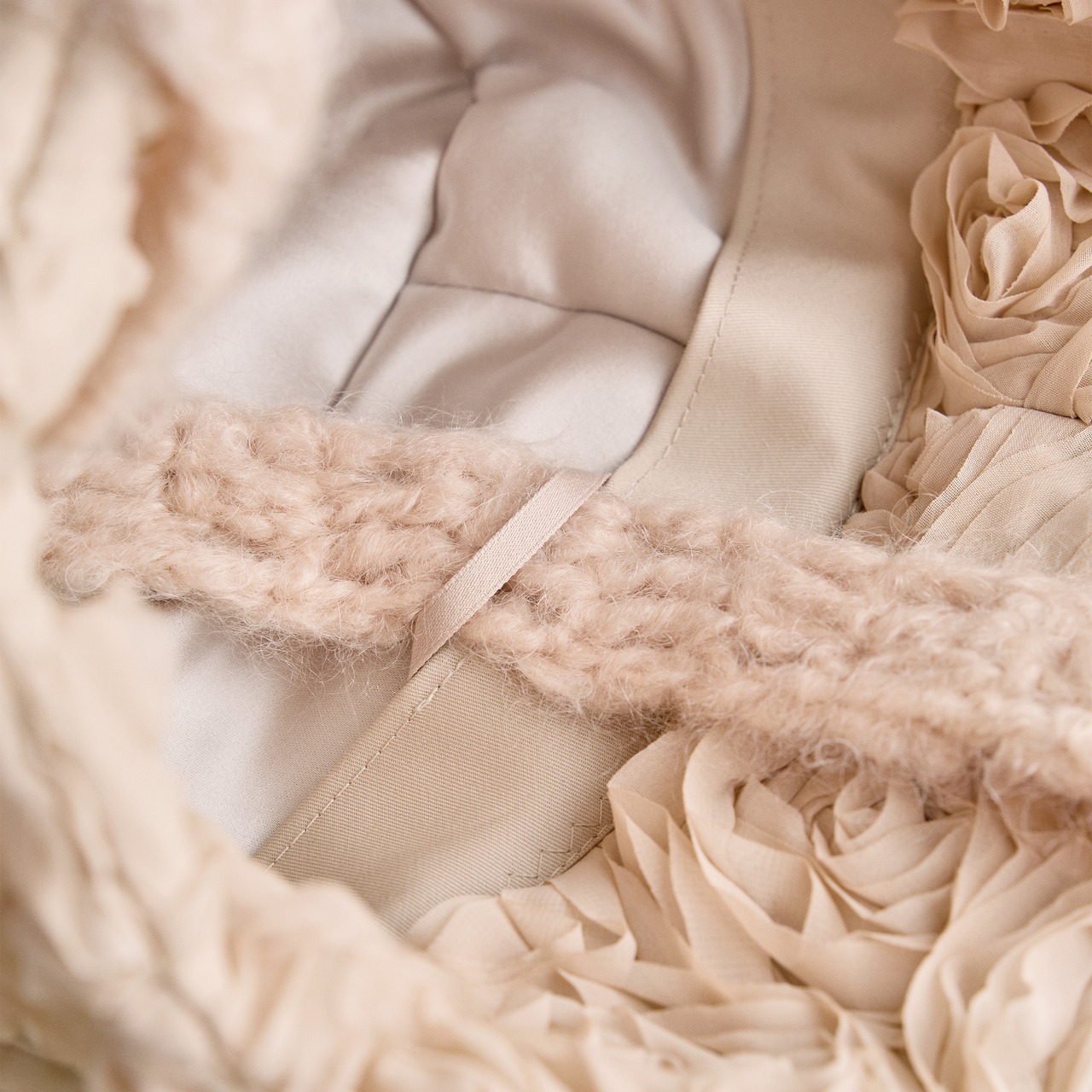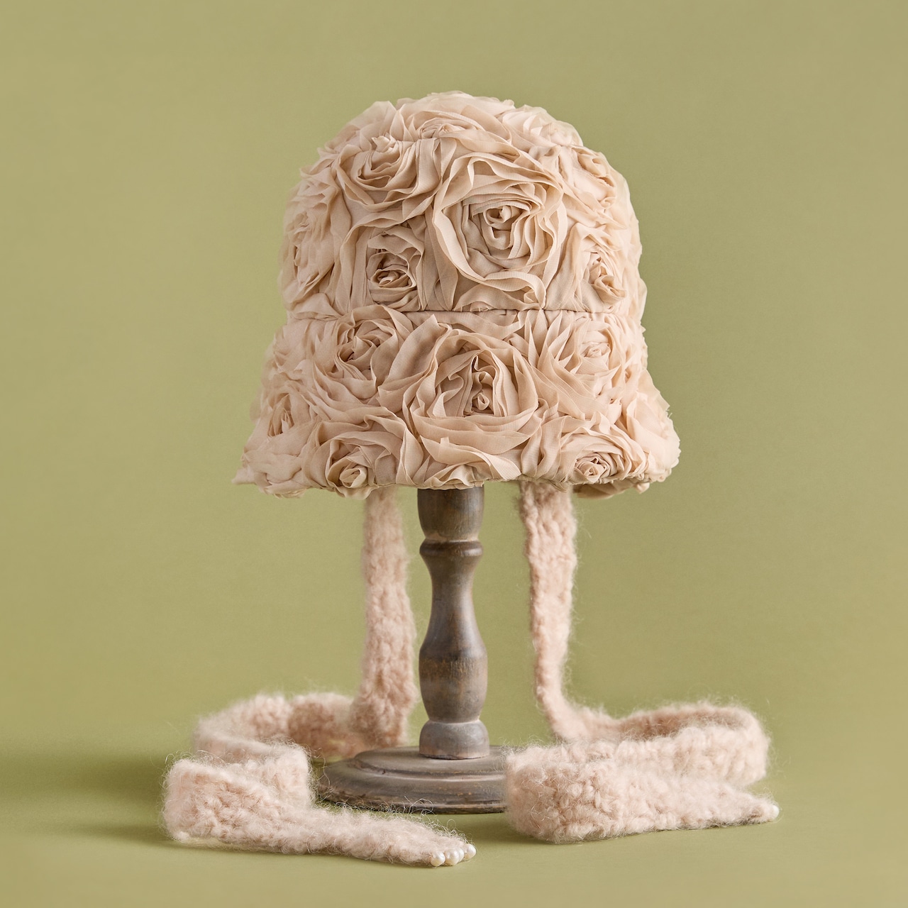手編みのマフラーを思わせる、可愛らしいボリュームのある顎紐。モヘア毛糸で手編みしています。顎紐の先端には天然パールをあしらい、上品な優しさをプラス(ループ式で容易に取り外し可能。帽子本体にリボンとして巻いても可愛らしくアレンジできます)。