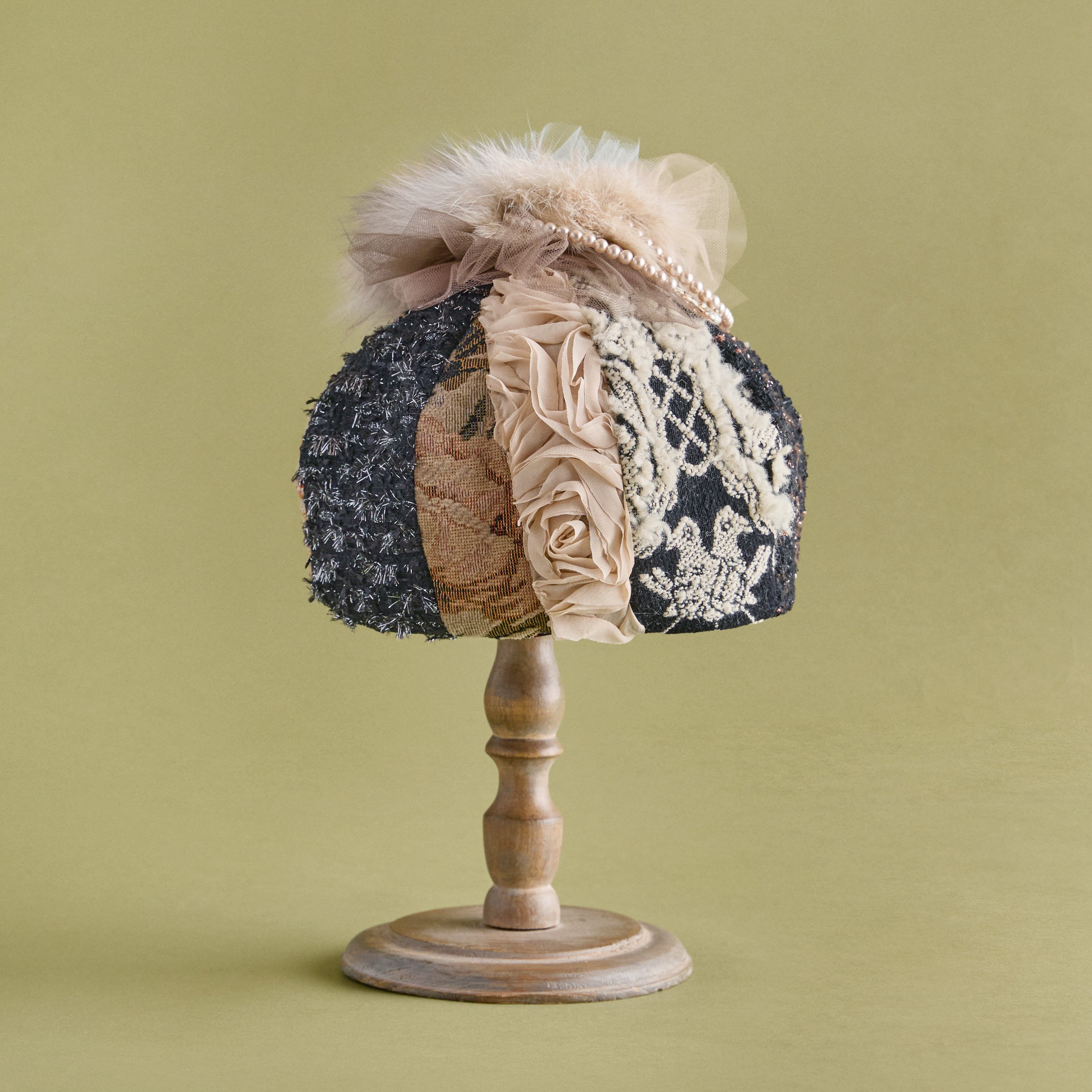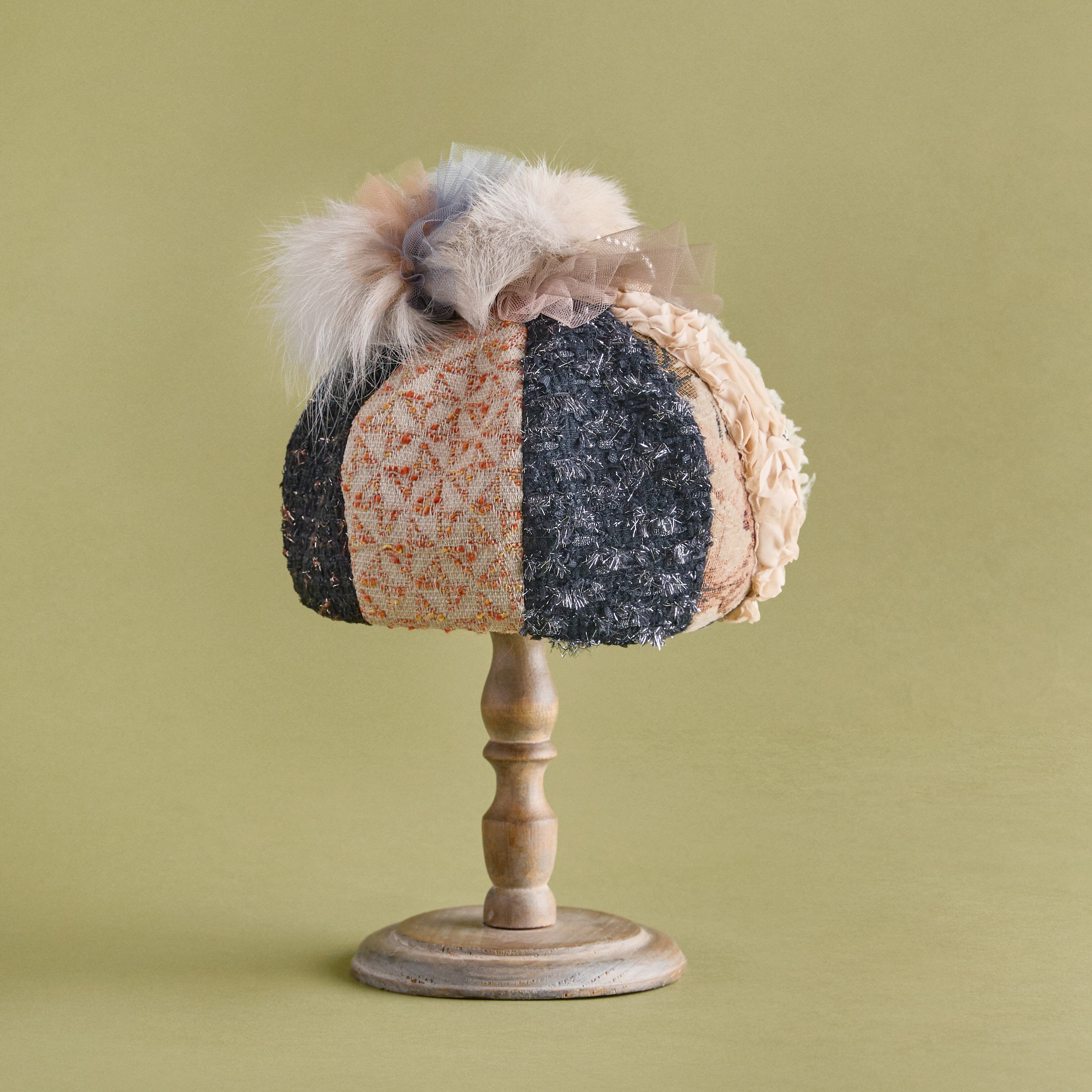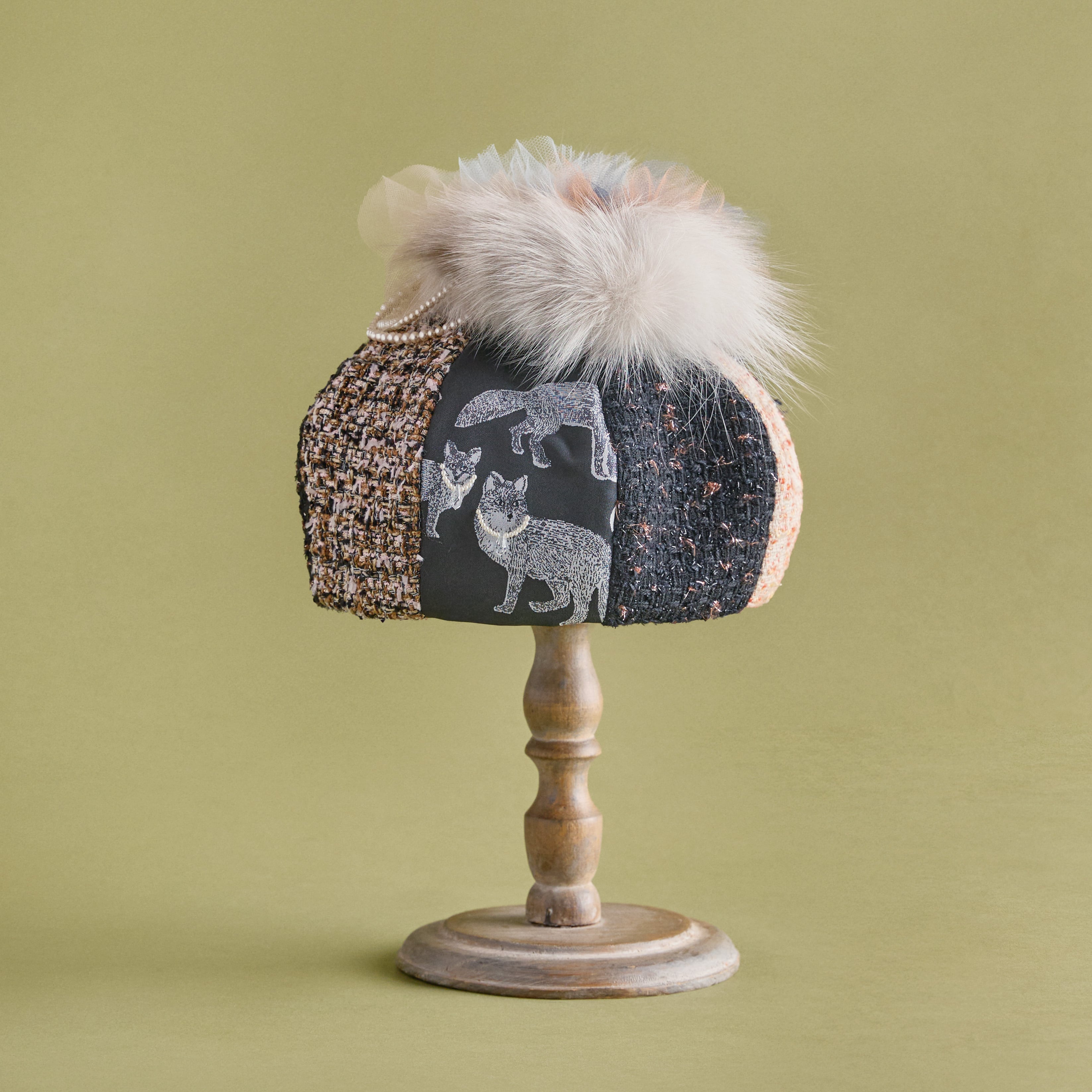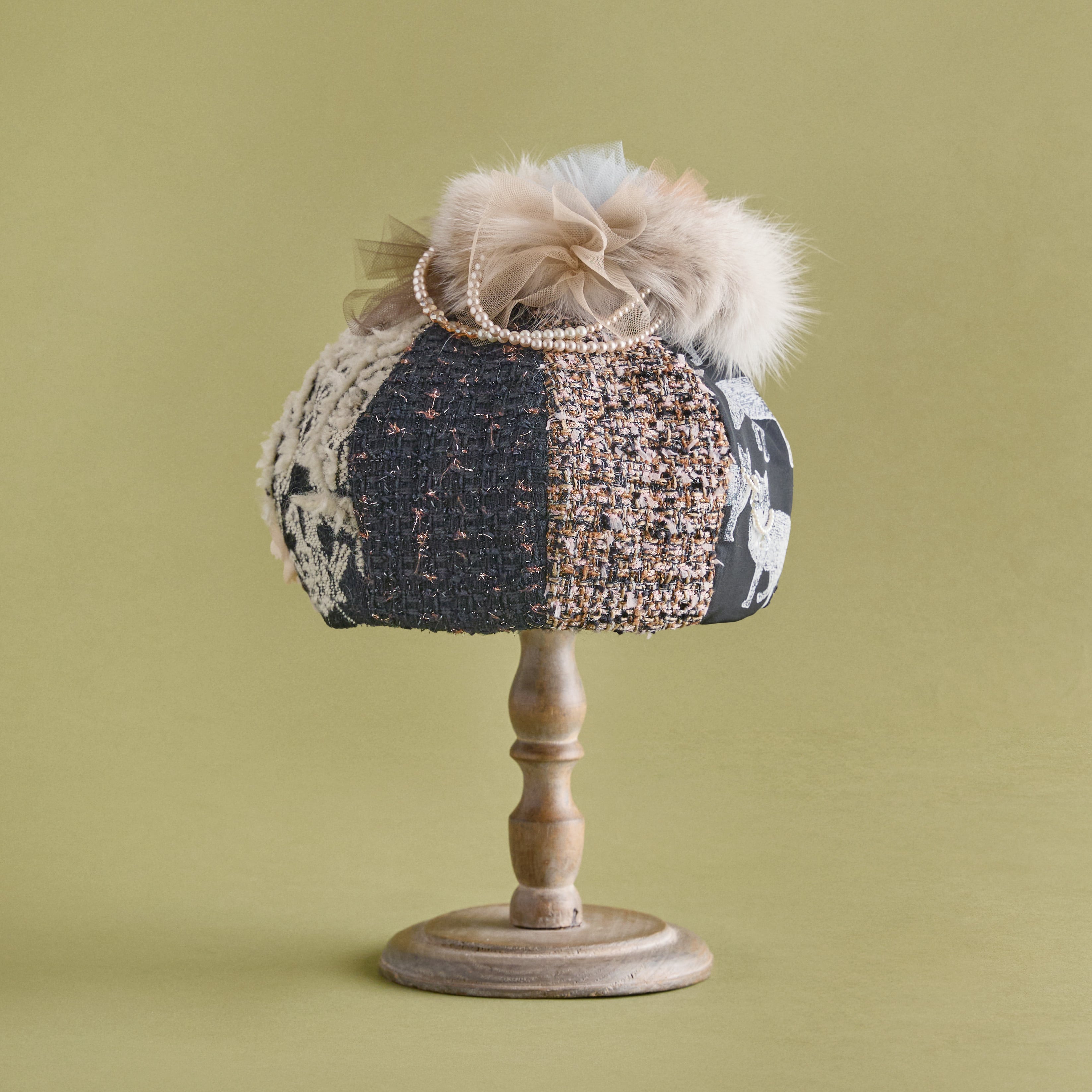 生地は1枚ずつ吟味して選び、合計8種類を表地に使用しています。天井にはパール飾り付きのドームポンポンブローチを配置(ブローチ式で取り外し可能。帽子だけでなく、コートの胸元などに添えてお楽しみいただけます。)チュールフリル、パール、2種類の毛皮をあしらい、華やかさをプラス。