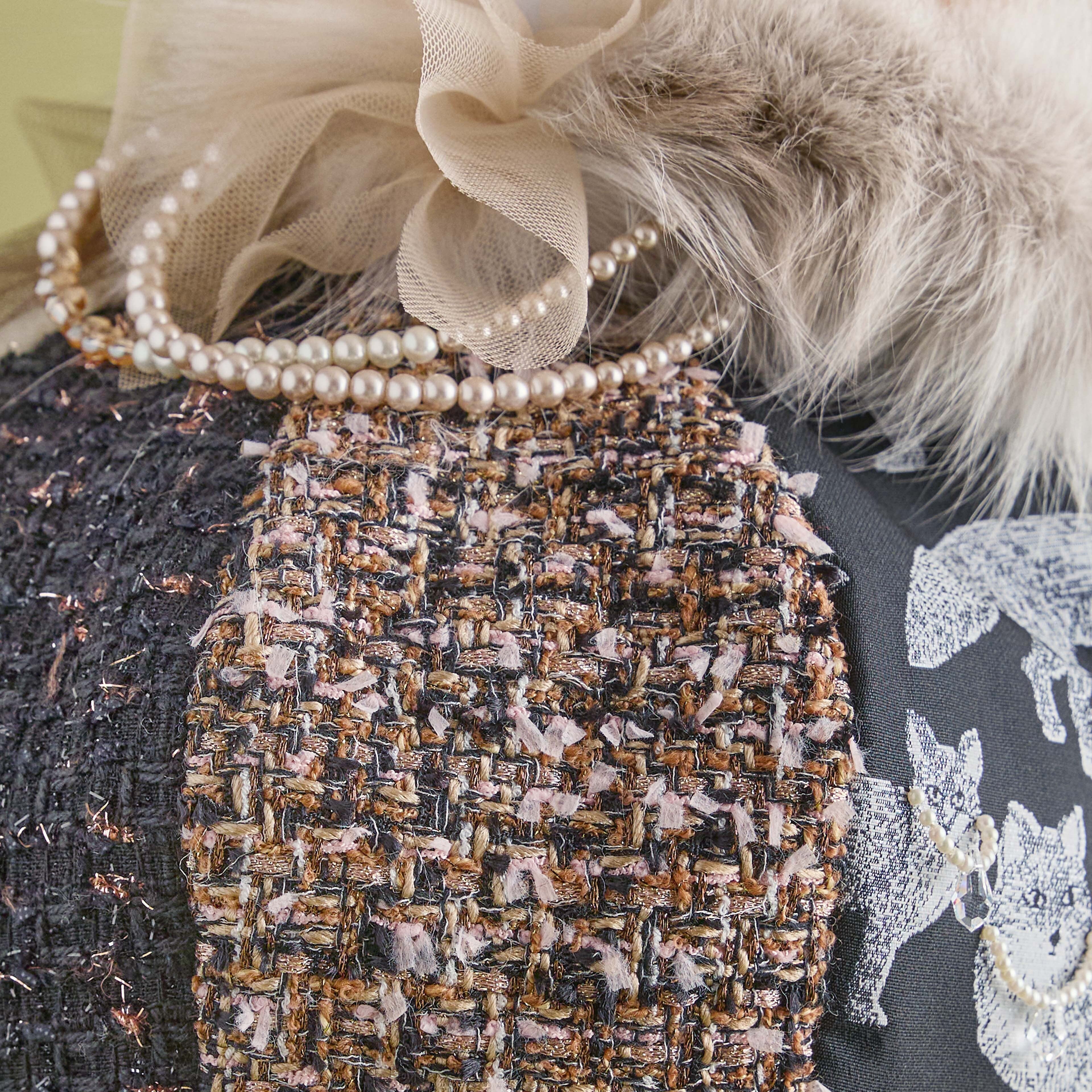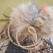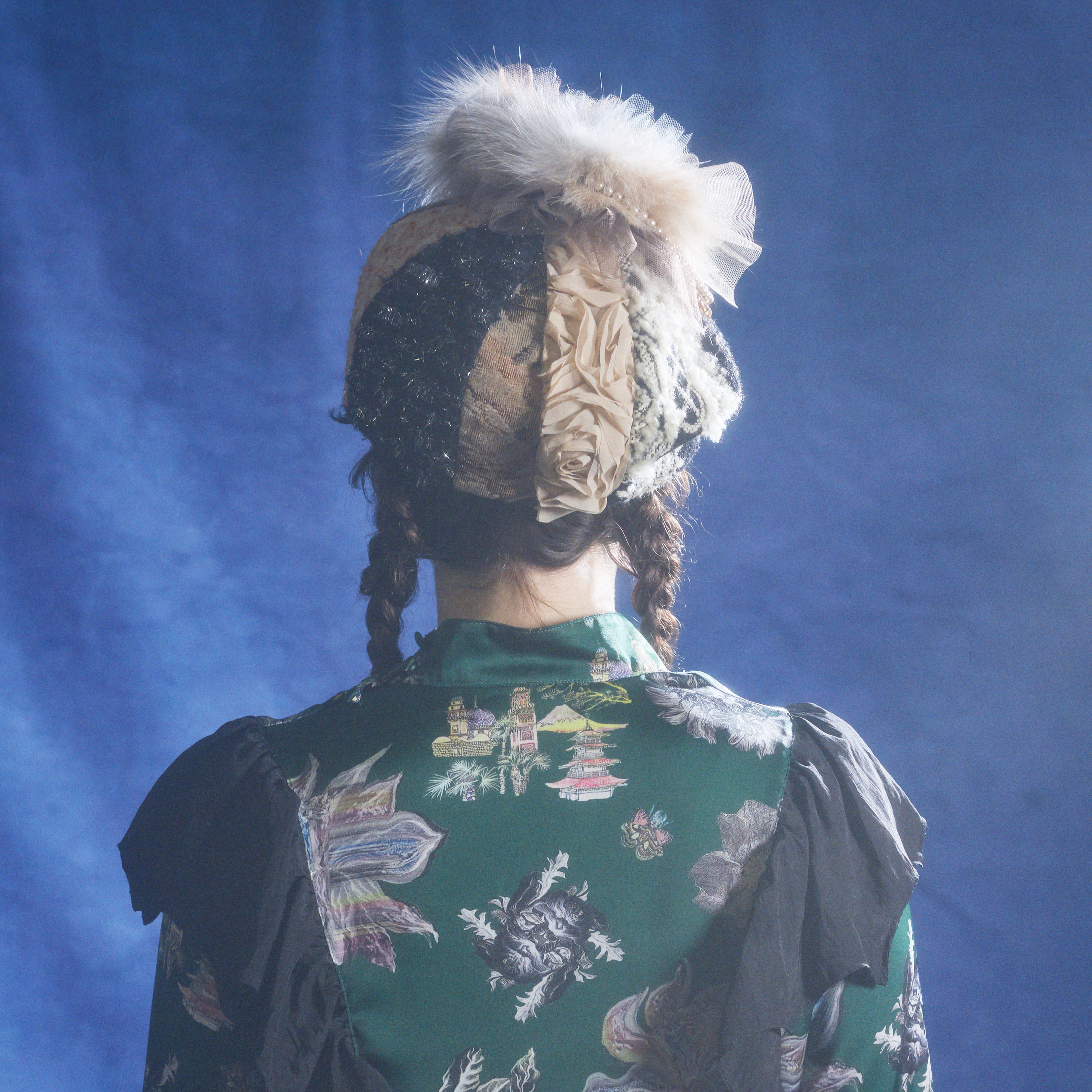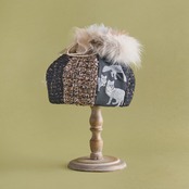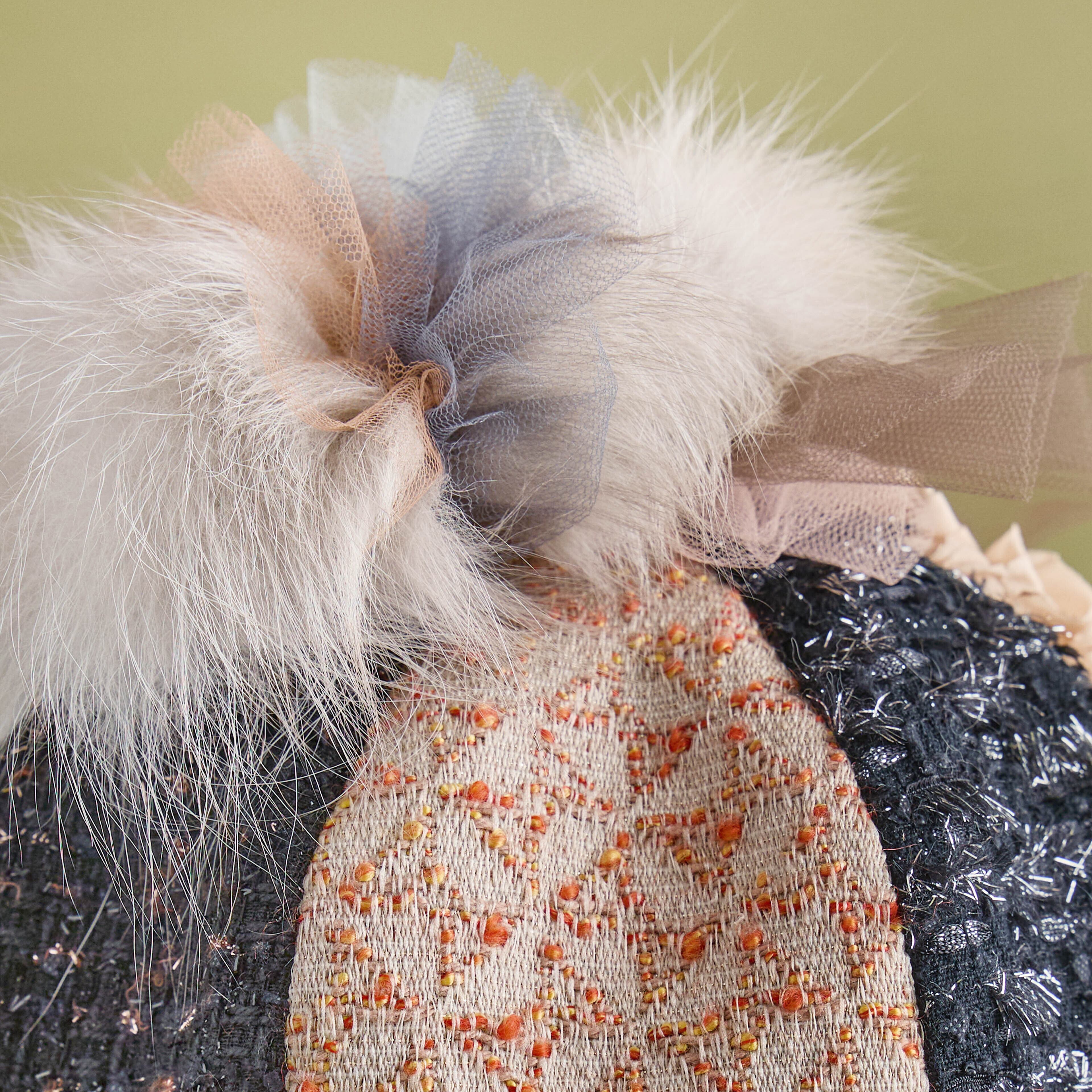 生地は1枚ずつ吟味して選び、合計8種類を表地に使用しています。天井にはパール飾り付きのドームポンポンブローチを配置(ブローチ式で取り外し可能。帽子だけでなく、コートの胸元などに添えてお楽しみいただけます。)チュールフリル、パール、2種類の毛皮をあしらい、華やかさをプラス。