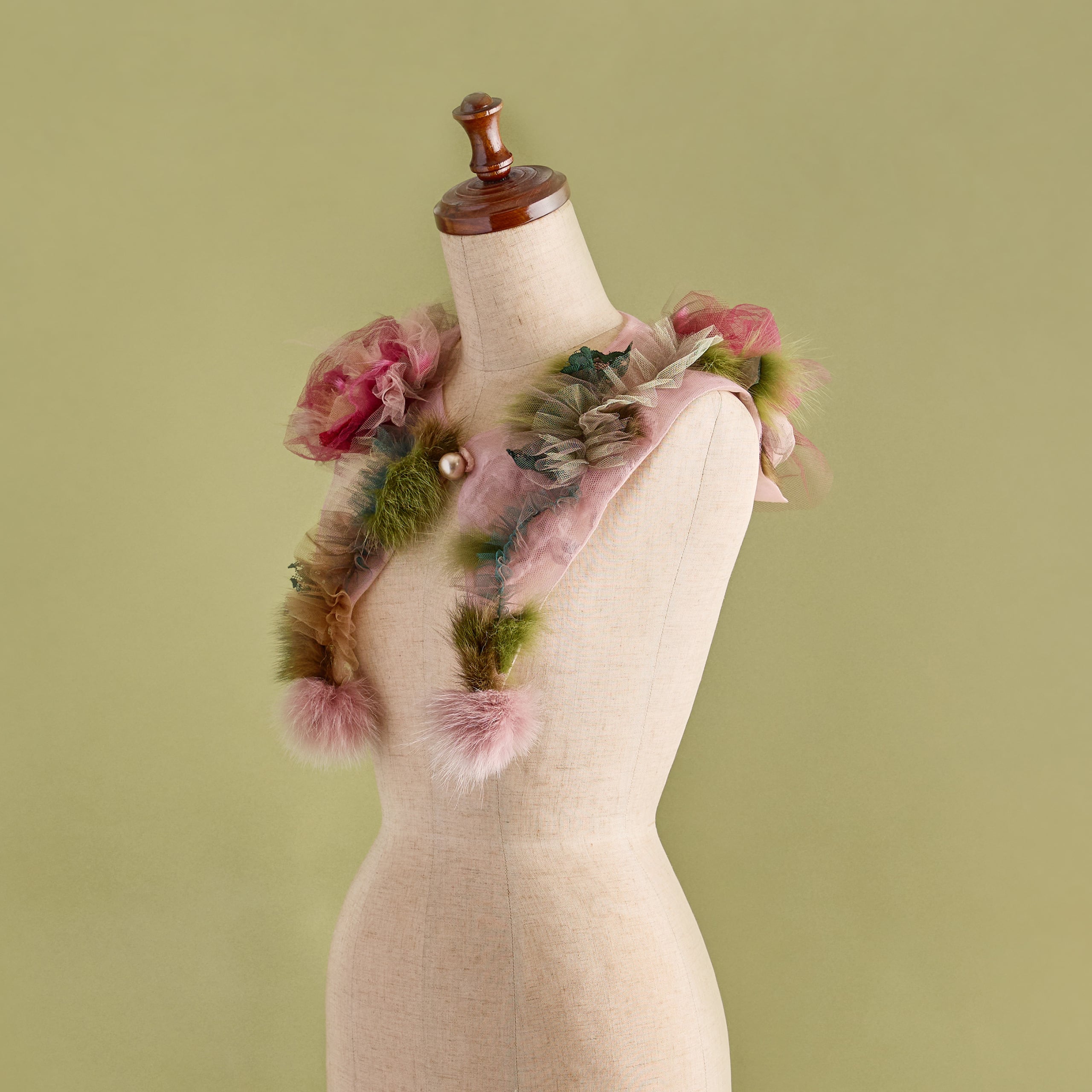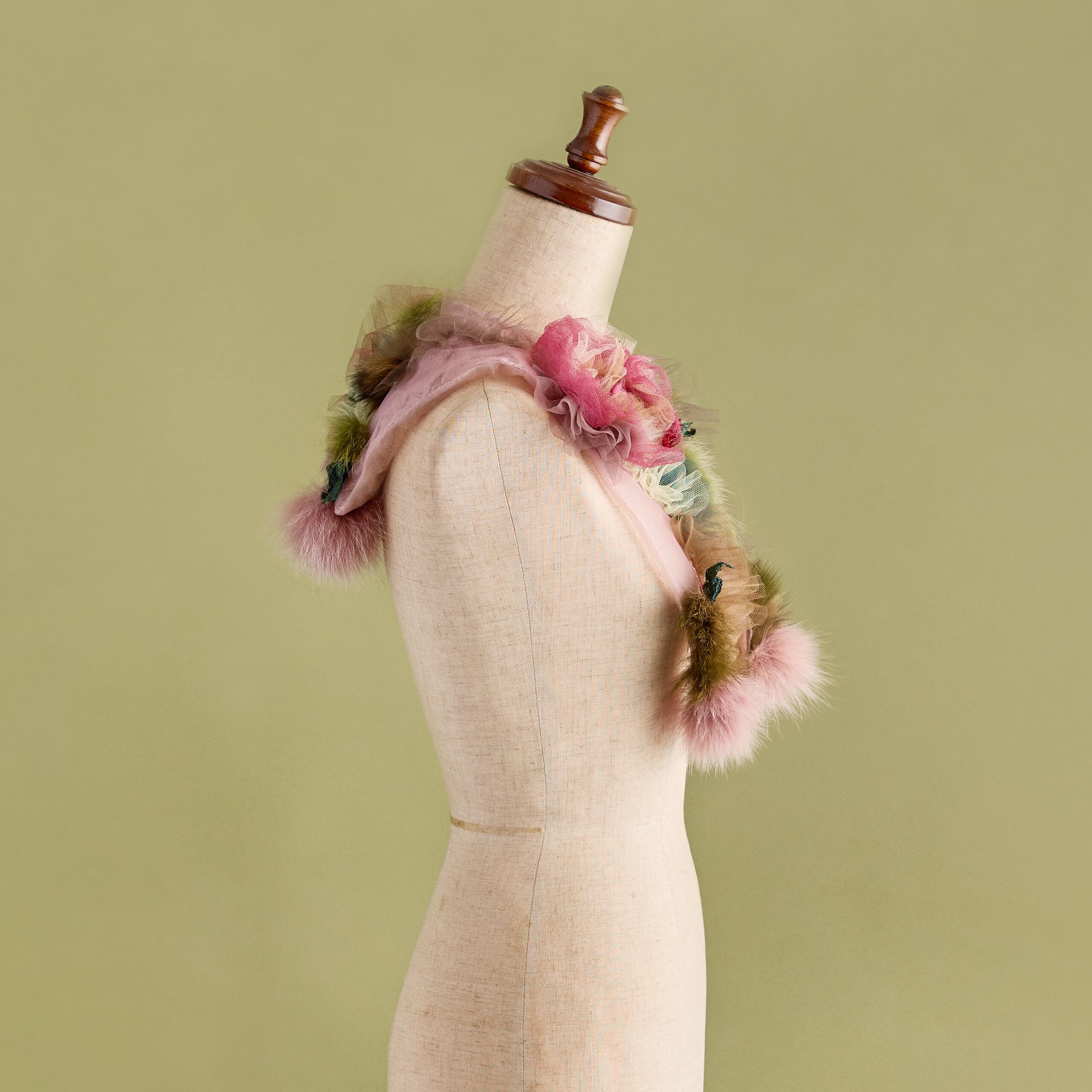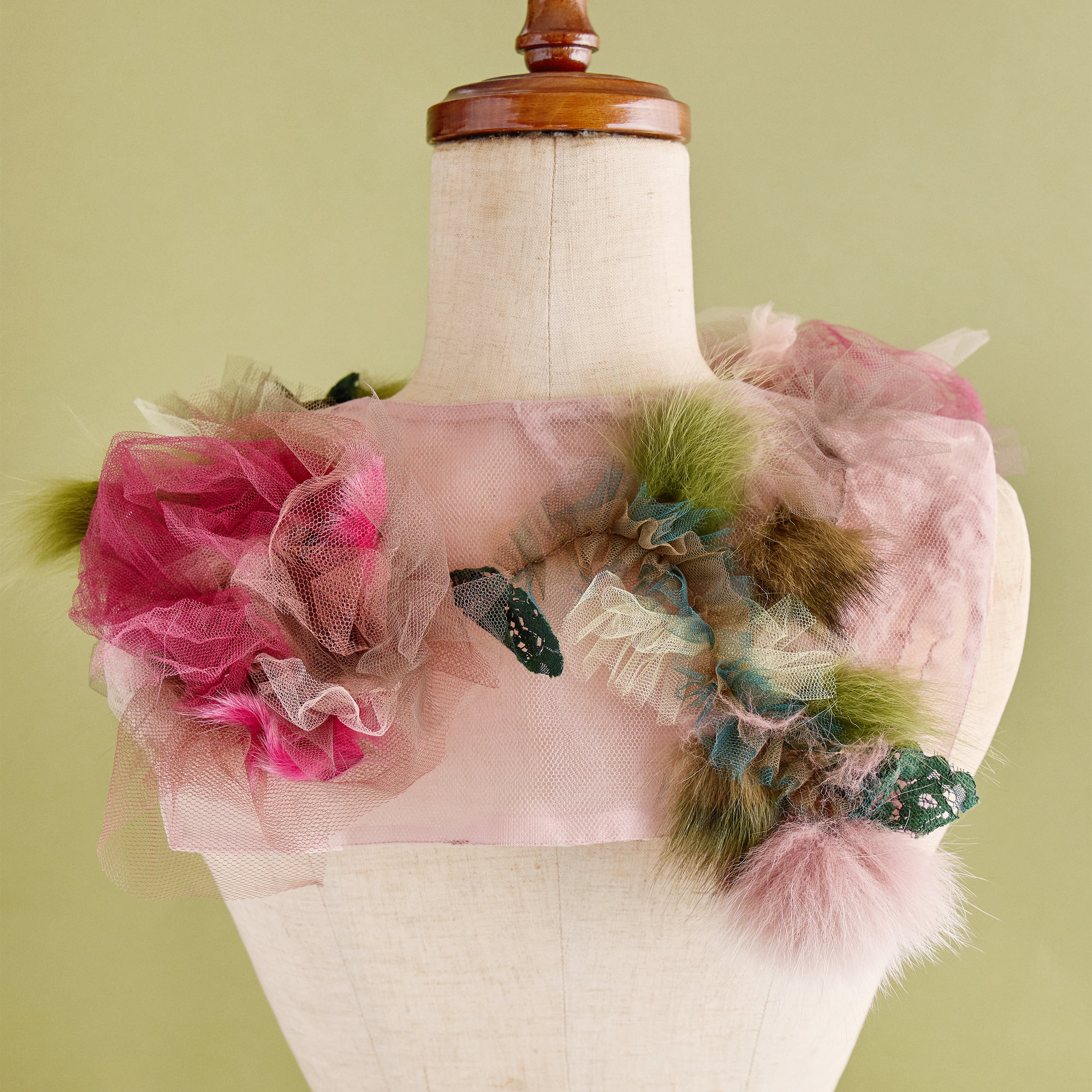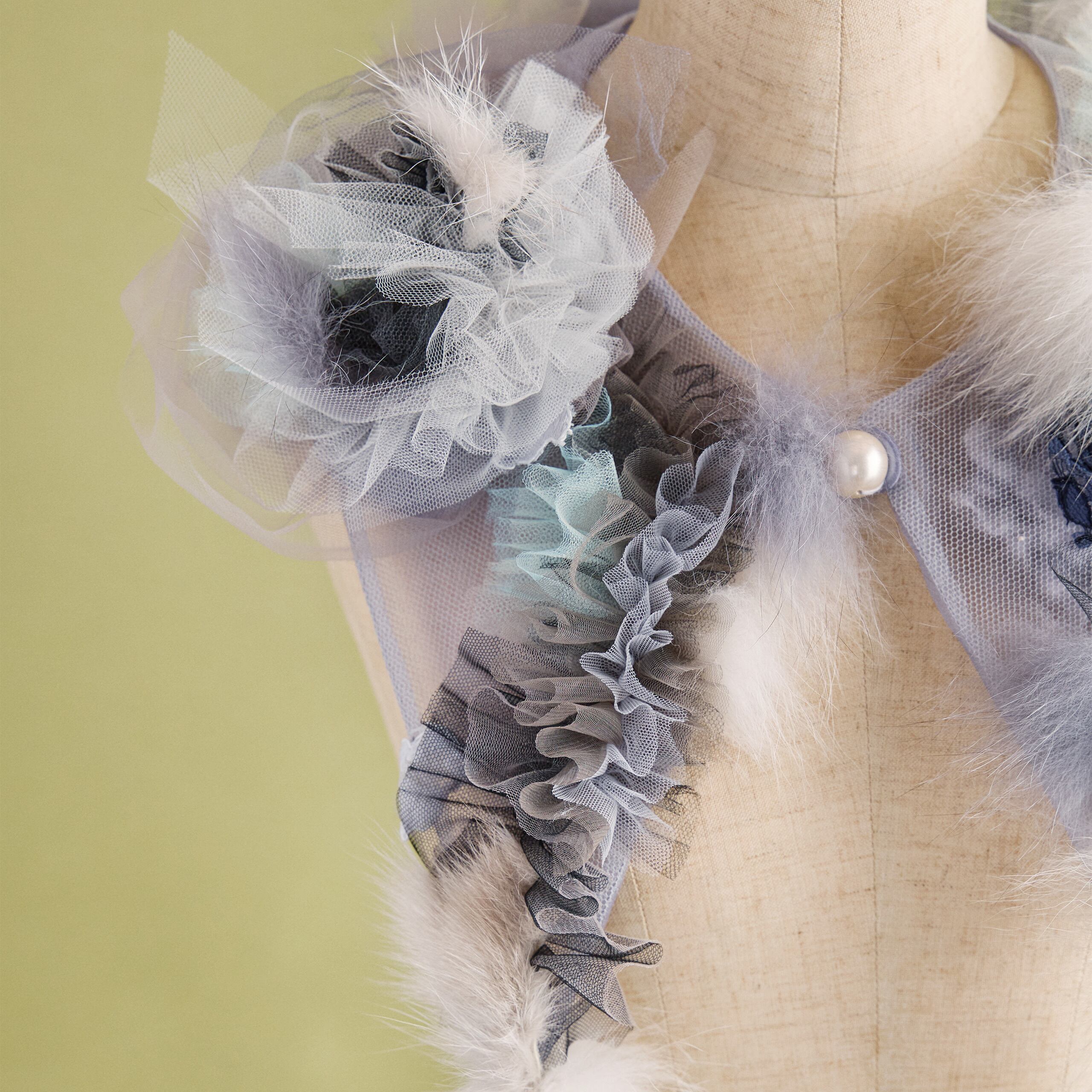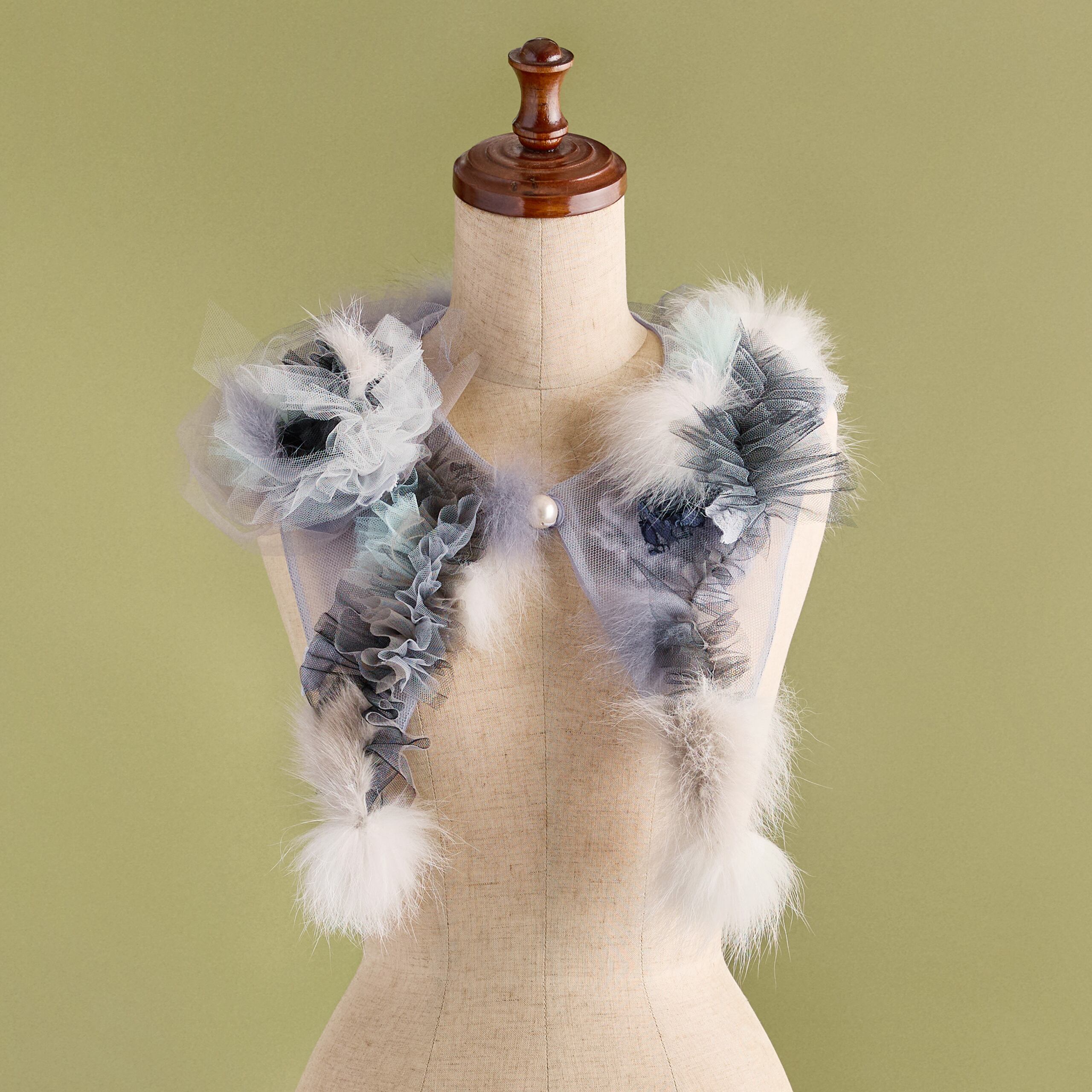 村には美しい森があり、芳しい薔薇の花が咲き、人々は景色と調和した独自の装いを楽しんでいる──。そんな物語からインスピレーションを受けました。大粒パールを1粒使用し、容易に着脱可能。表面はチュール、裏面はなめらかなオーガンジー仕立てにすることで、素肌に触れてもチクチクせず快適にご使用いただけます。さらに透ける襟の中にモヘア糸を這わせ、冬の装いに寄り添う小さな工夫を施しました。幻想的なムードを添える、特別な一枚です。