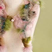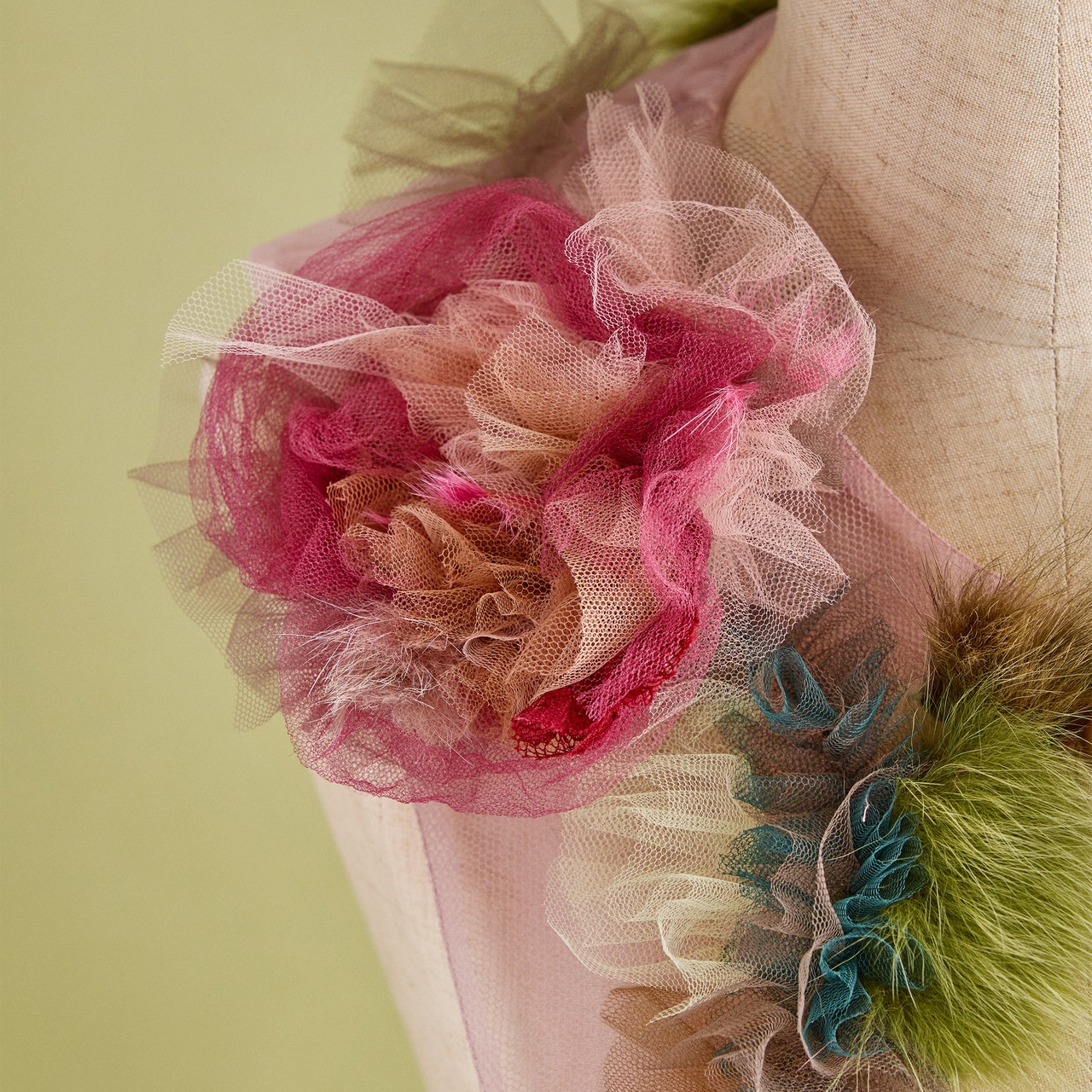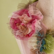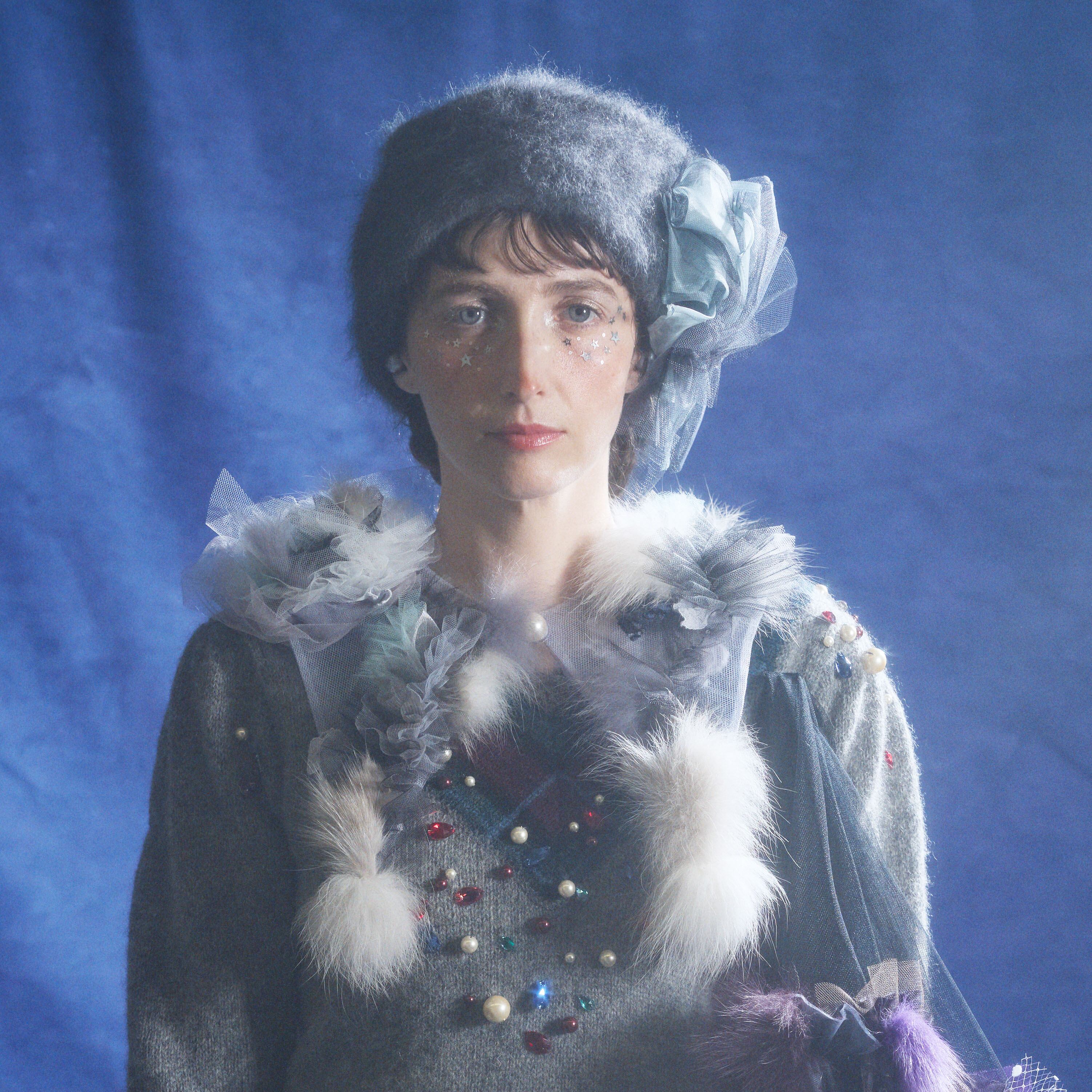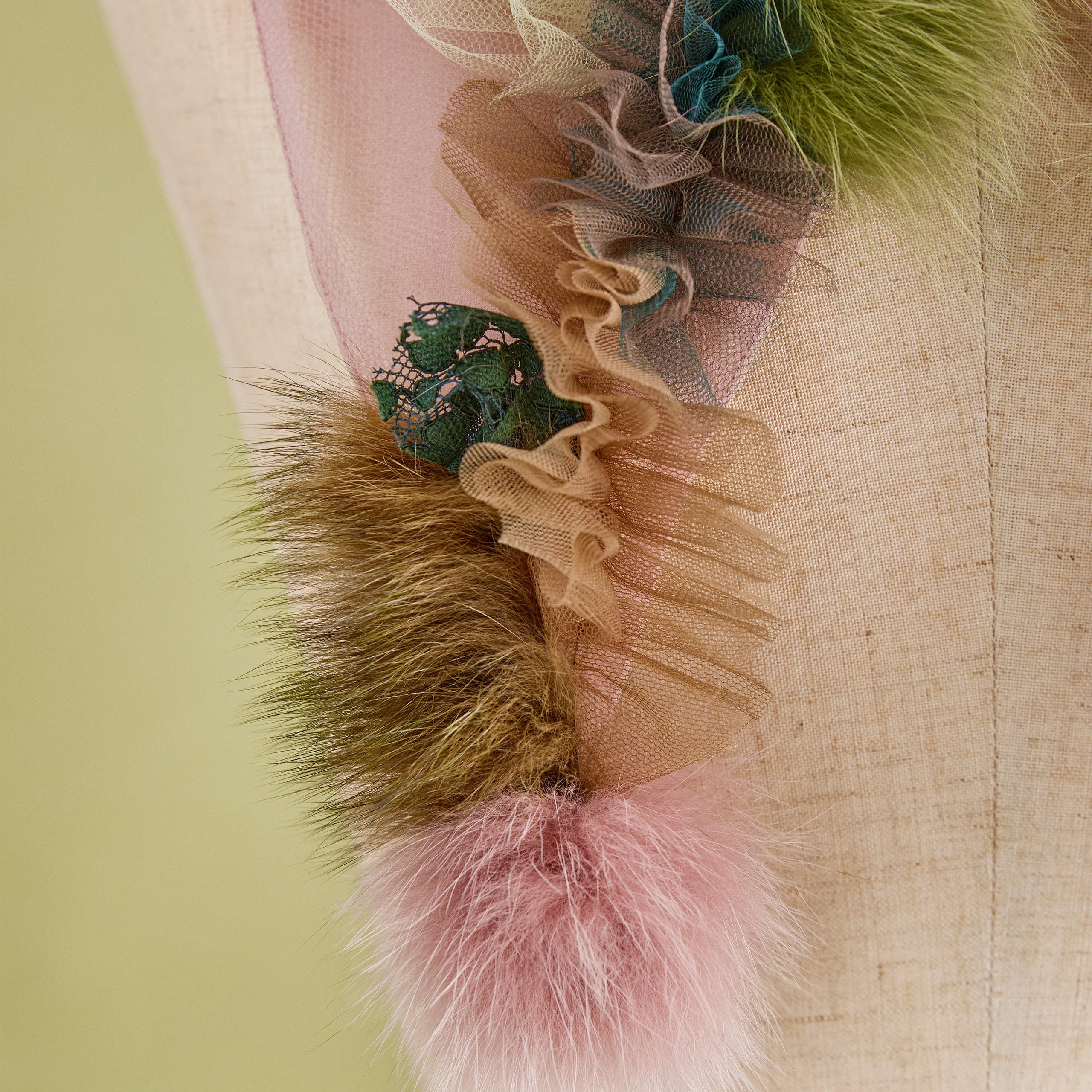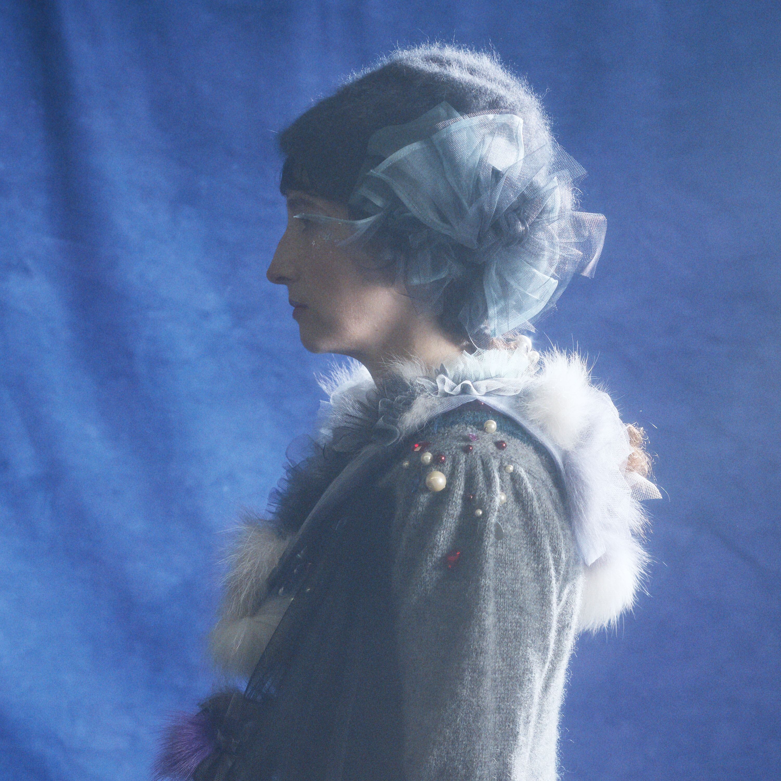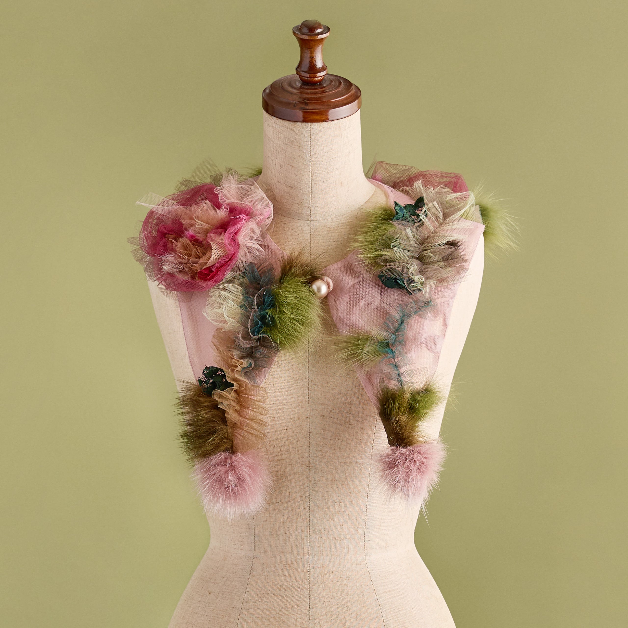 村には美しい森があり、芳しい薔薇の花が咲き、人々は景色と調和した独自の装いを楽しんでいる──。そんな物語からインスピレーションを受けました。大粒パールを1粒使用し、容易に着脱可能。表面はチュール、裏面はなめらかなオーガンジー仕立てにすることで、素肌に触れてもチクチクせず快適にご使用いただけます。さらに透ける襟の中にモヘア糸を這わせ、冬の装いに寄り添う小さな工夫を施しました。幻想的なムードを添える、特別な一枚です。