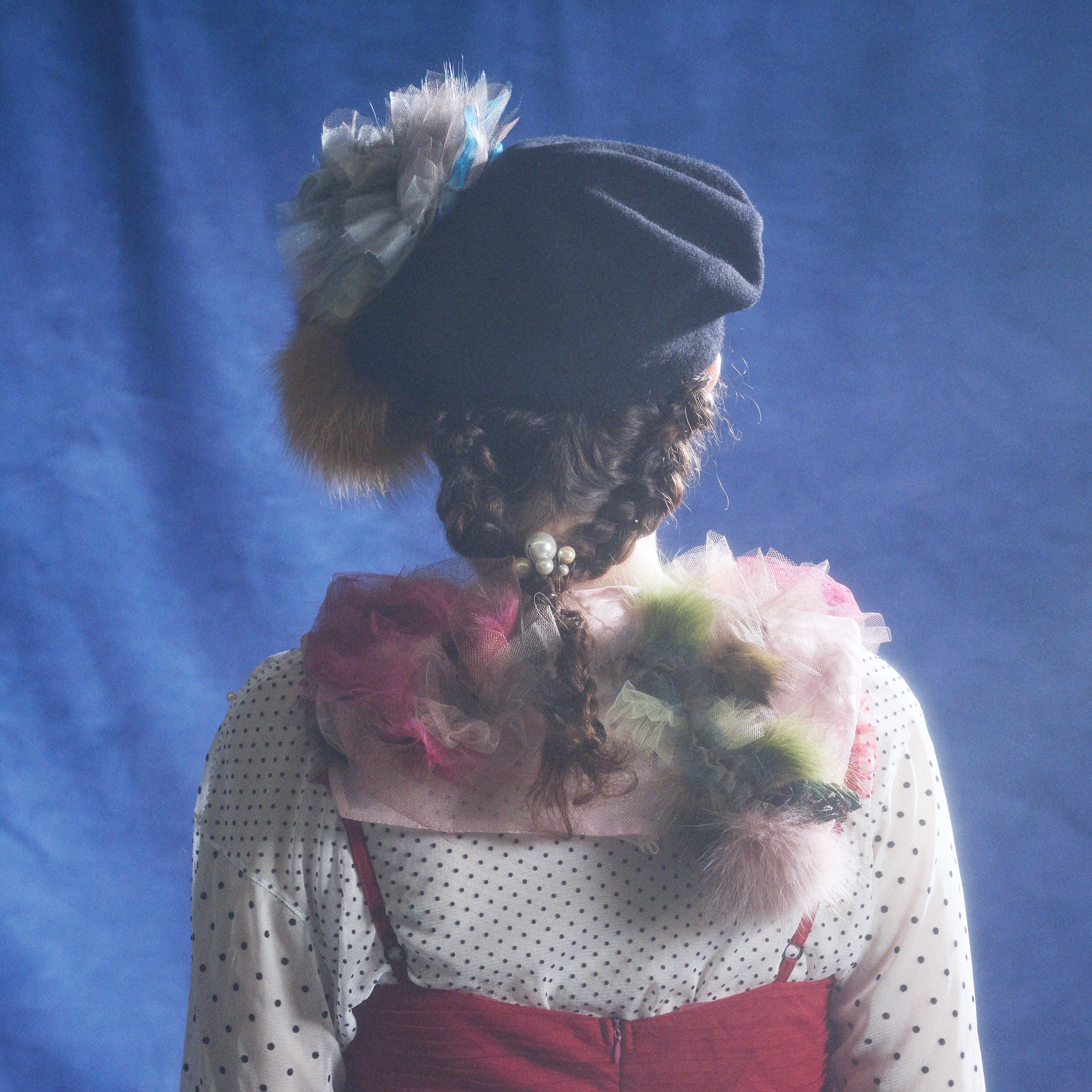 胸元にかかる部分は、サーカスのクラウンを思わせる大きな三角襟。後ろ姿はどこか懐かしさを誘うセーラー襟。どこかの国の小さな村の住人たちが身にまとう、不思議なコスチュームをイメージして生まれた付け襟です。