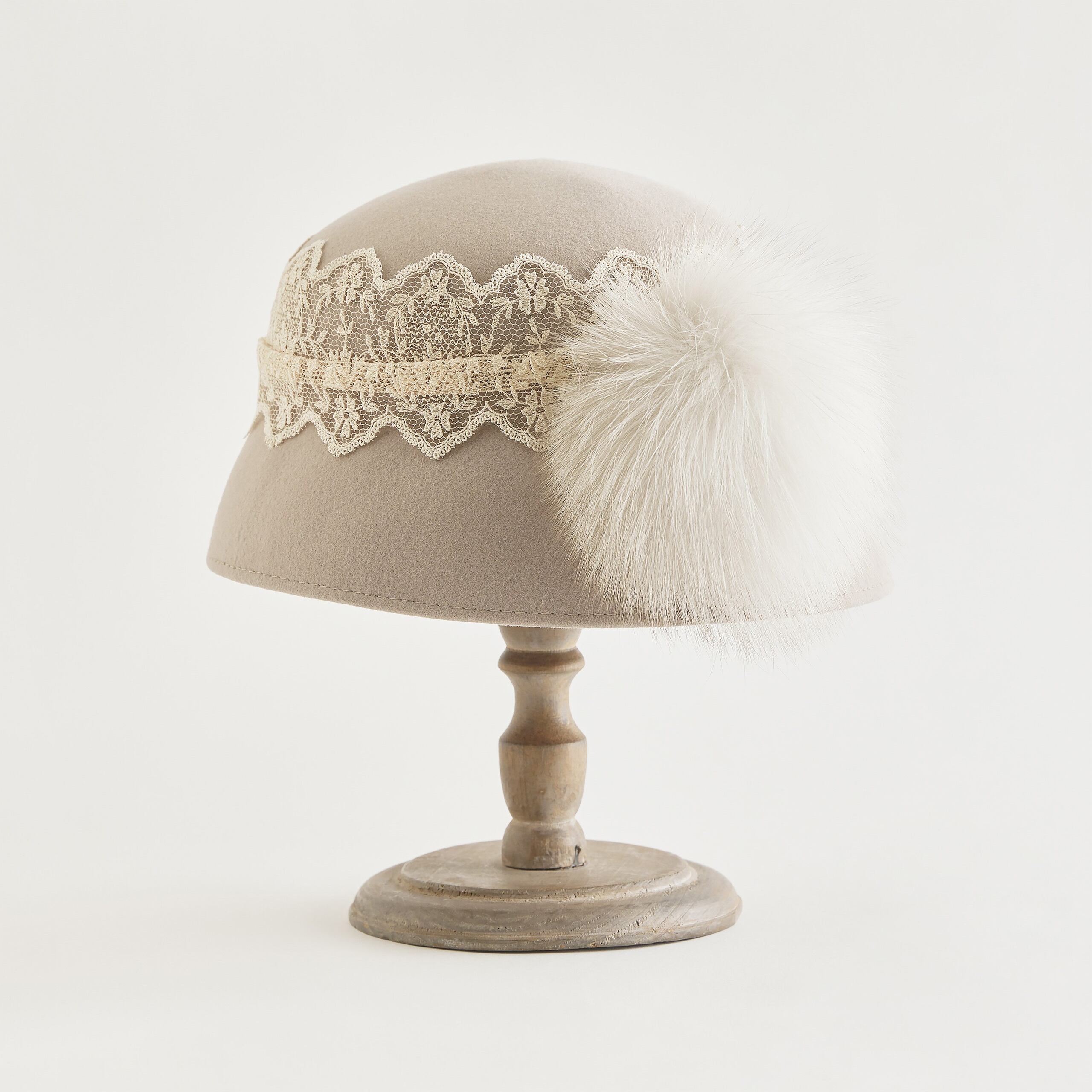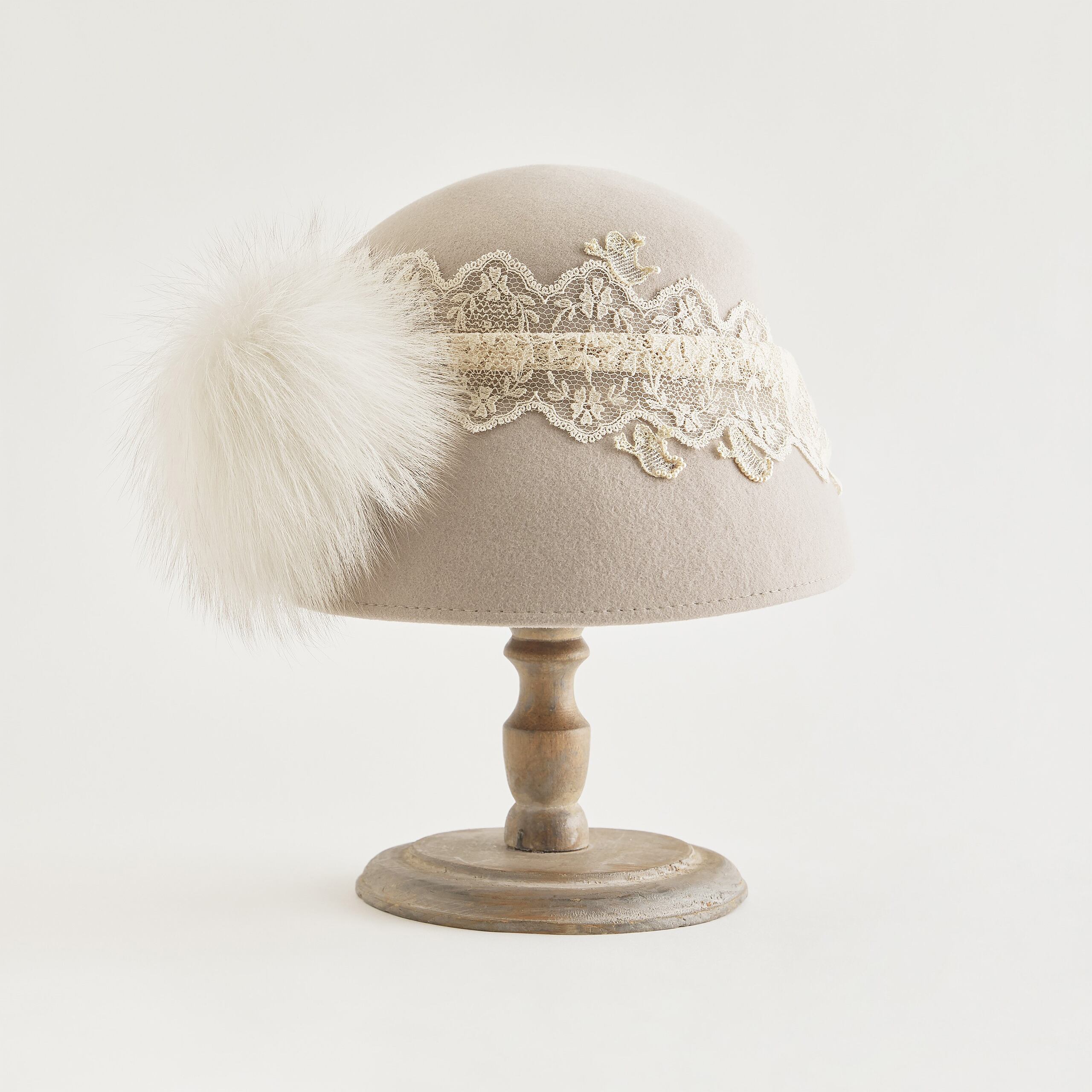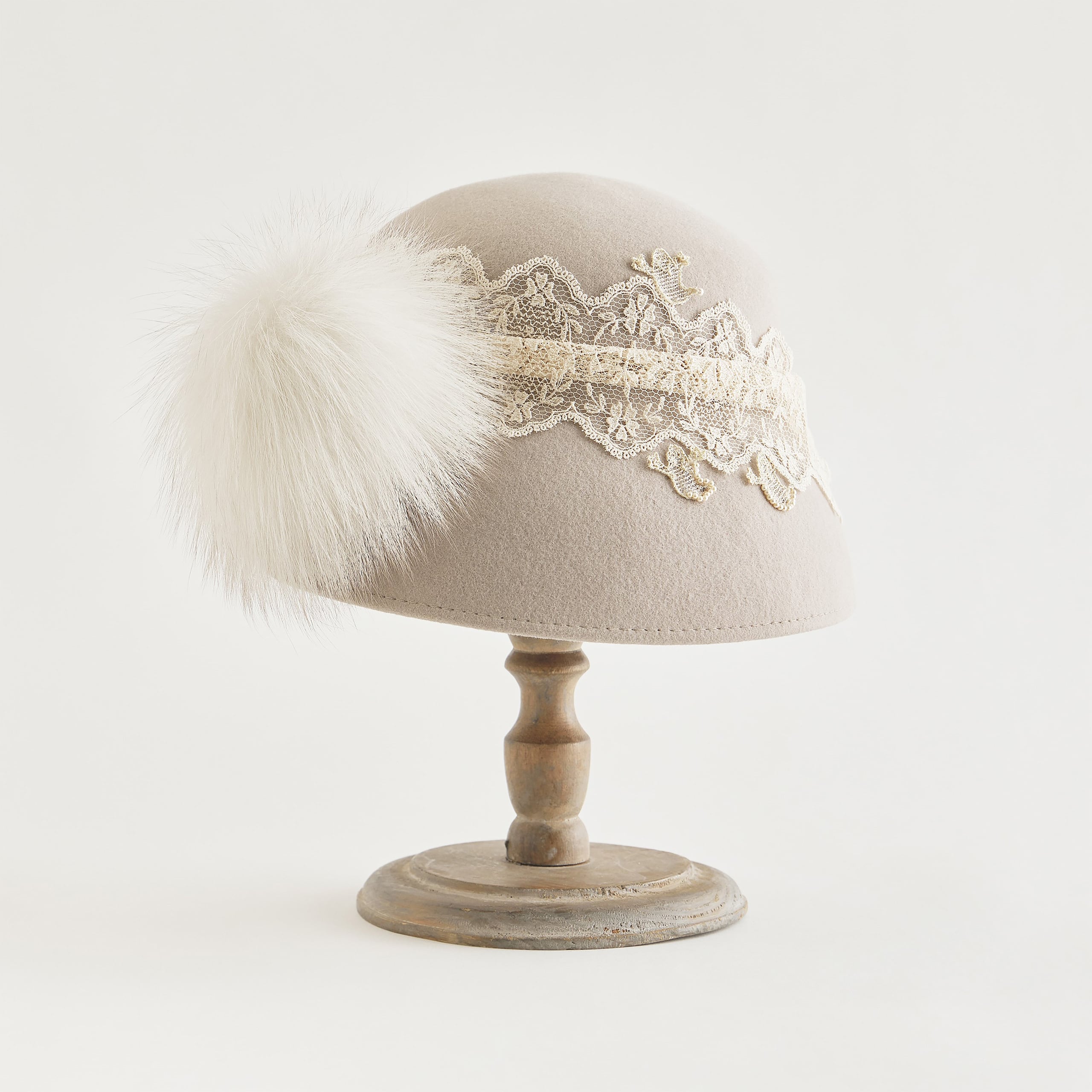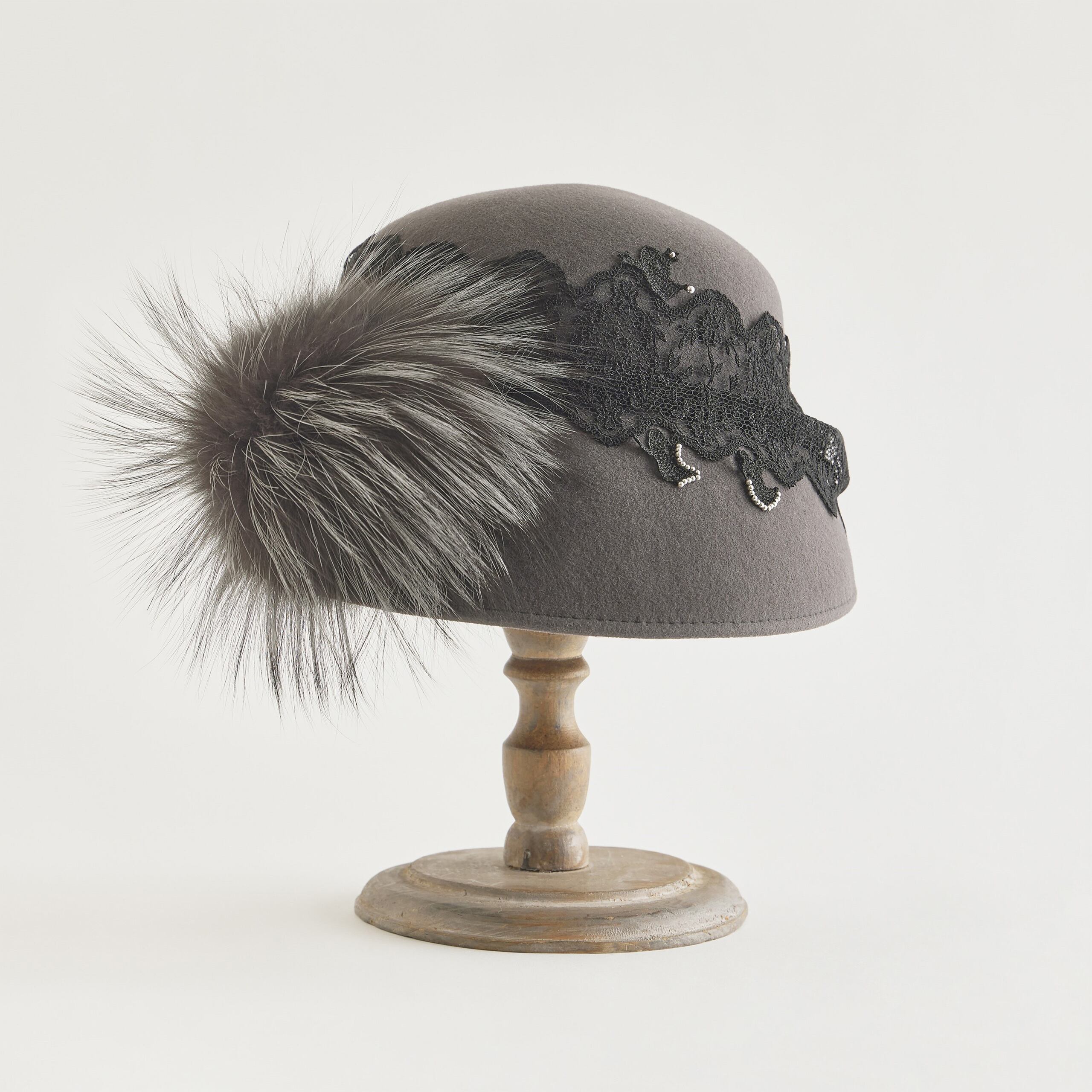 ポンポンは北欧産saga fur。Beigeにはラベンダーフロスト、Charcoalには染色したシルバーフォックス。ともに希少なファーで製作しました。ブローチ式で着脱可能です。
