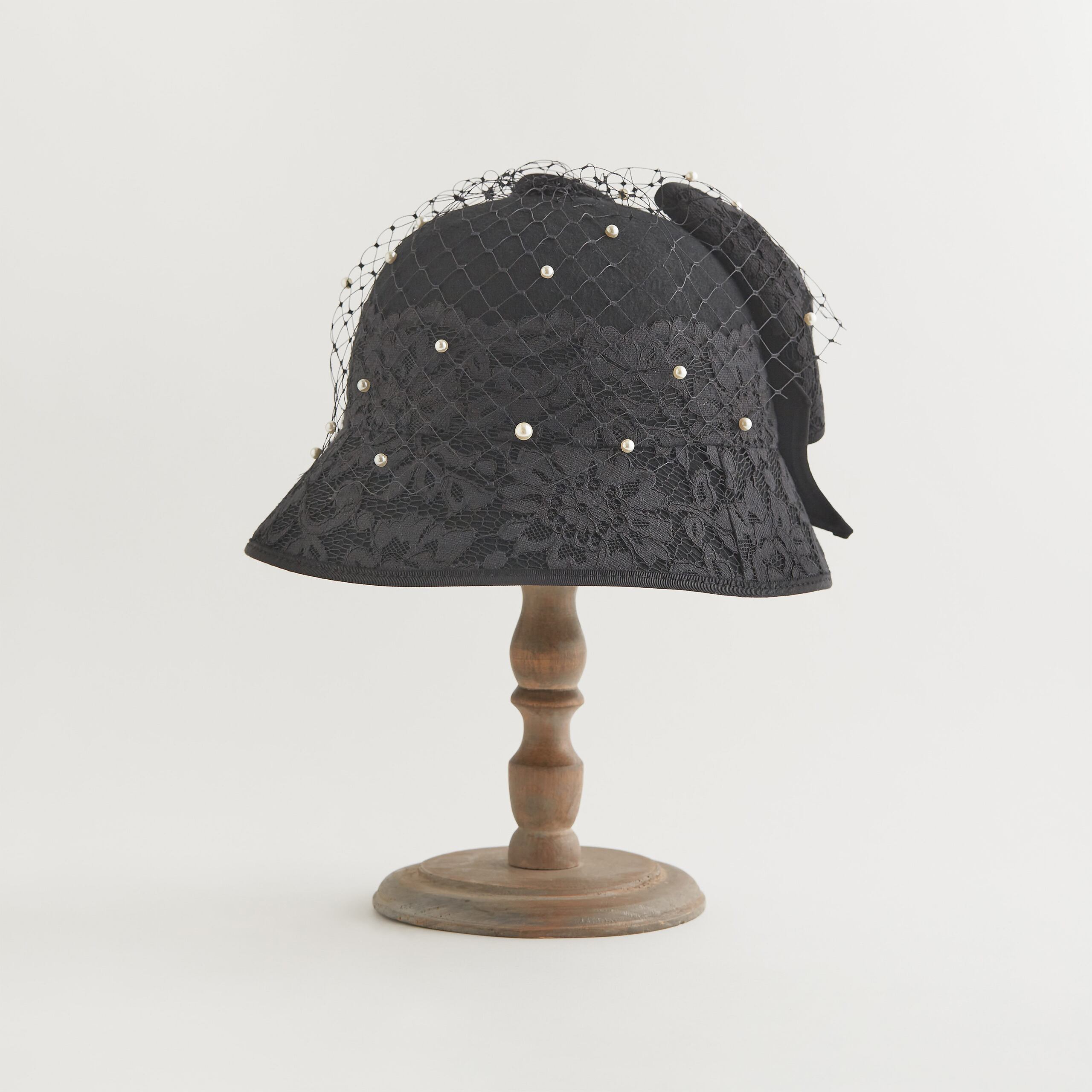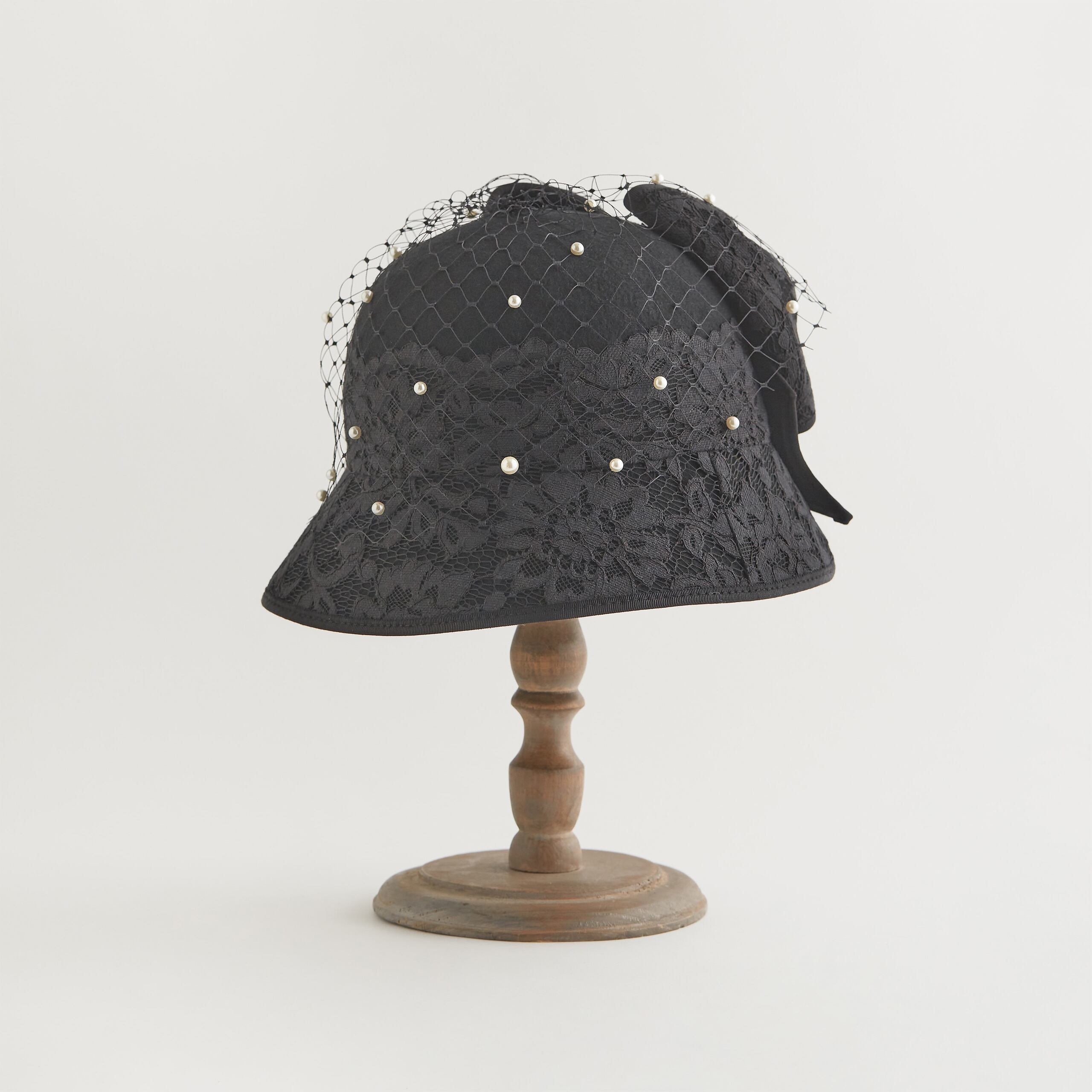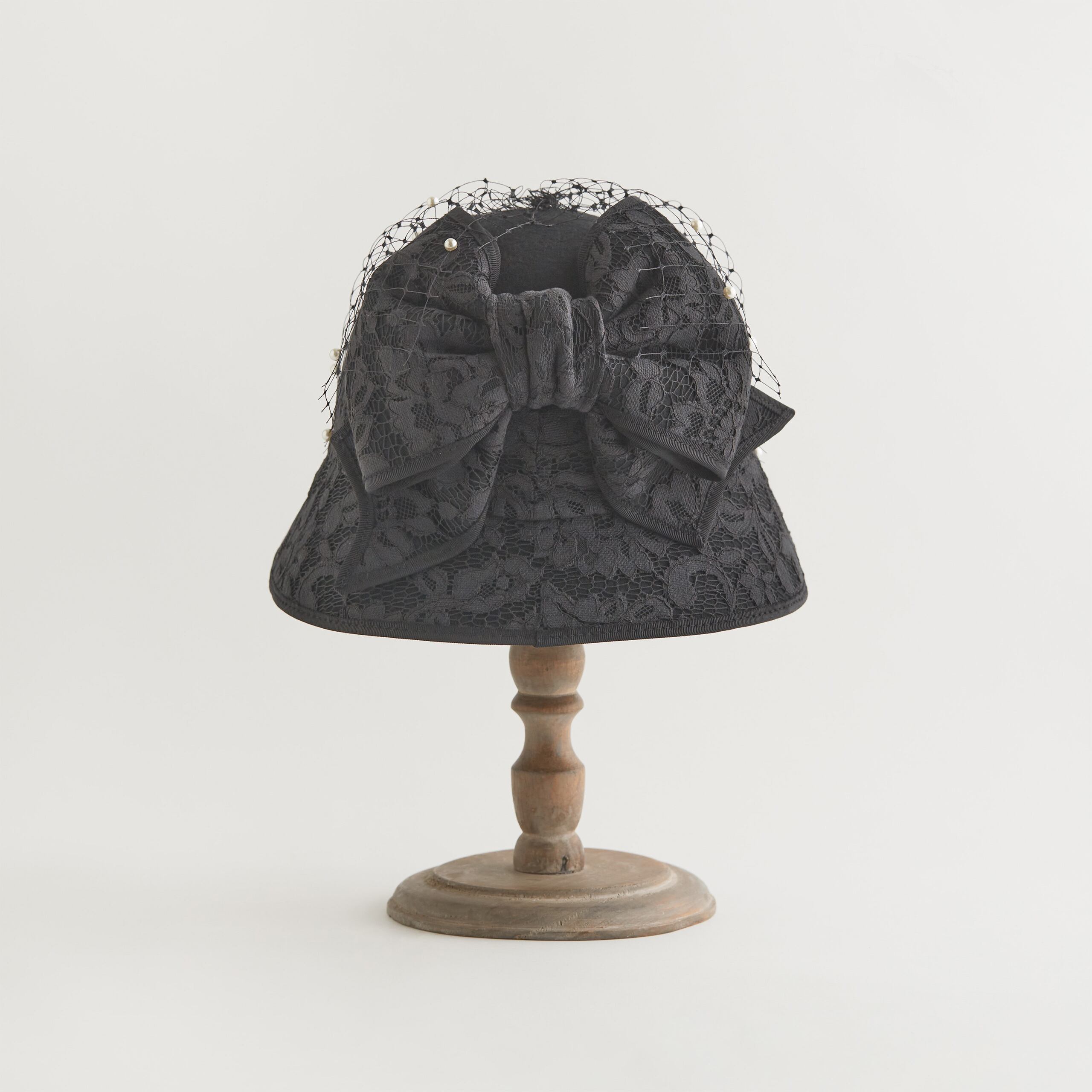 ネットチュールには小さなパールをあしらい、パールが浮遊しているように見せ、帽子本体との間に空間を持たせることによってドラマチックな印象を作り出しました。