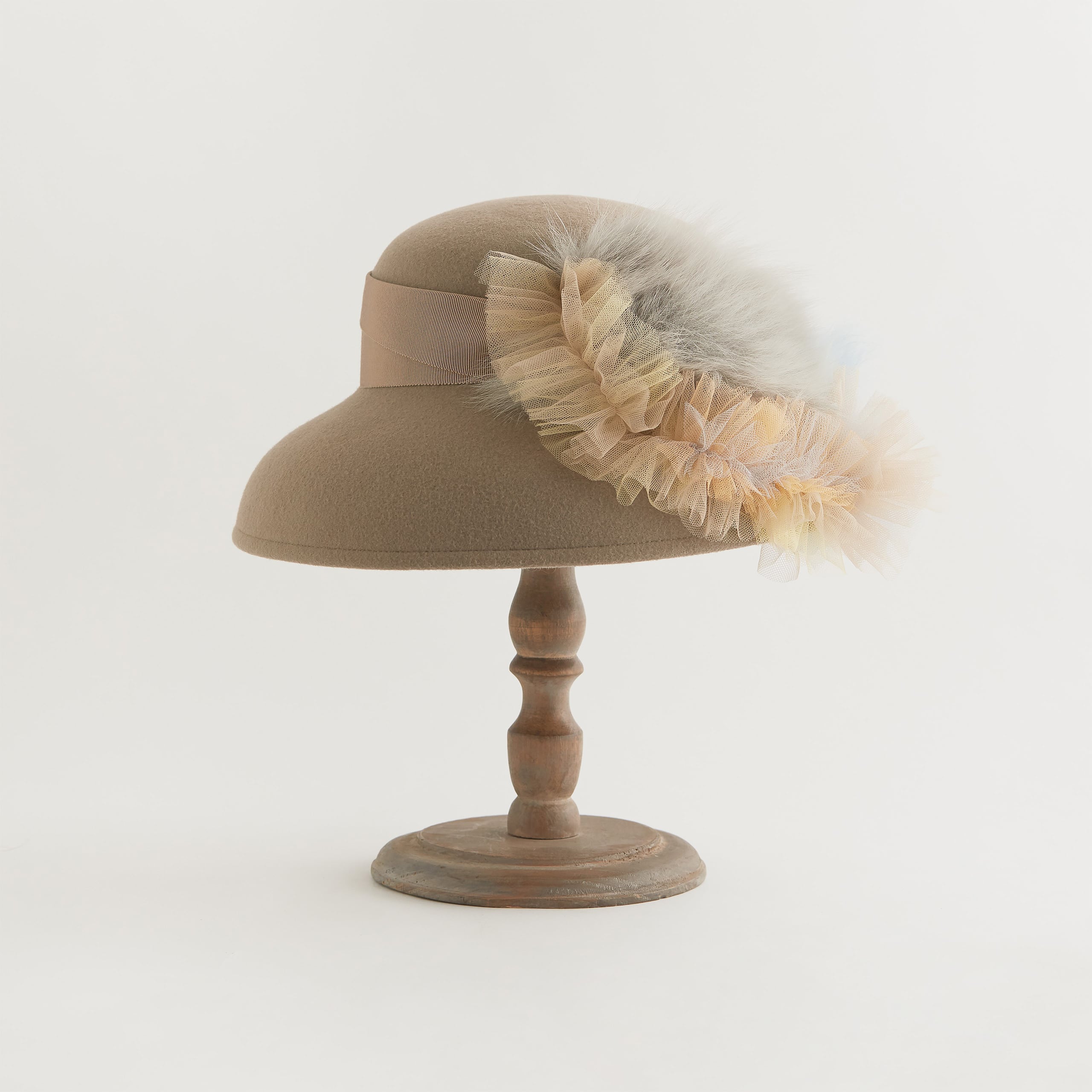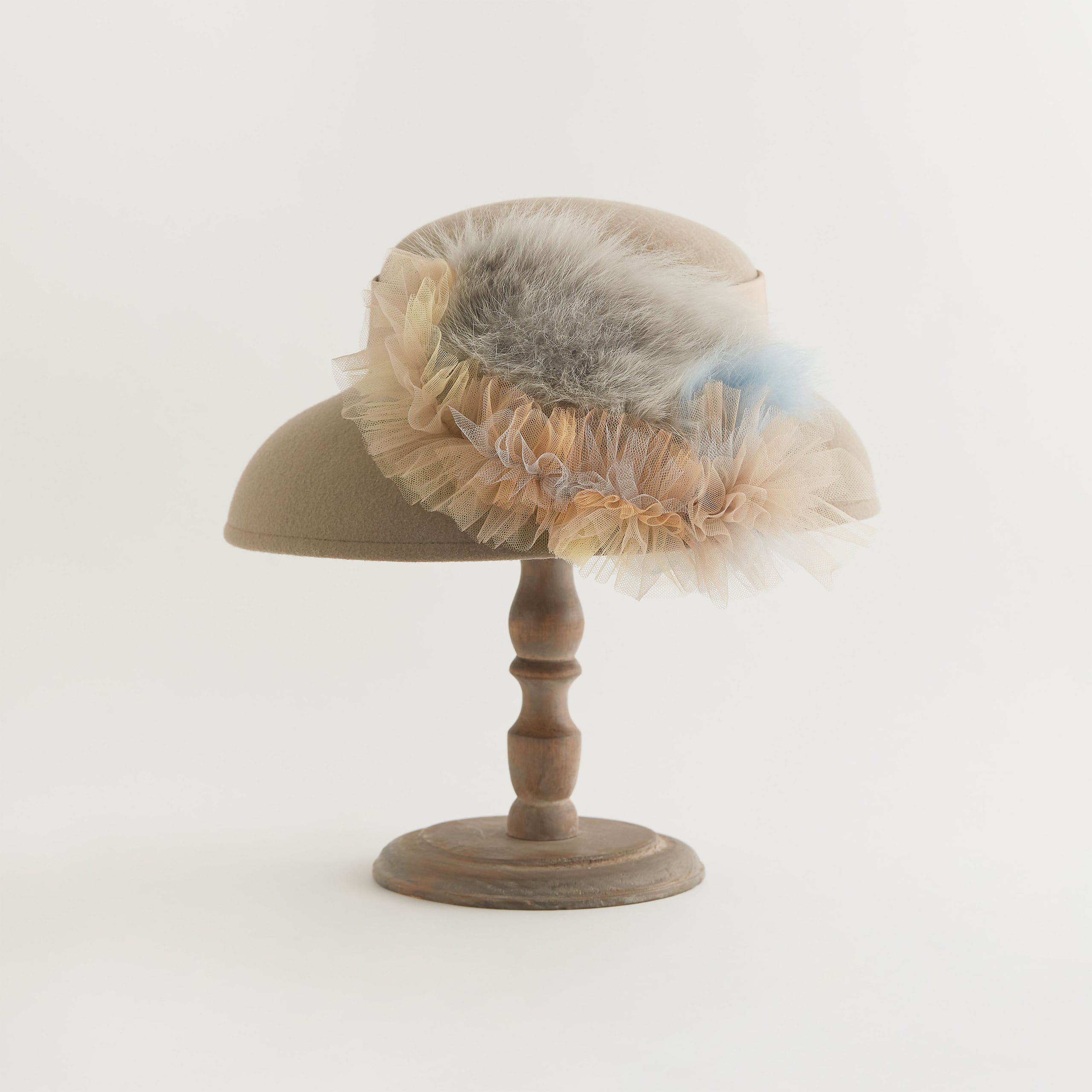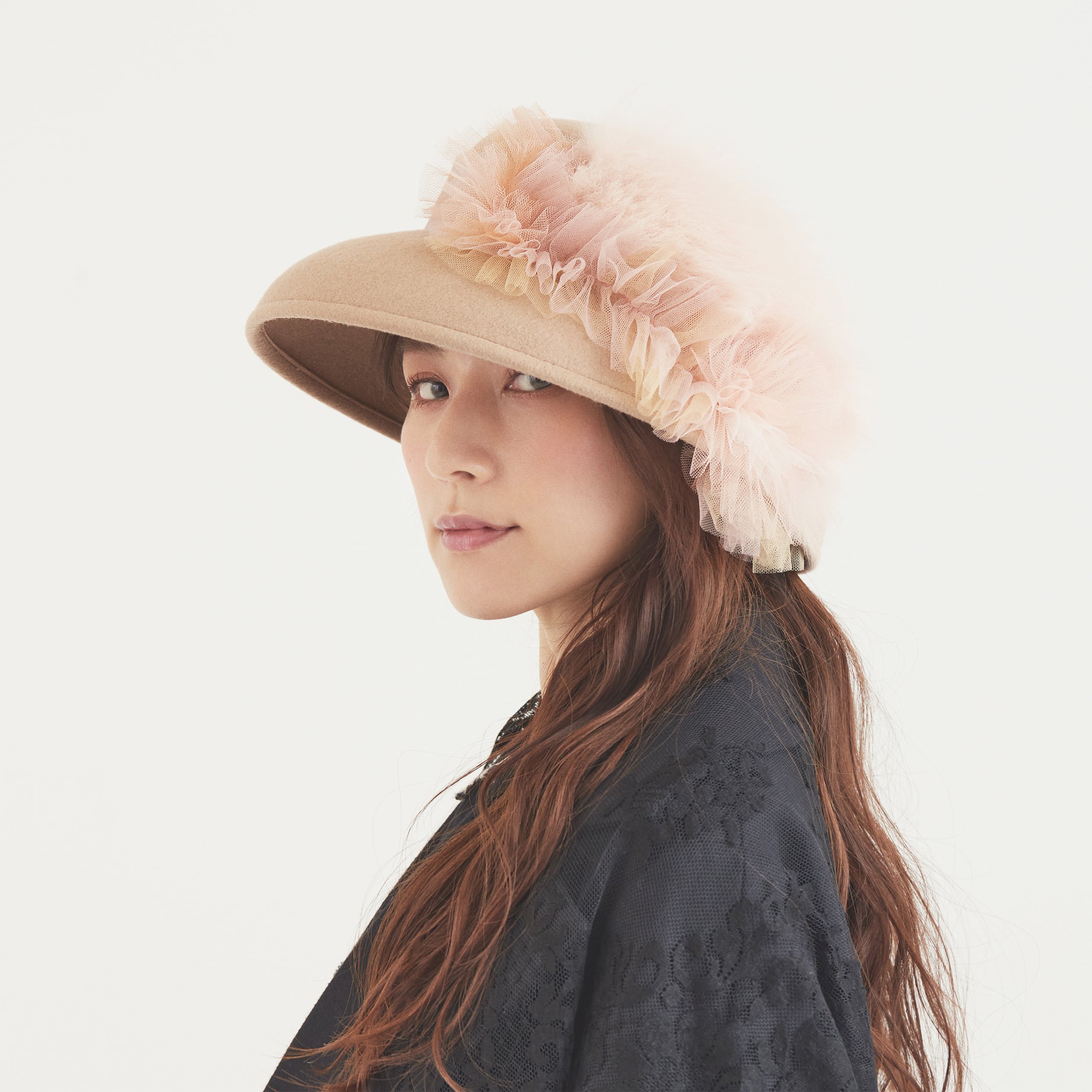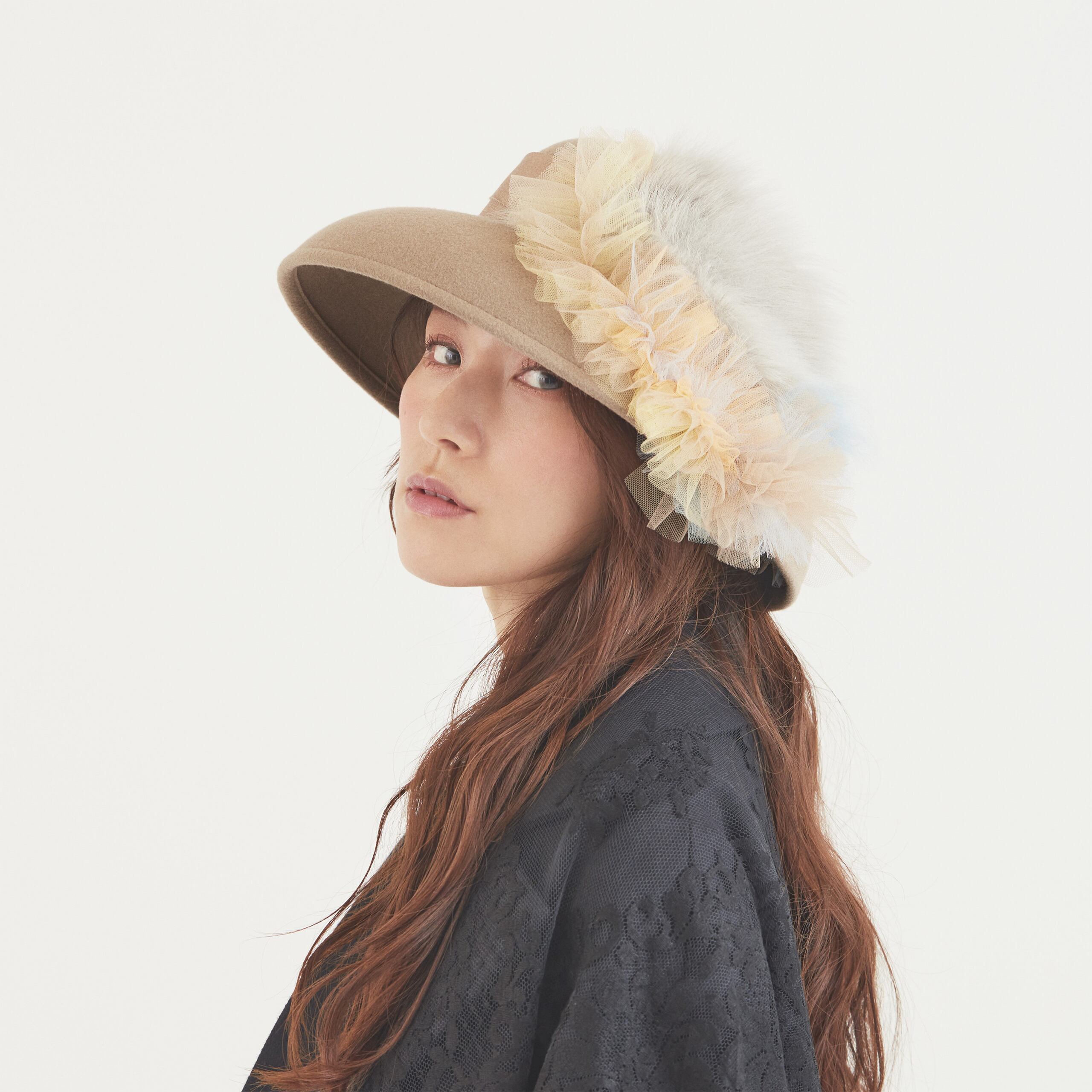 水彩画を描くように幾色ものチュールをフリルに縫い、重ねることで絵画のような帽子に仕立てました。フォックスファーとフリルのコンビネーションがとても華やかなのですが、更につば裏にもフリルを繰り返すことによって、お顔の隣に常に寄り添い、一層にドラマチックです。