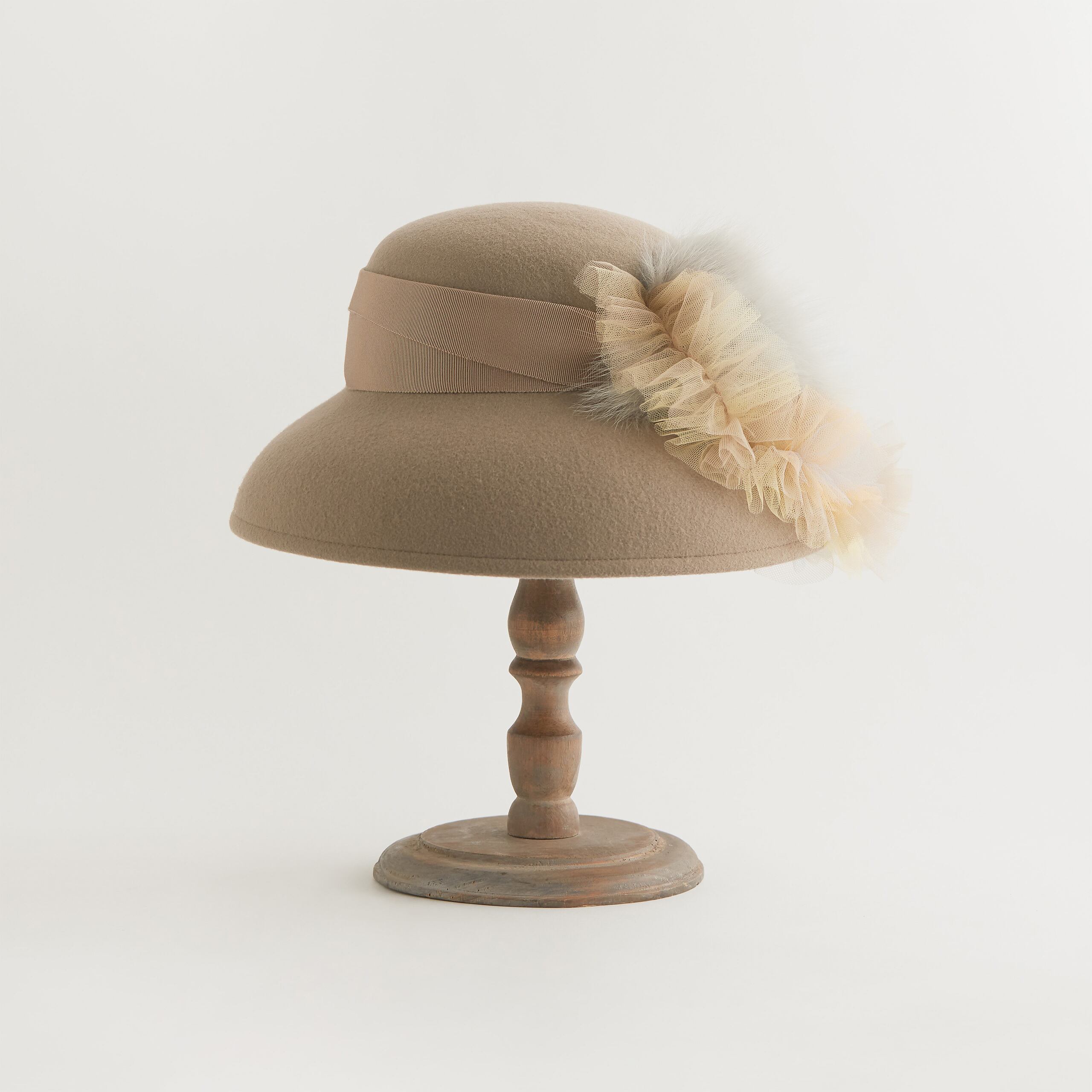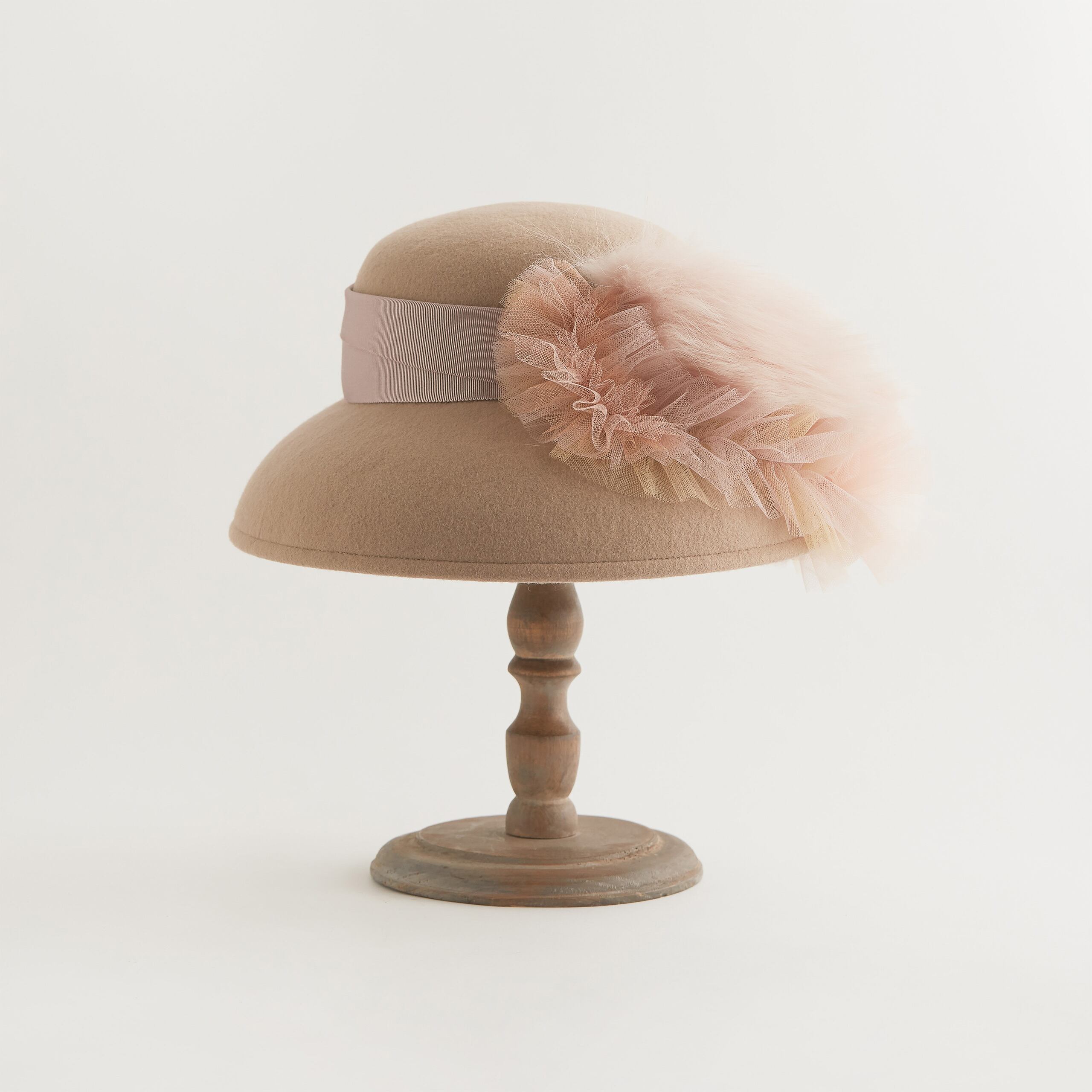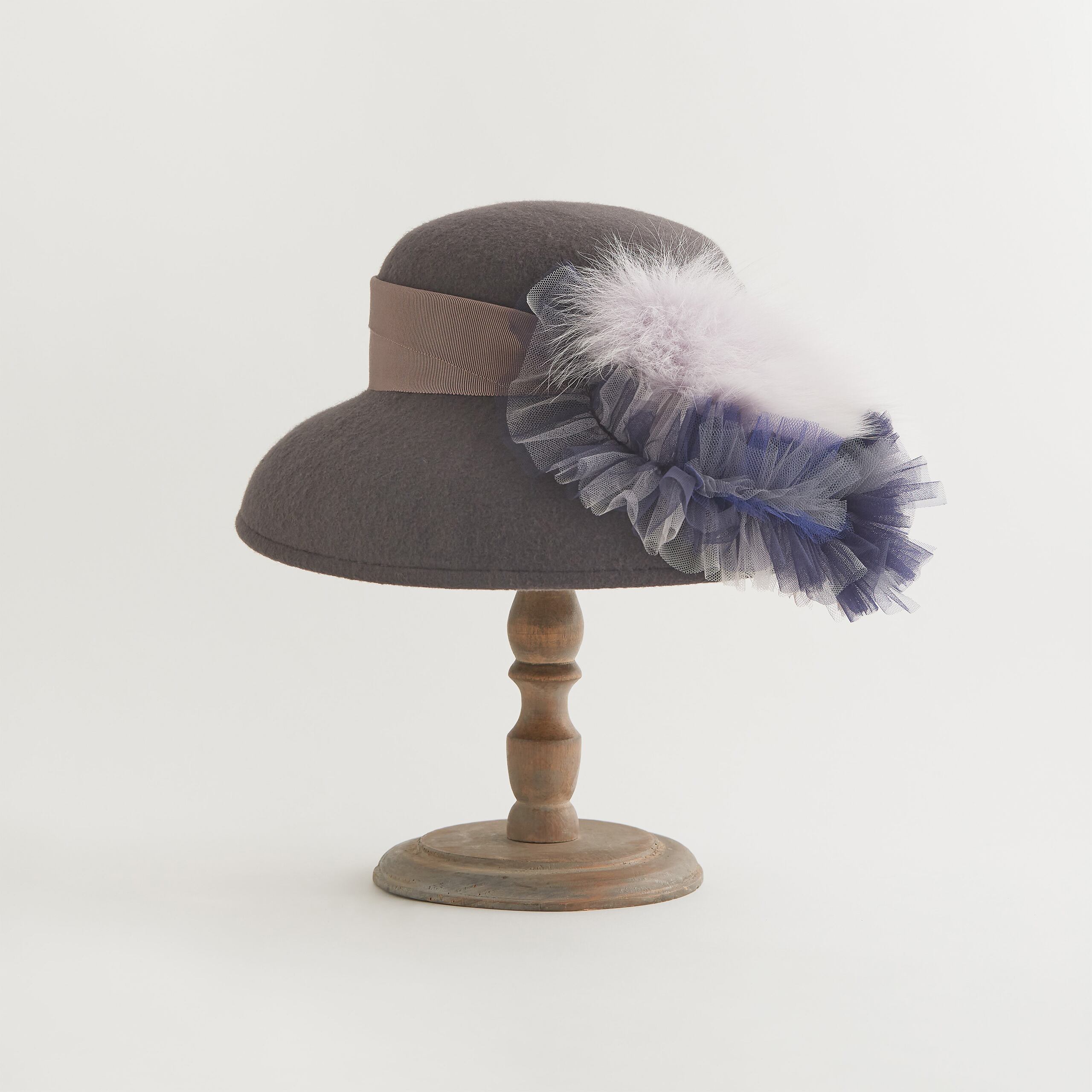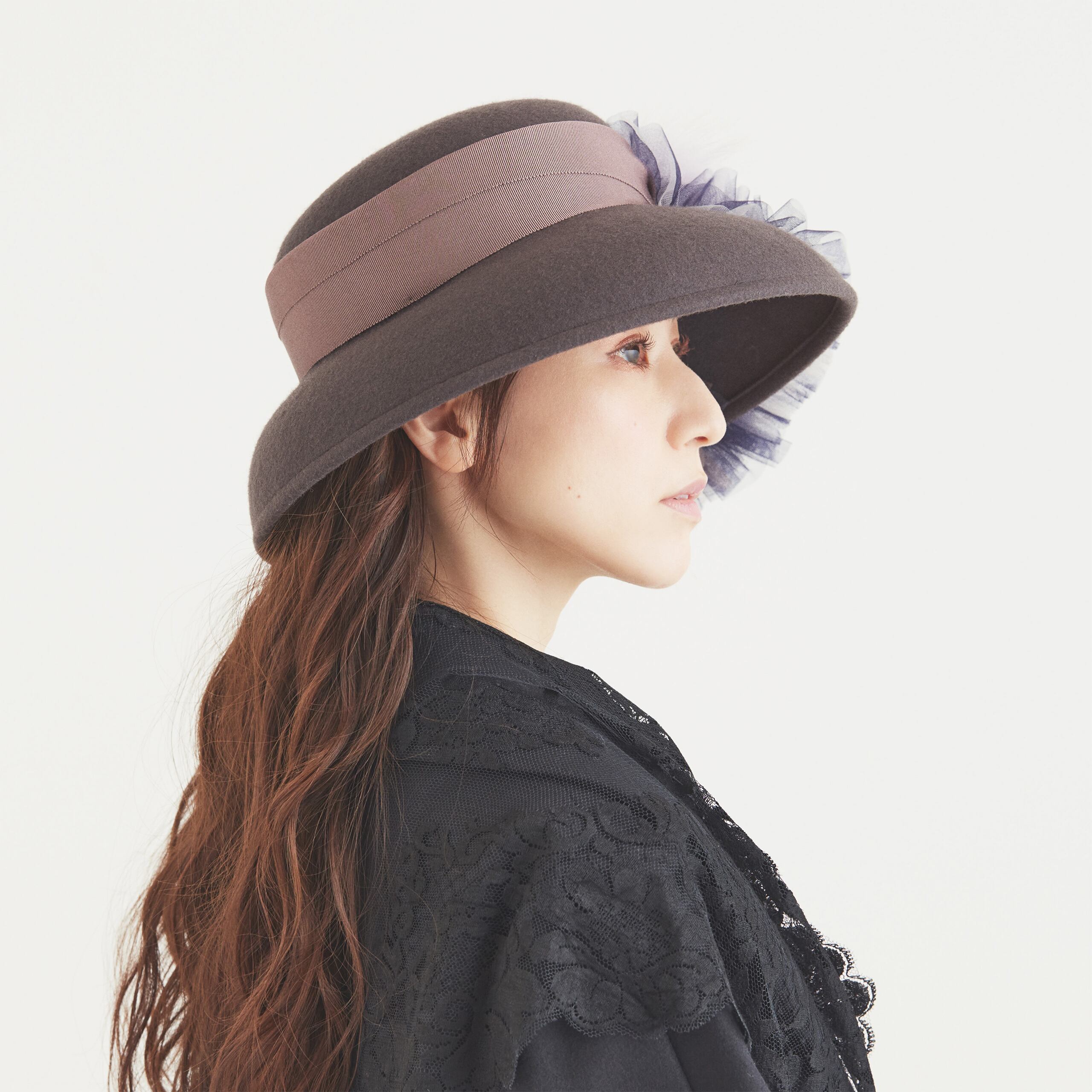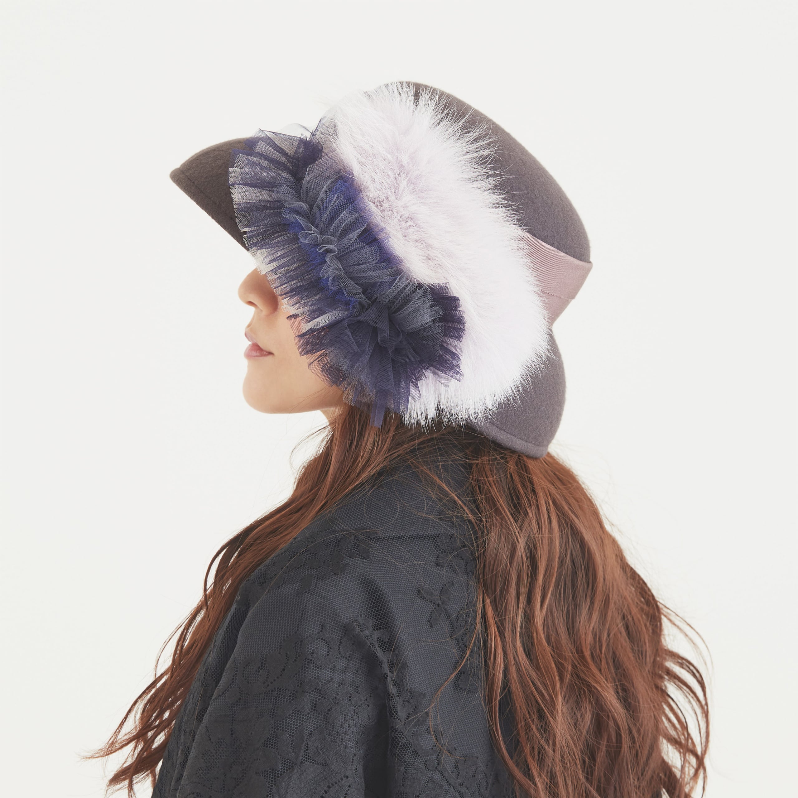 水彩画を描くように幾色ものチュールをフリルに縫い、重ねることで絵画のような帽子に仕立てました。フォックスファーとフリルのコンビネーションがとても華やかなのですが、更につば裏にもフリルを繰り返すことによって、お顔の隣に常に寄り添い、一層にドラマチックです。