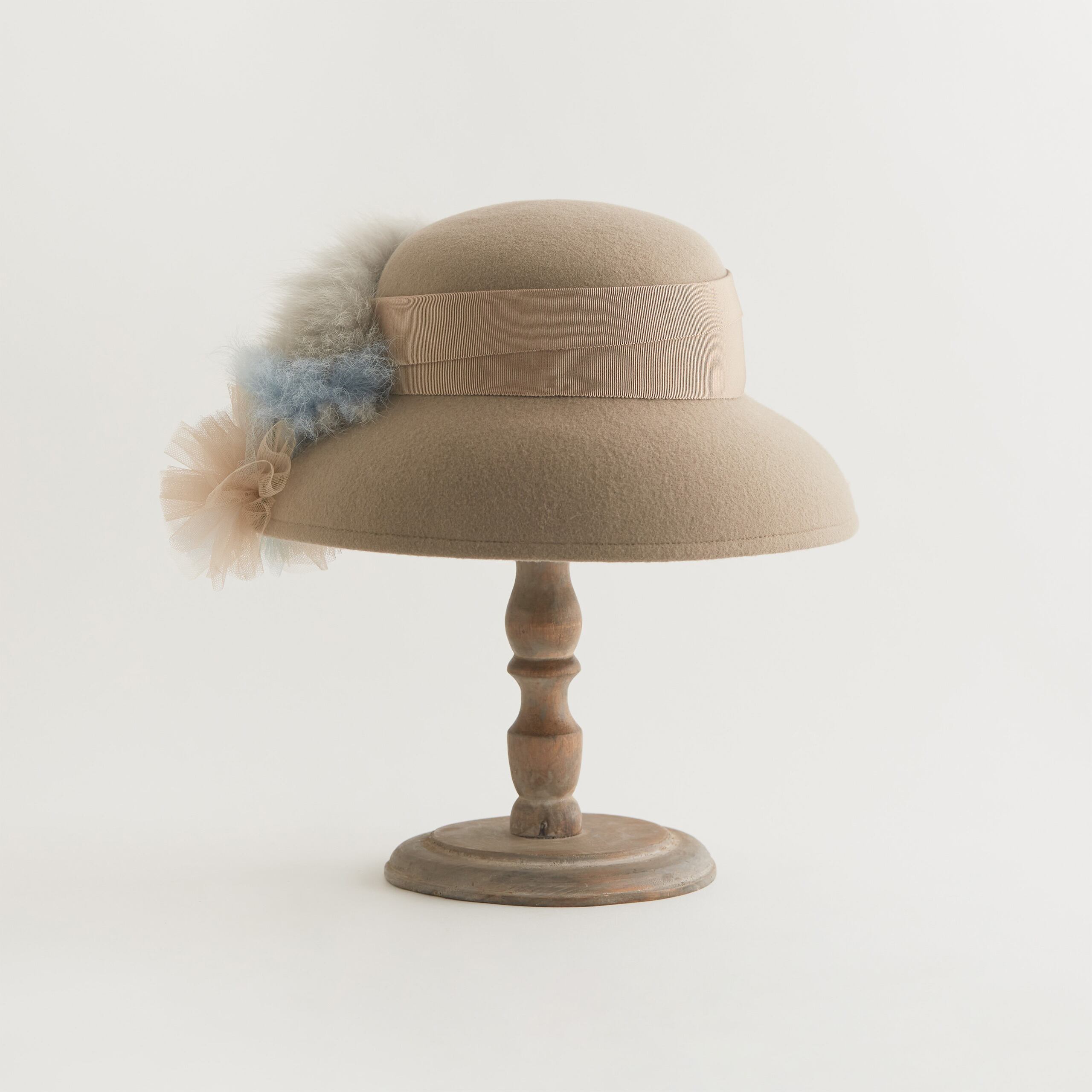 アンティークの木型で製作したハットで、クラウン、ブリム共に美しい膨らみと曲線を持ったボディです。