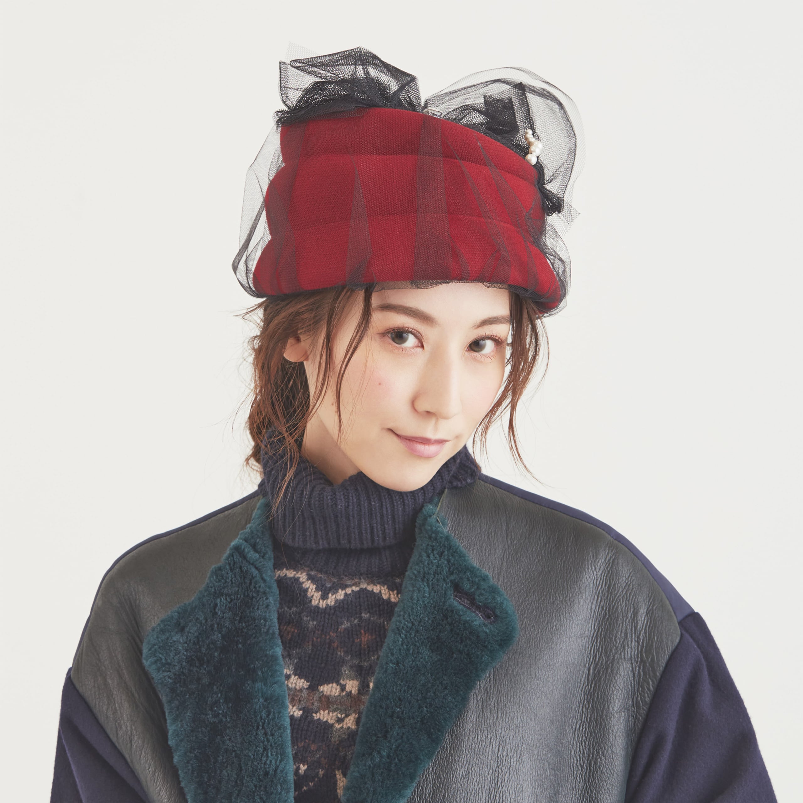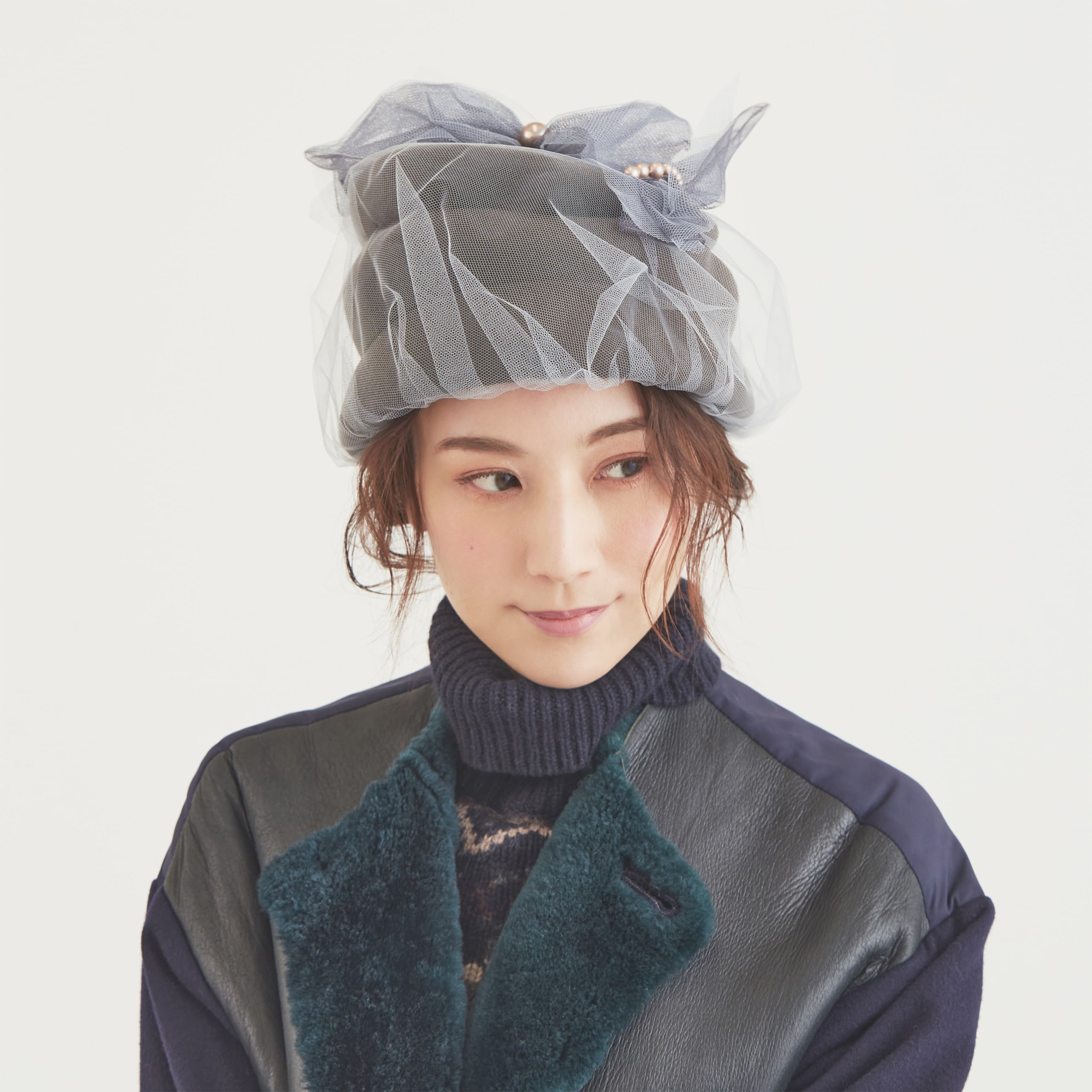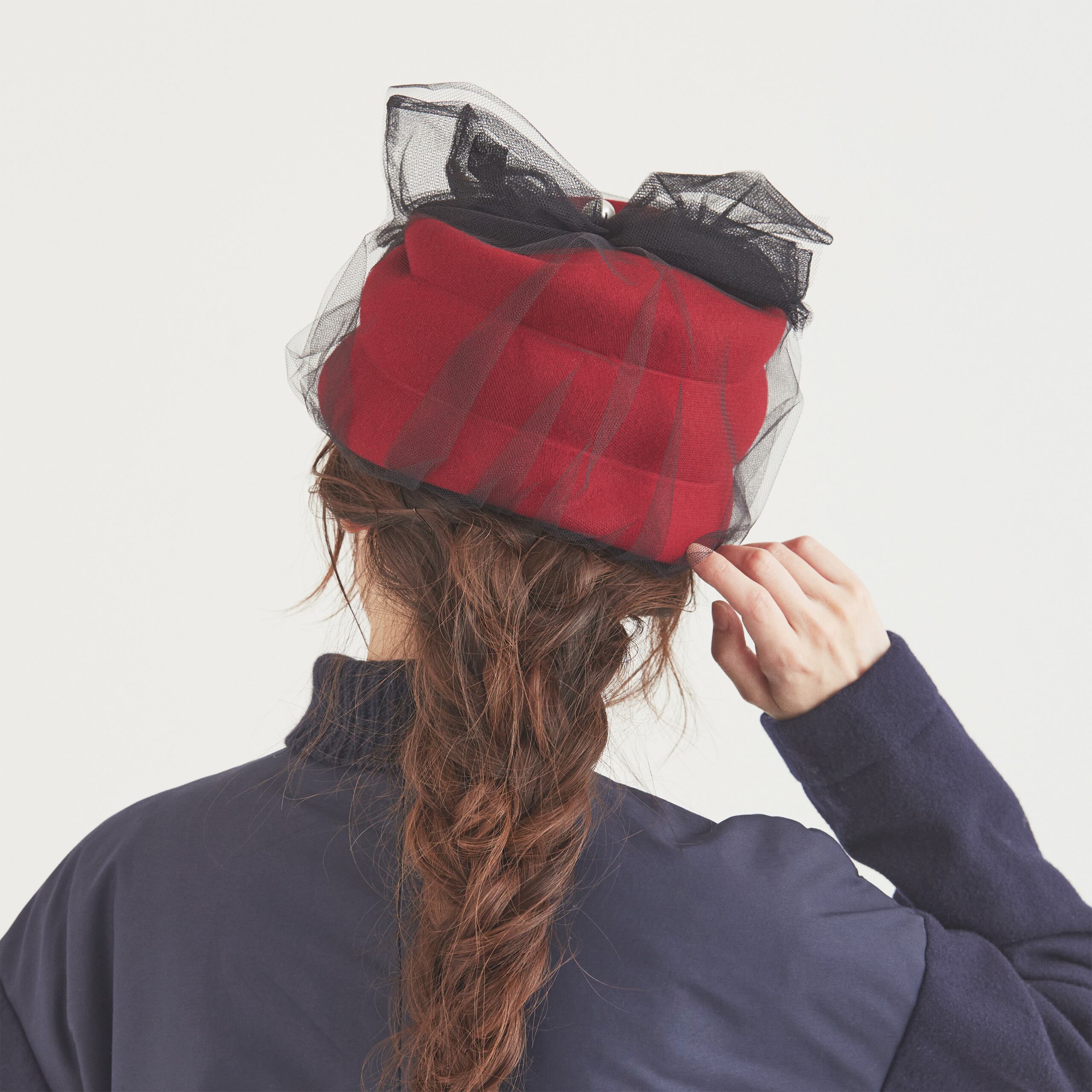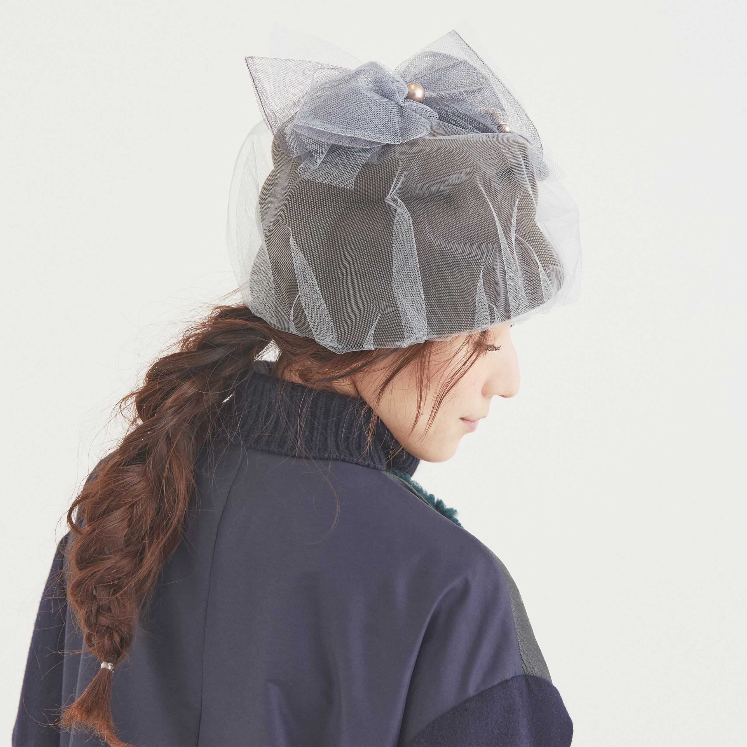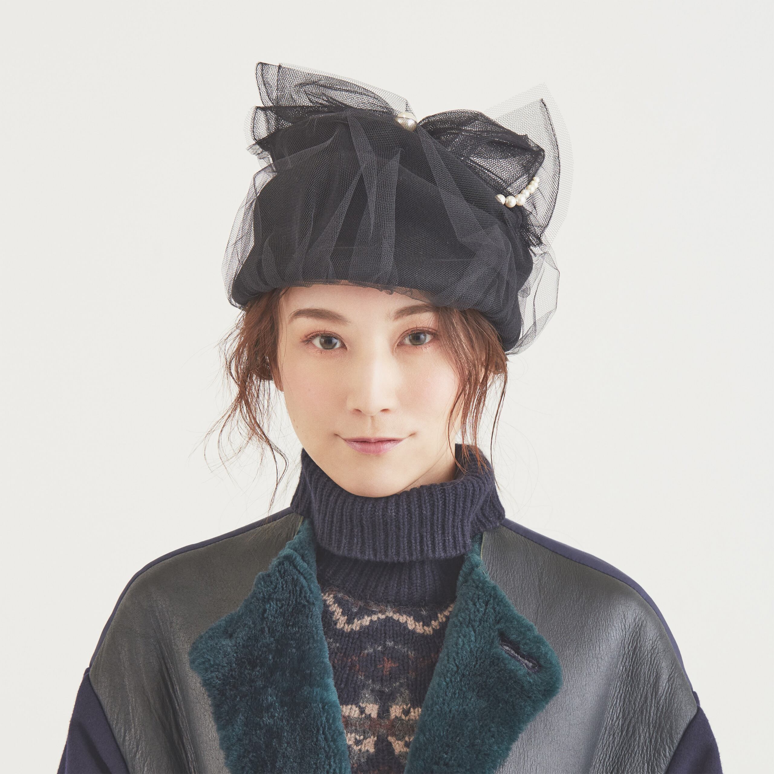 古き良きクラシックなフォルムをベースに、ひと仕事加えることで現代風のアレンジを施しました。帽子全体をまるでクリスマスプレゼントのようにチュールでラッピングし、トップには動きのあるリボンをあしらっています。アシンメトリーに形作られたリボンは猫耳を意識しており、耳を立たせたり、控えめに寝かせたりと、その日の気分に合わせて自由にアレンジを楽しんでいただけます。