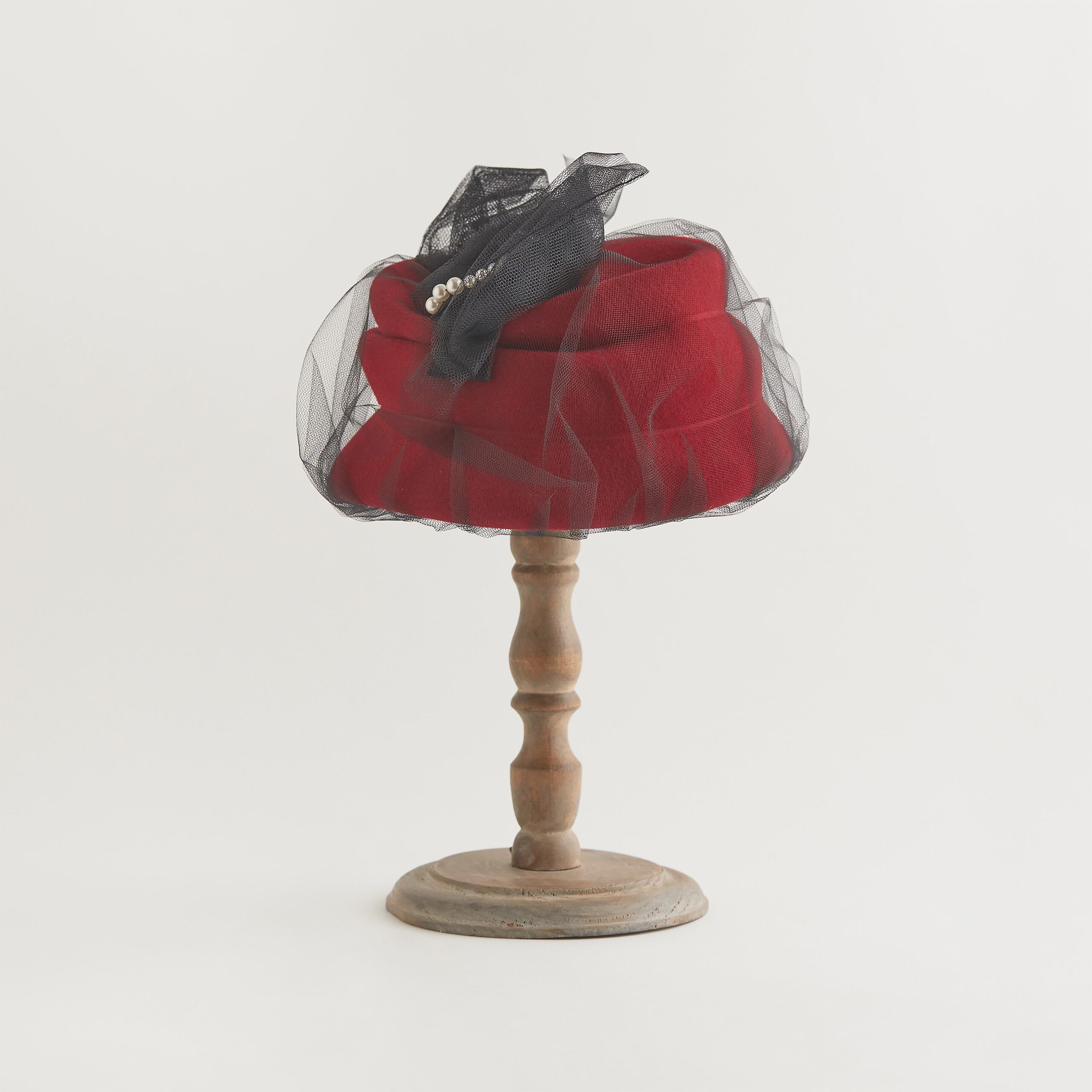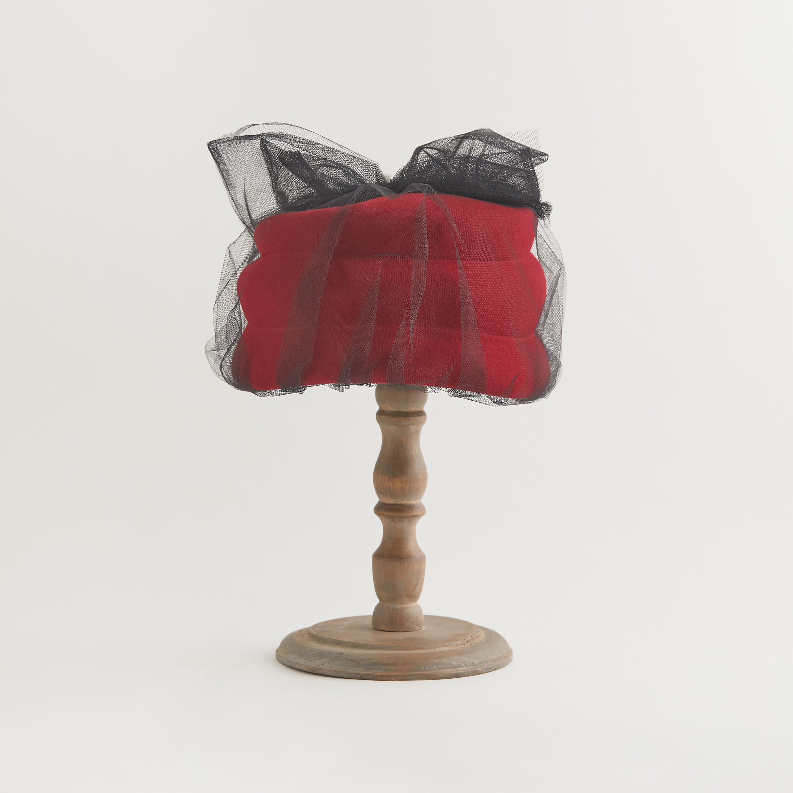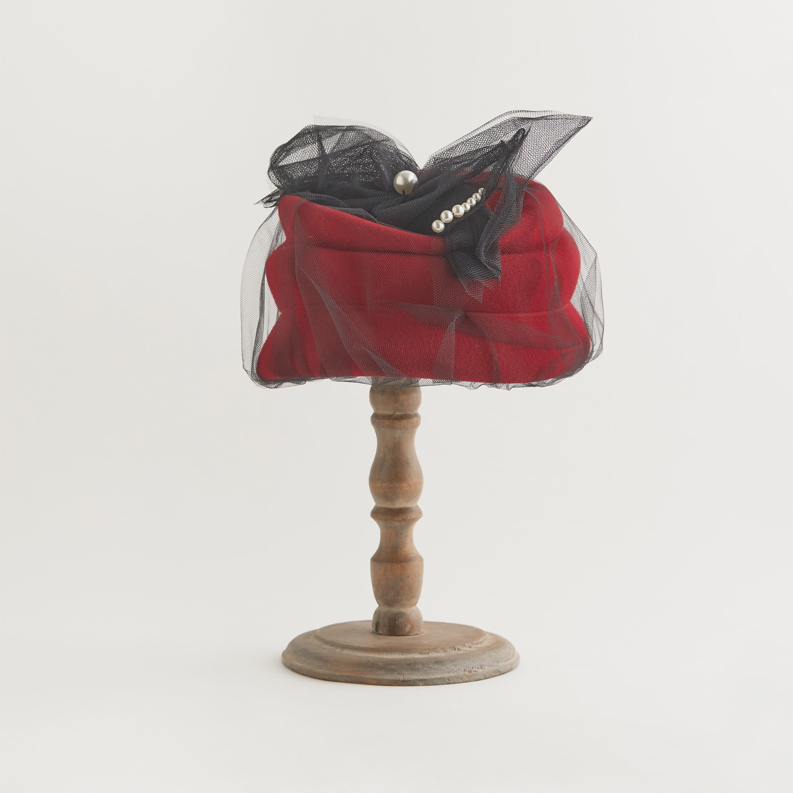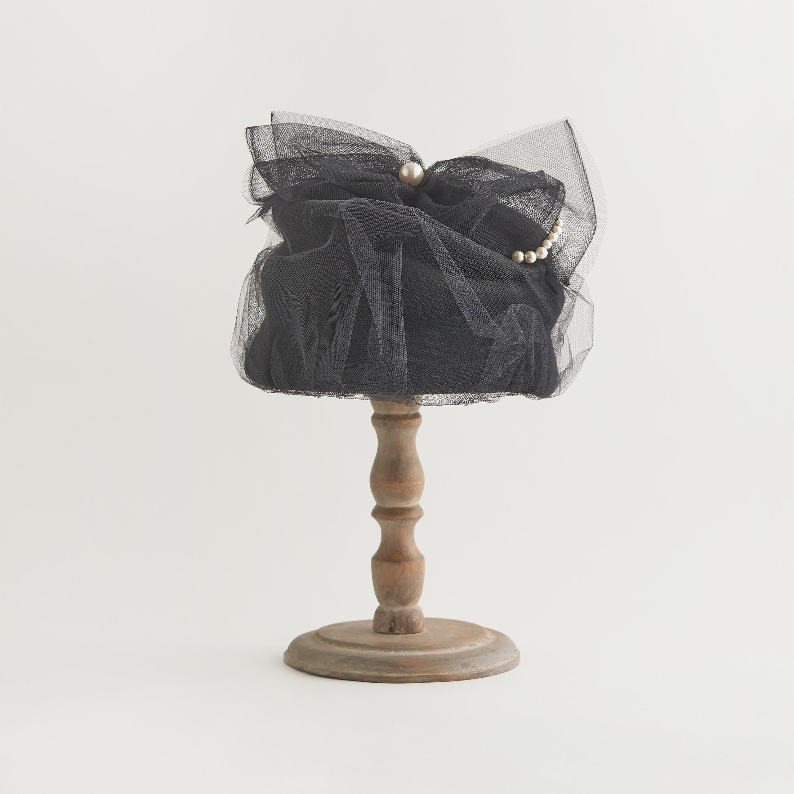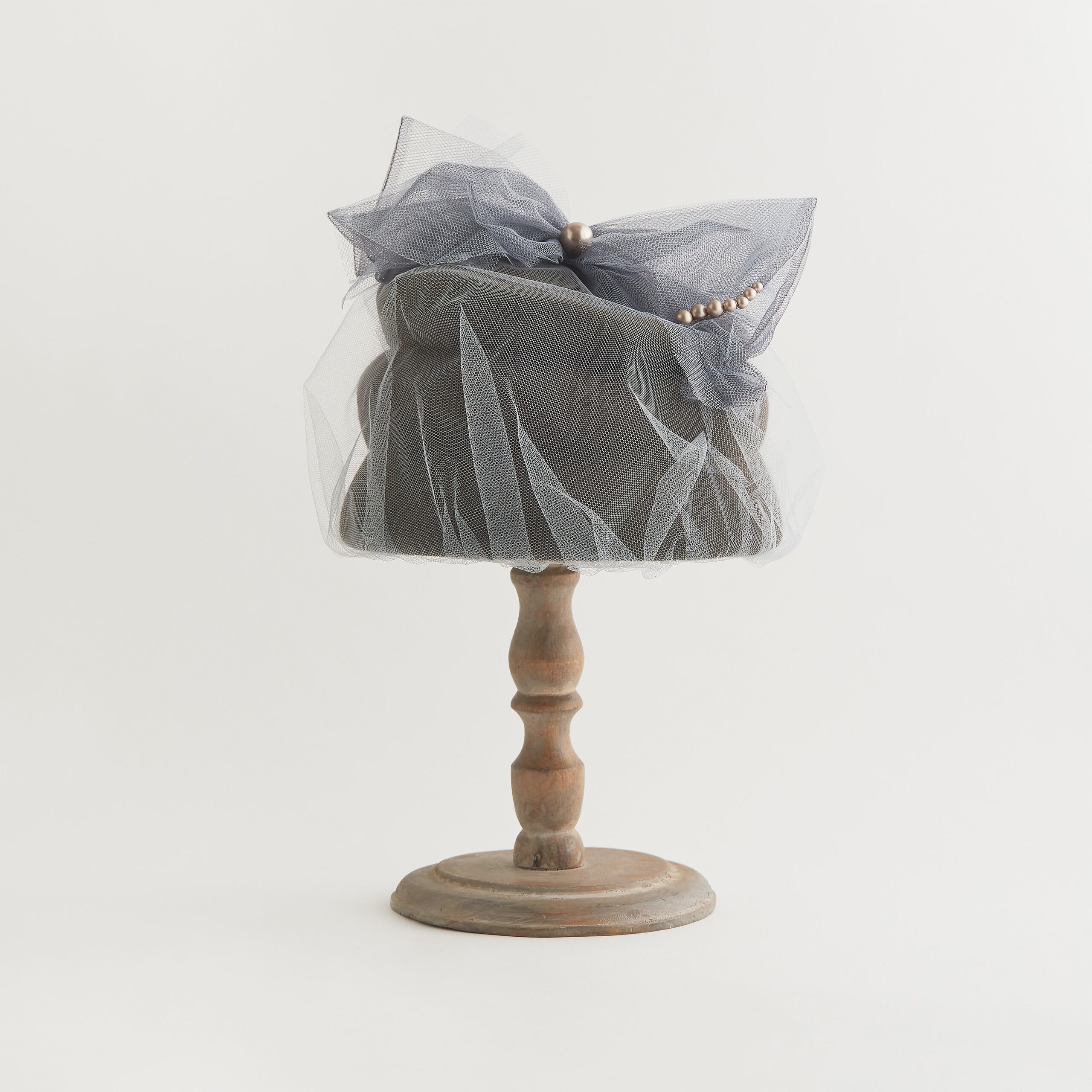 古き良きクラシックなフォルムをベースに、ひと仕事加えることで現代風のアレンジを施しました。帽子全体をまるでクリスマスプレゼントのようにチュールでラッピングし、トップには動きのあるリボンをあしらっています。アシンメトリーに形作られたリボンは猫耳を意識しており、耳を立たせたり、控えめに寝かせたりと、その日の気分に合わせて自由にアレンジを楽しんでいただけます。