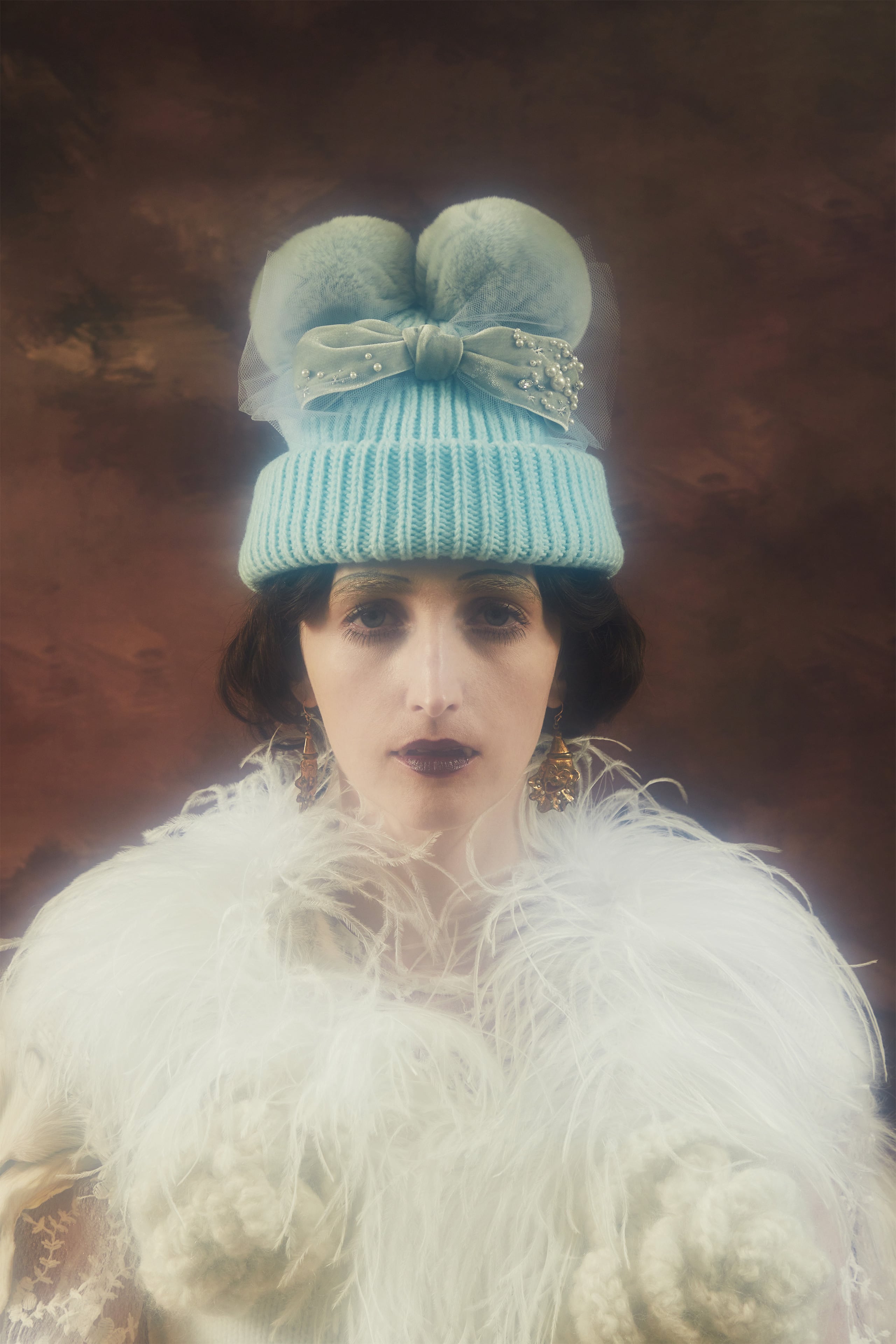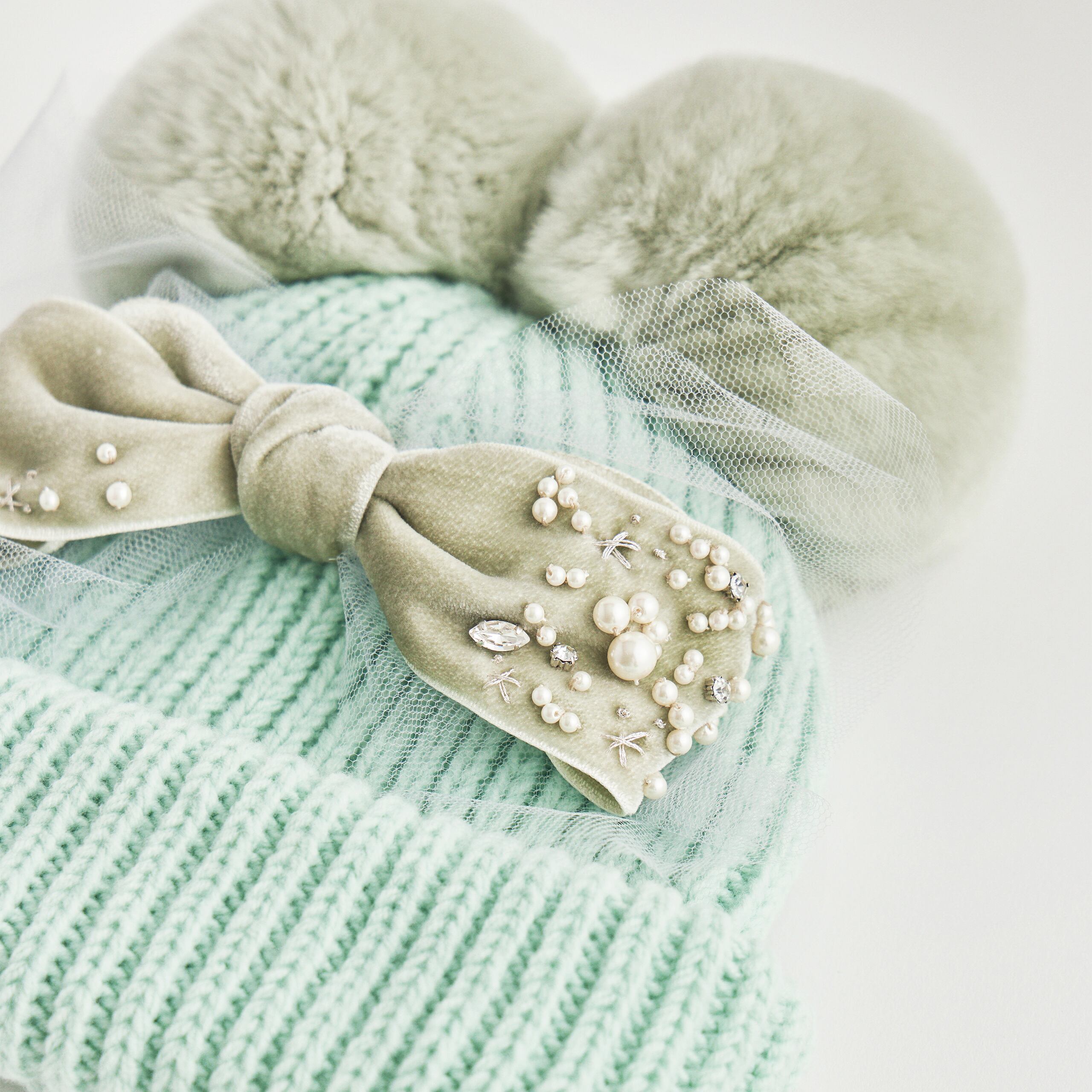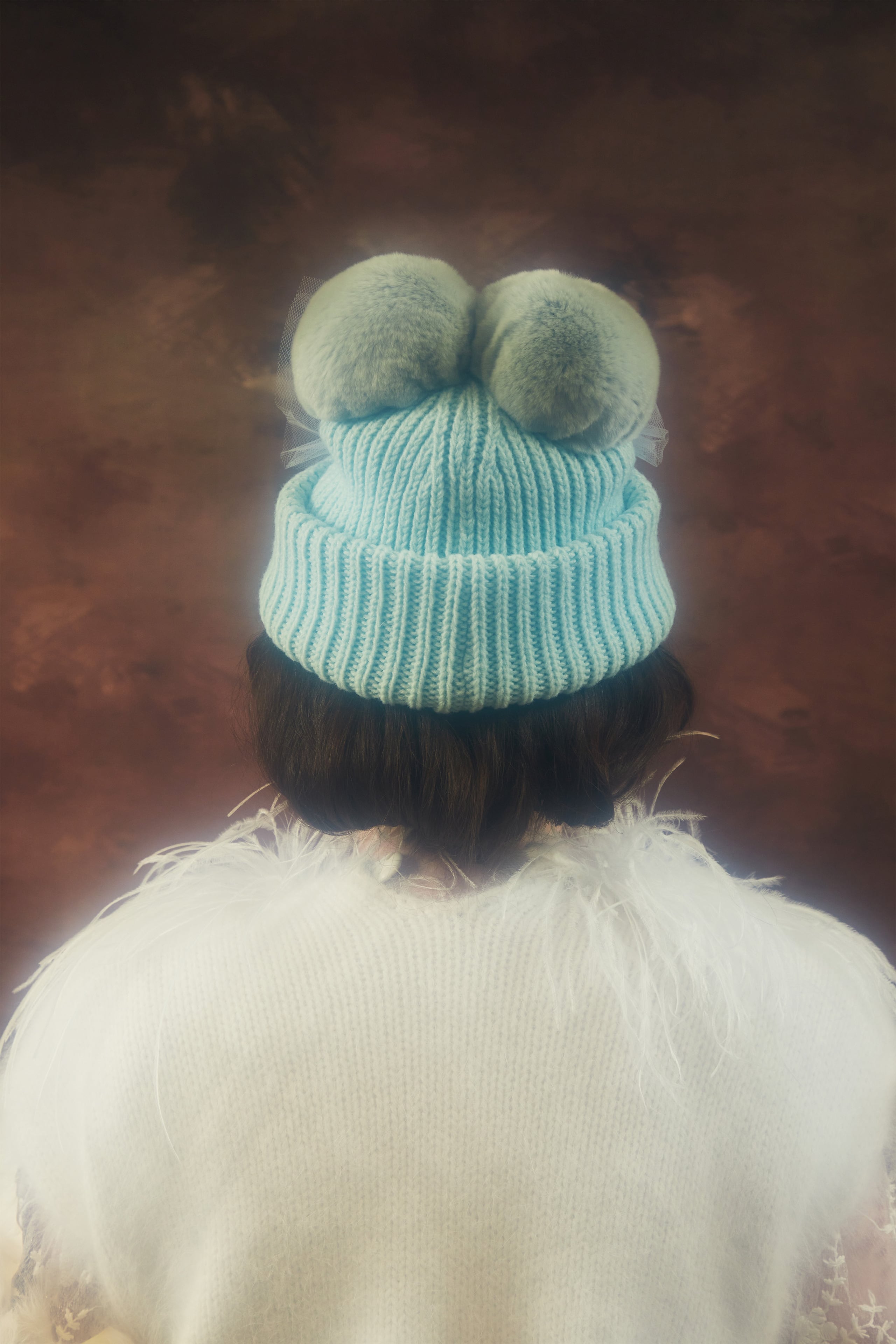 ラビットファーの中でも最高級のレッキスラビットの柔らかで滑らかな質感のポンポンを飾りました。
