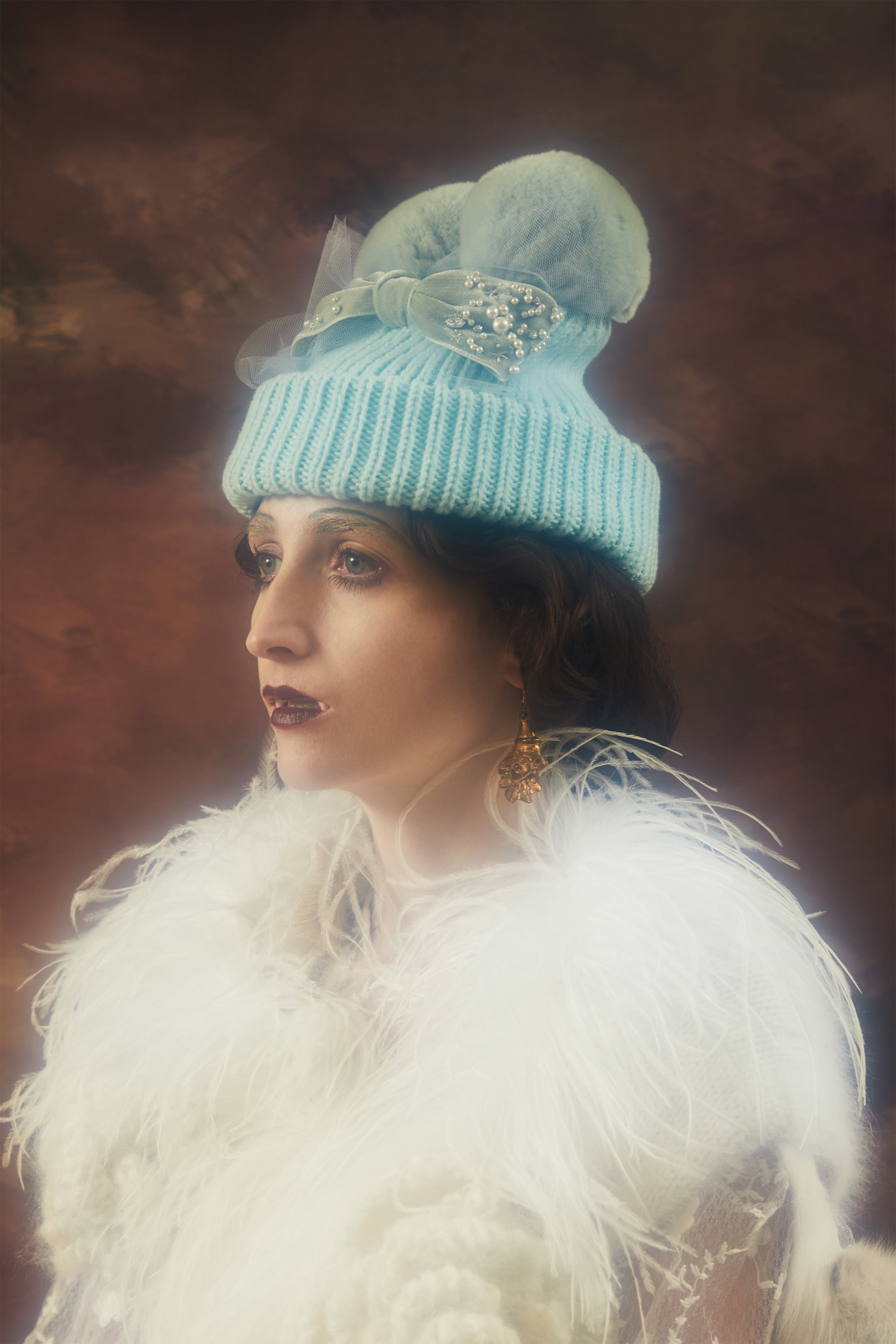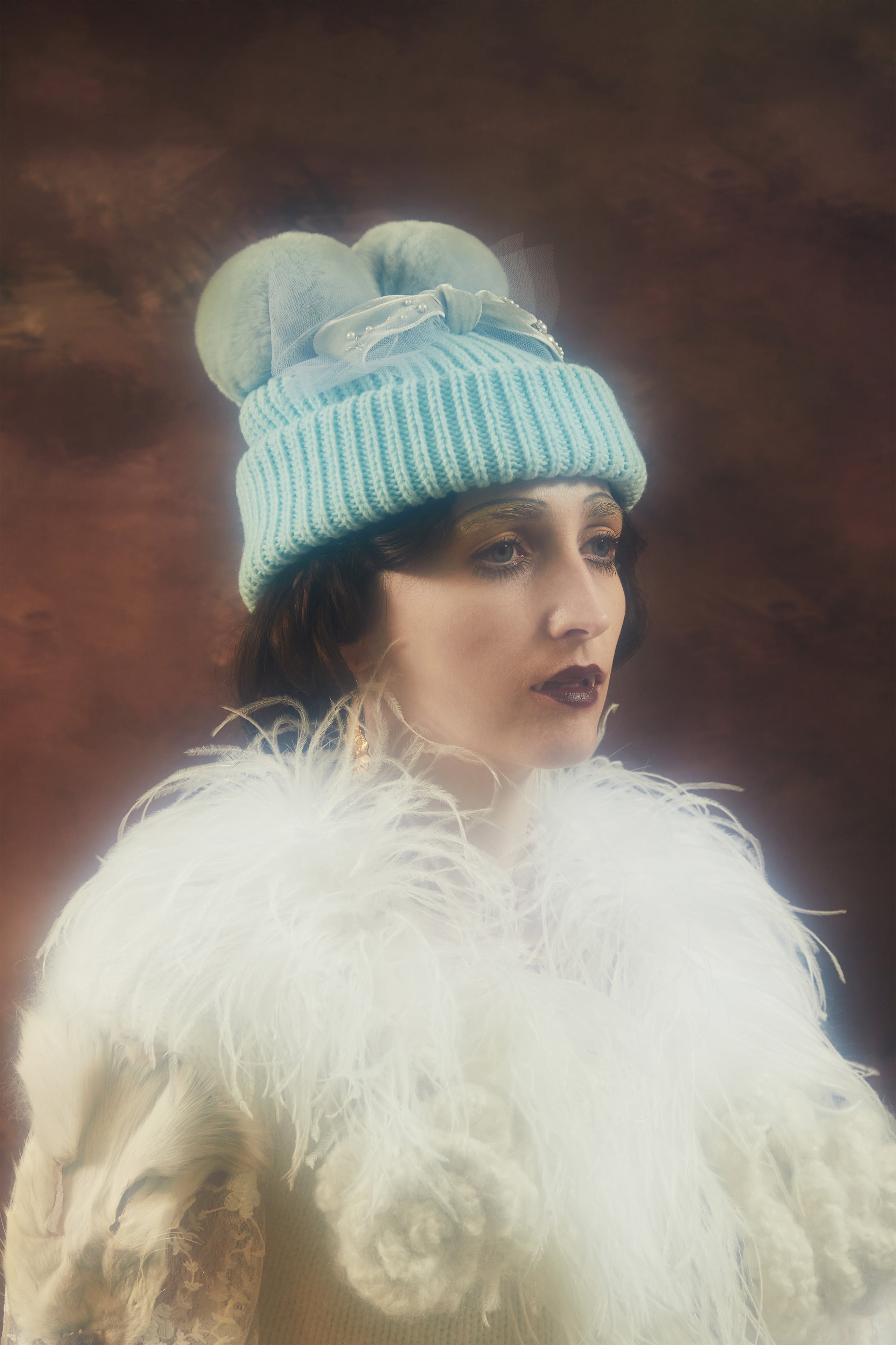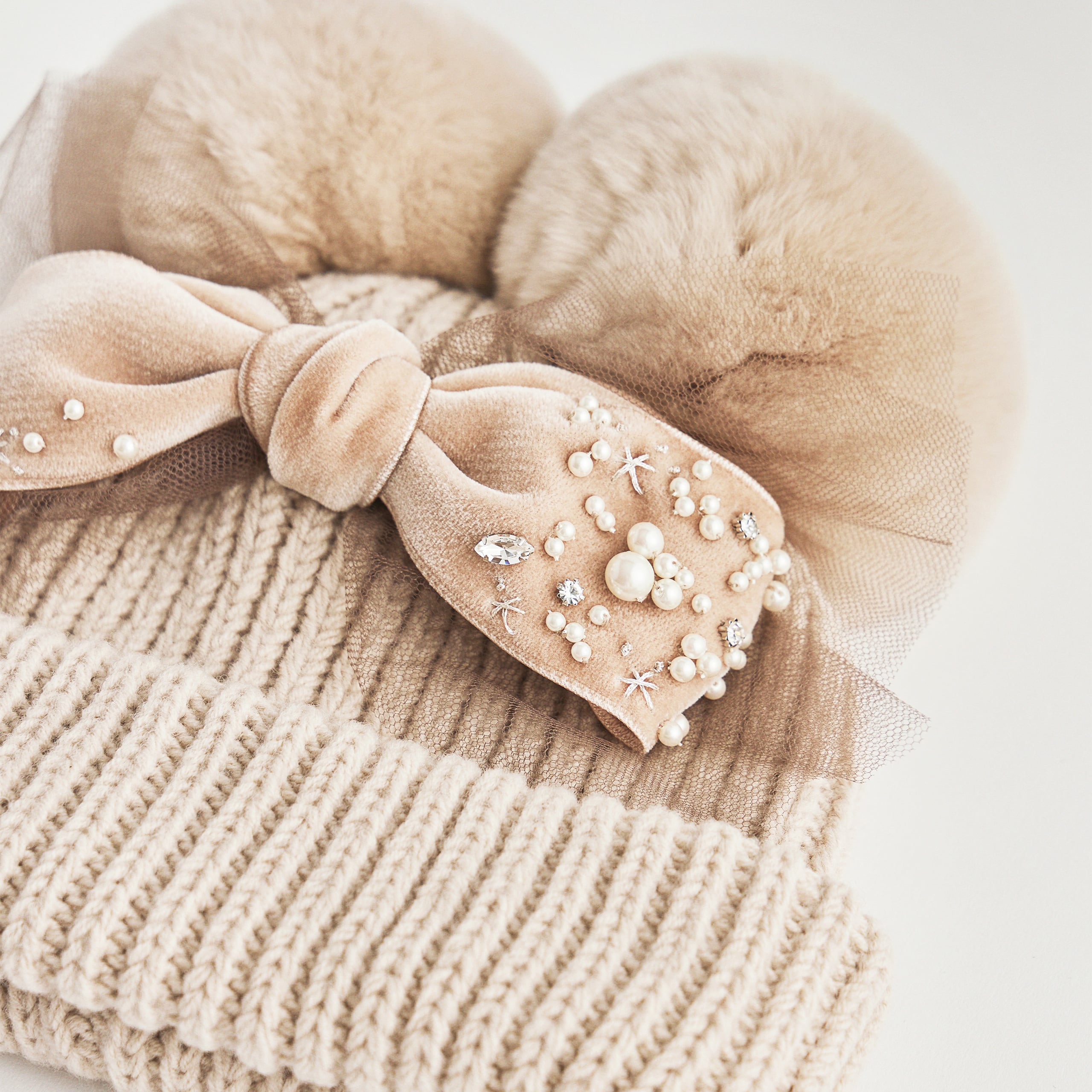 ラビットファーの中でも最高級のレッキスラビットの柔らかで滑らかな質感のポンポンを飾りました。
