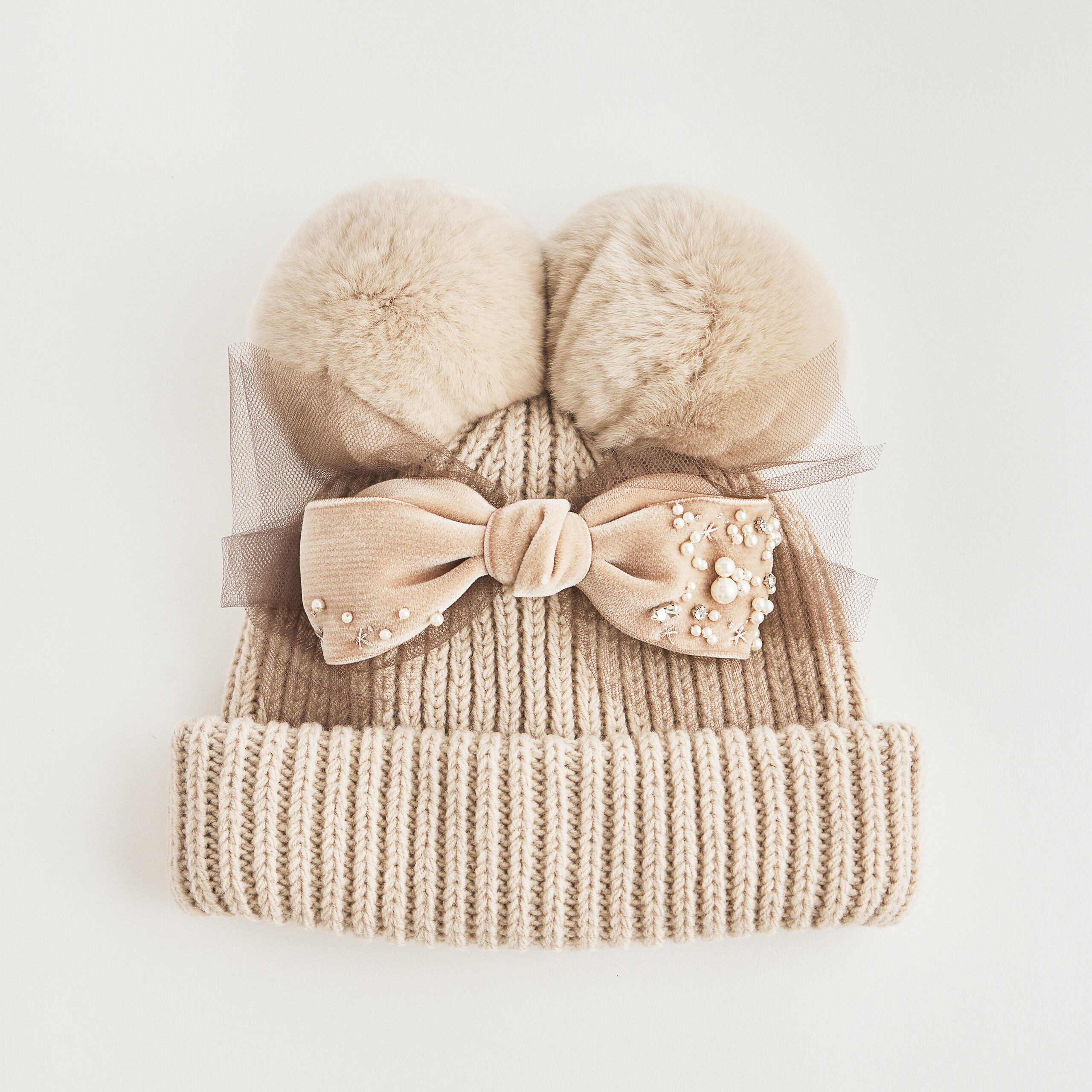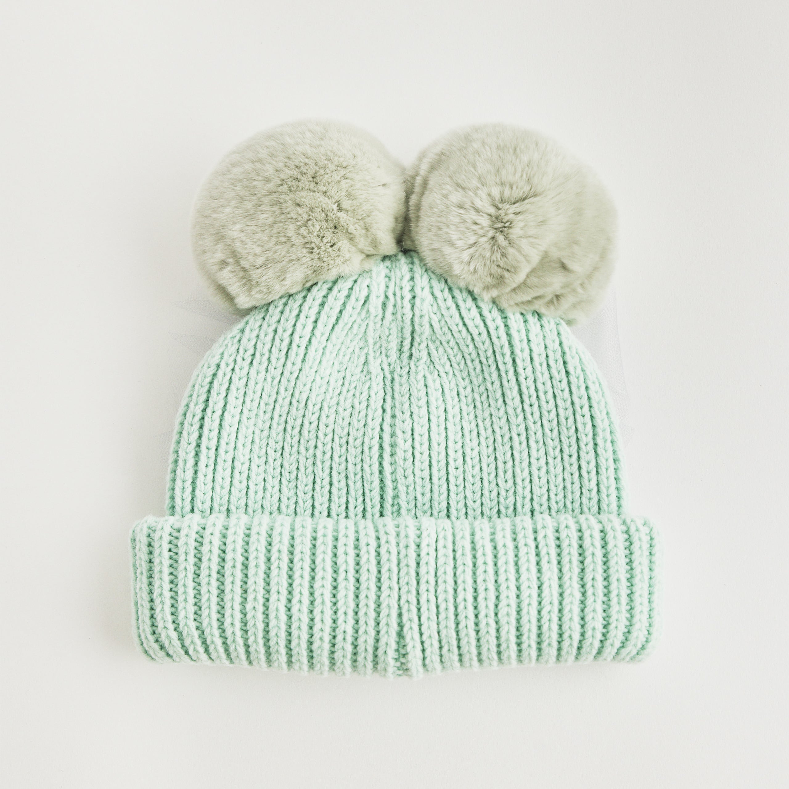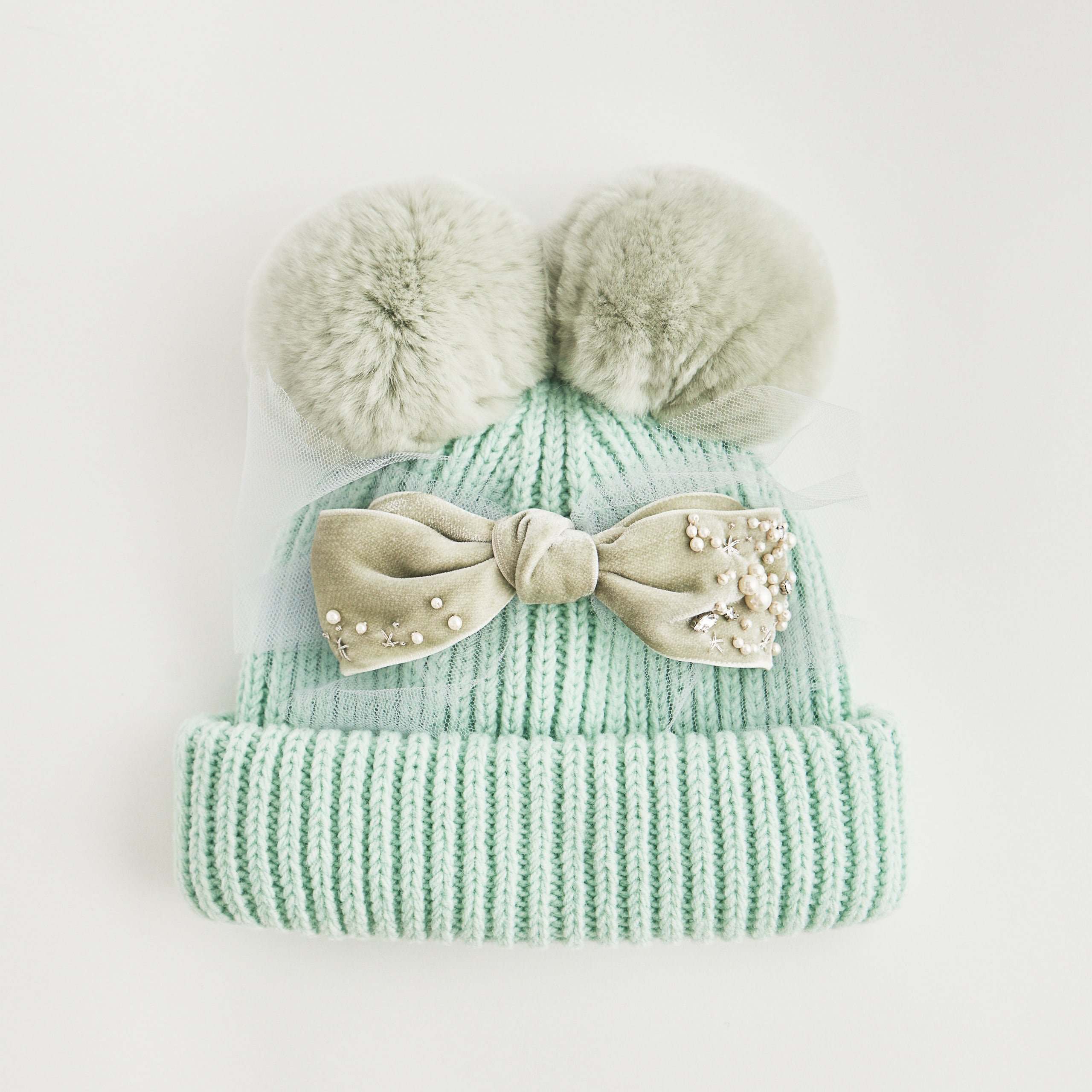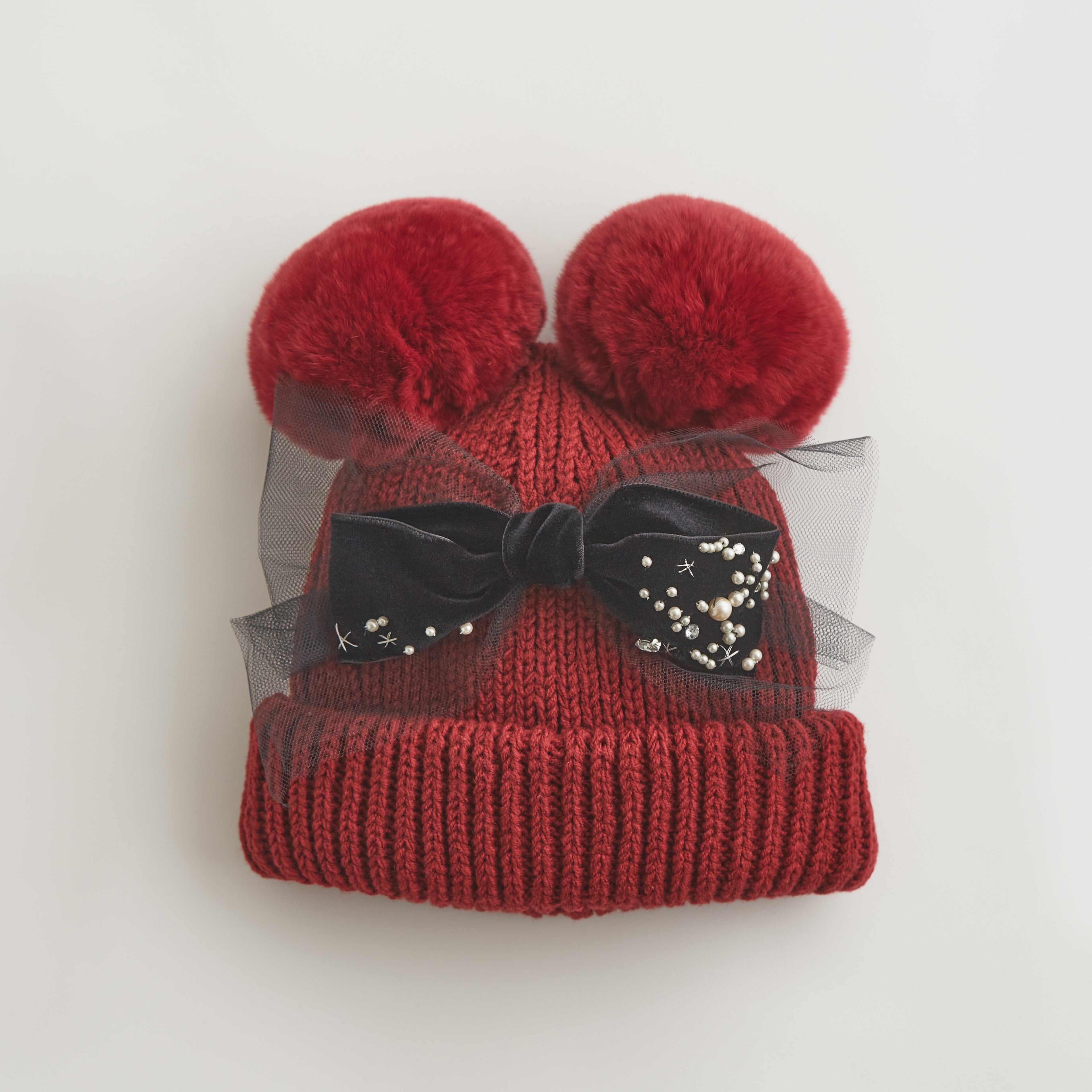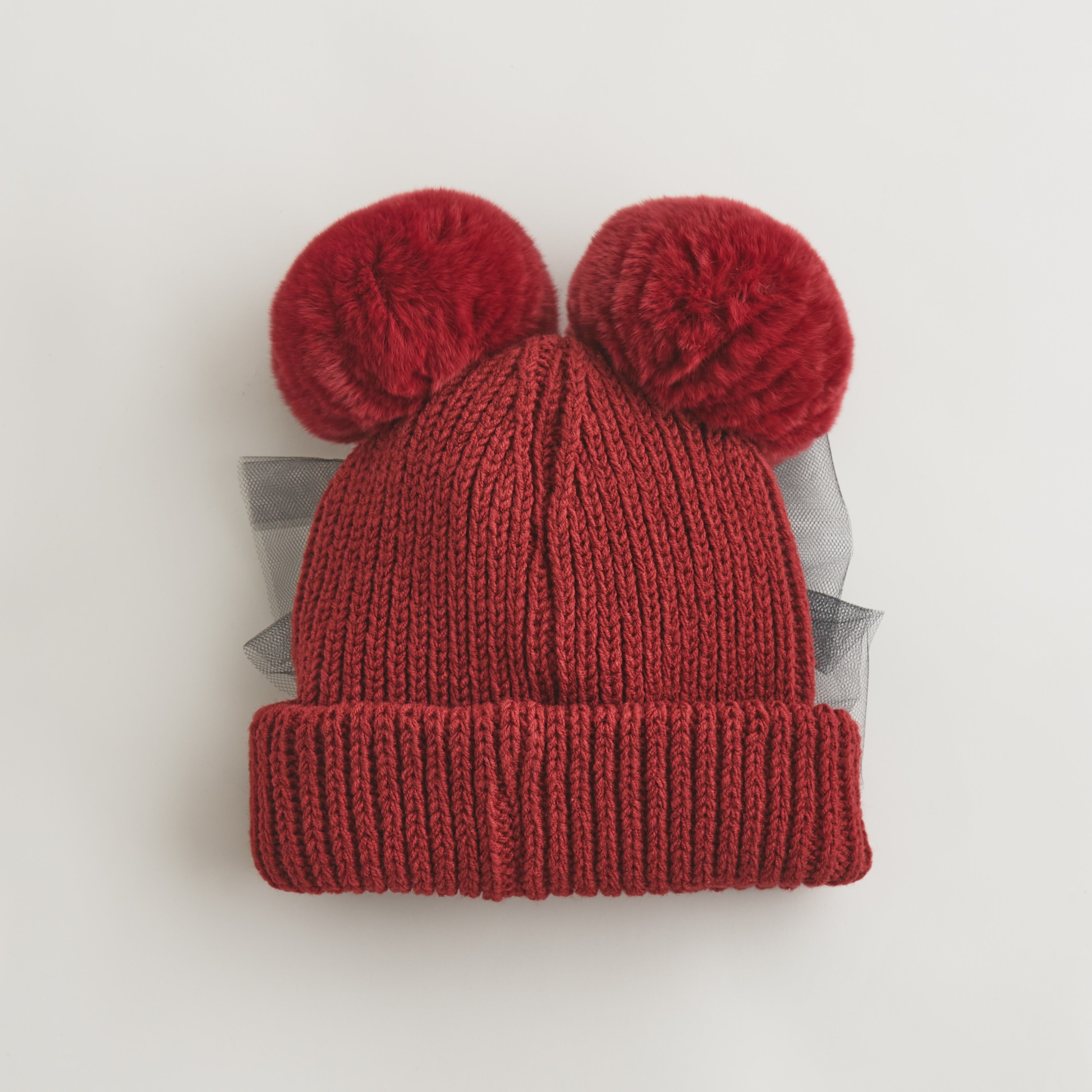 まんまるの2つのポンポンを飾り、マウスを表現したニットキャップです。