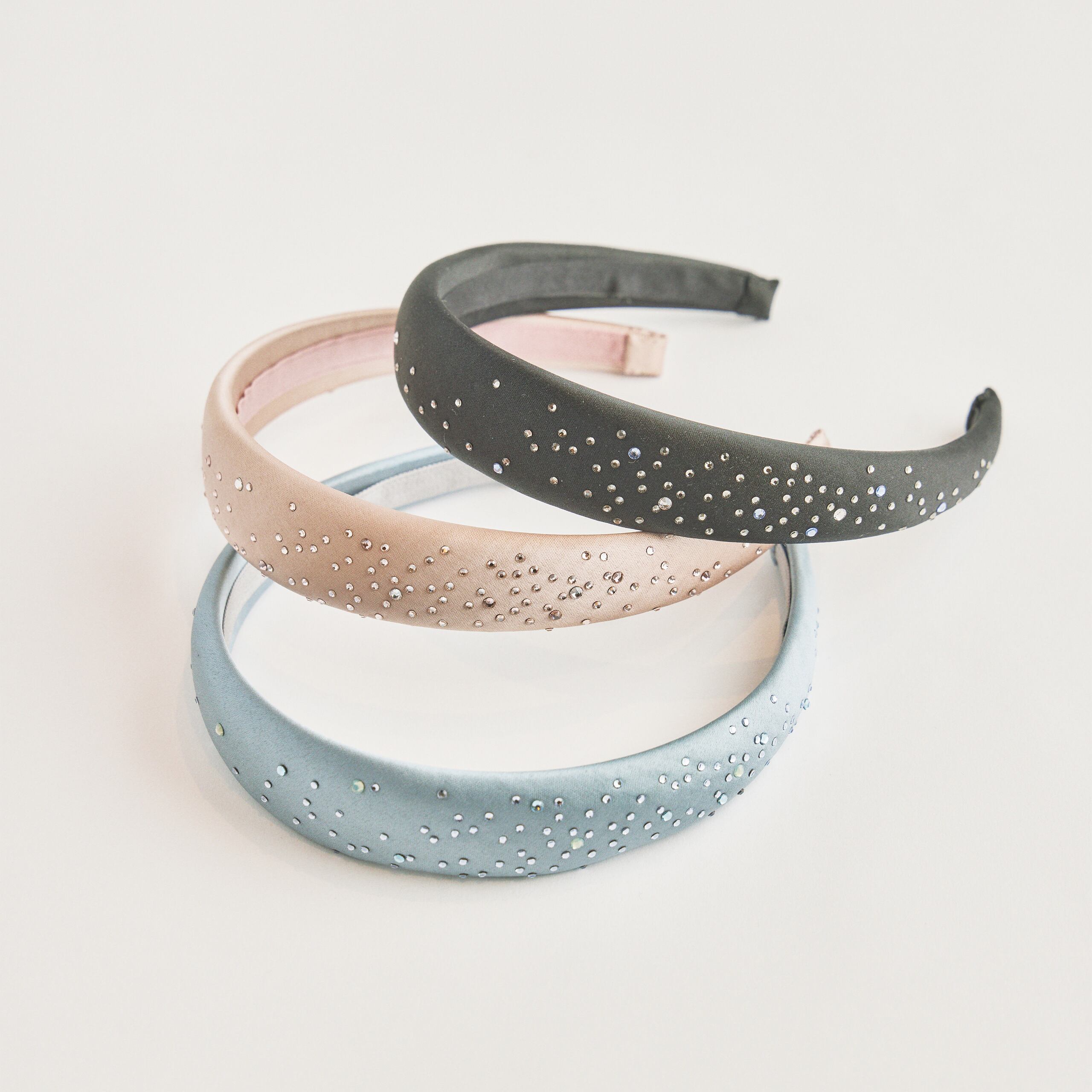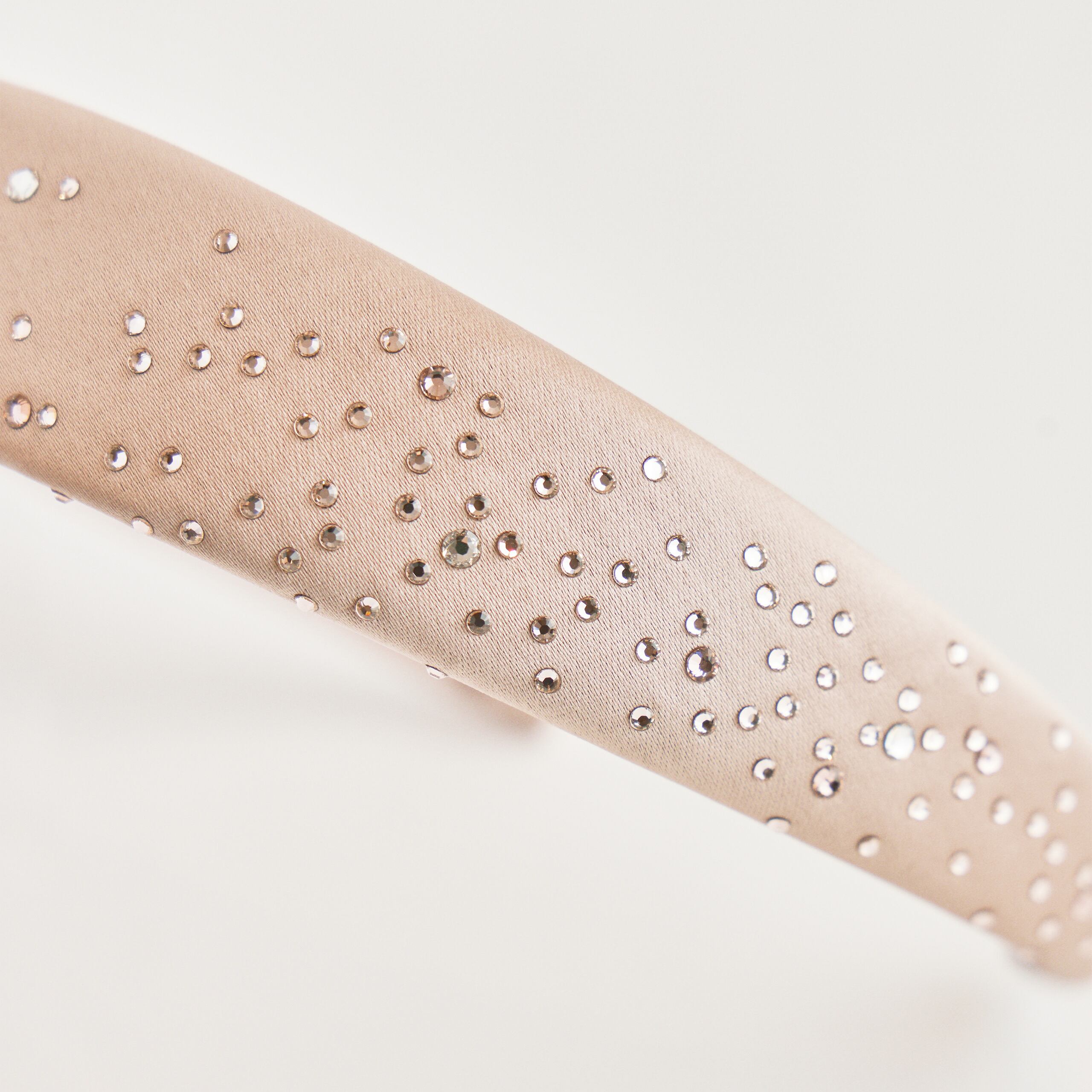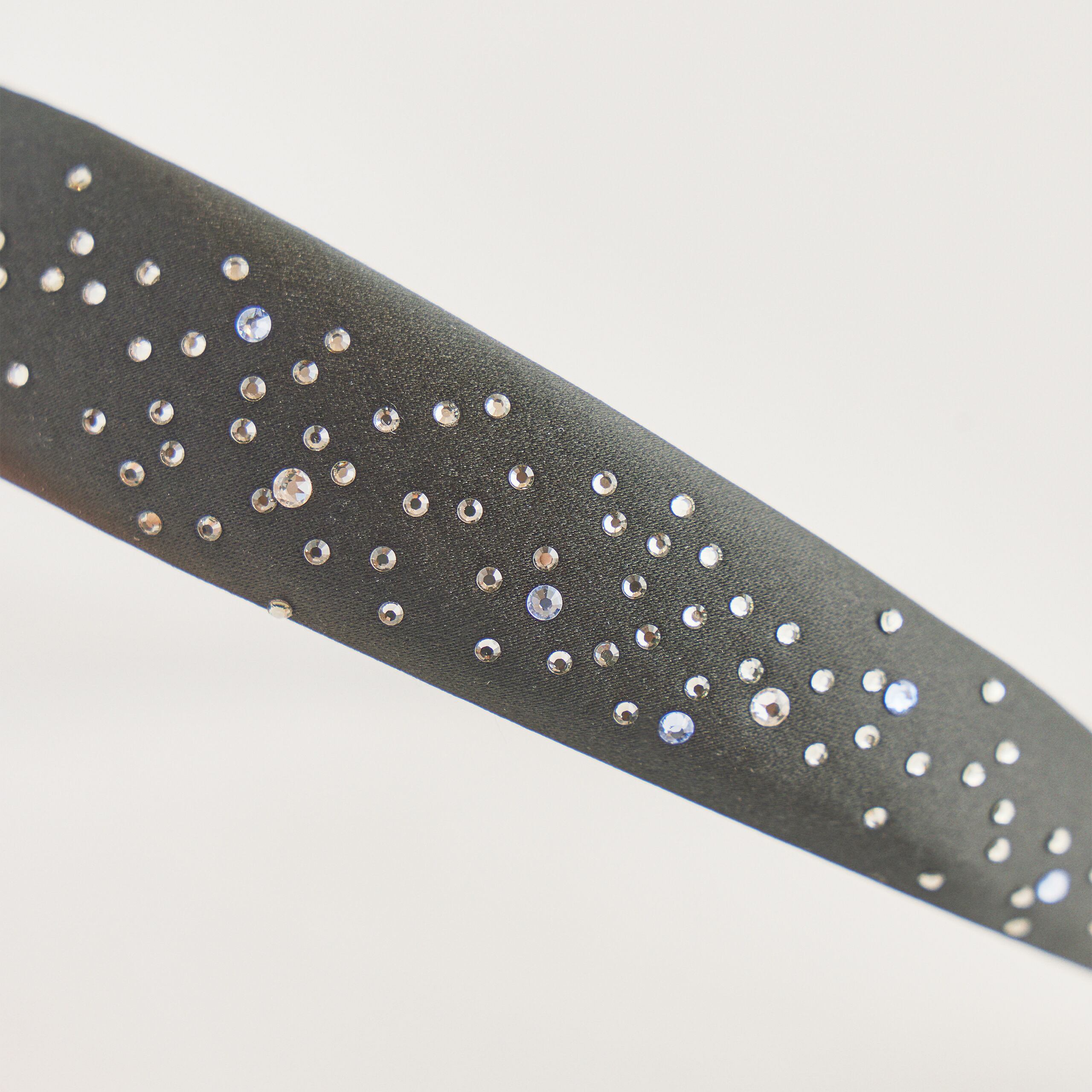 光沢のある上品な肉厚サテン生地に、小さなものは直径約2mmの小粒クリスタルを120粒以上ちりばめたカチューシャです。細かなクリスタルが繊細にきらめき、華やかすぎず上品な印象で、コーディネートのアクセントとして、さりげない輝きを加えます。