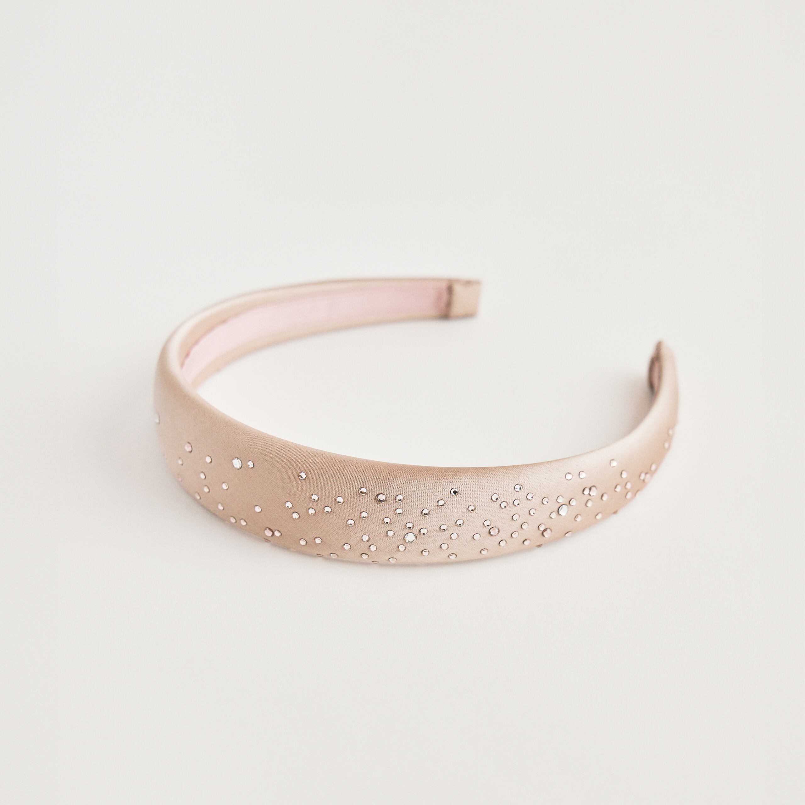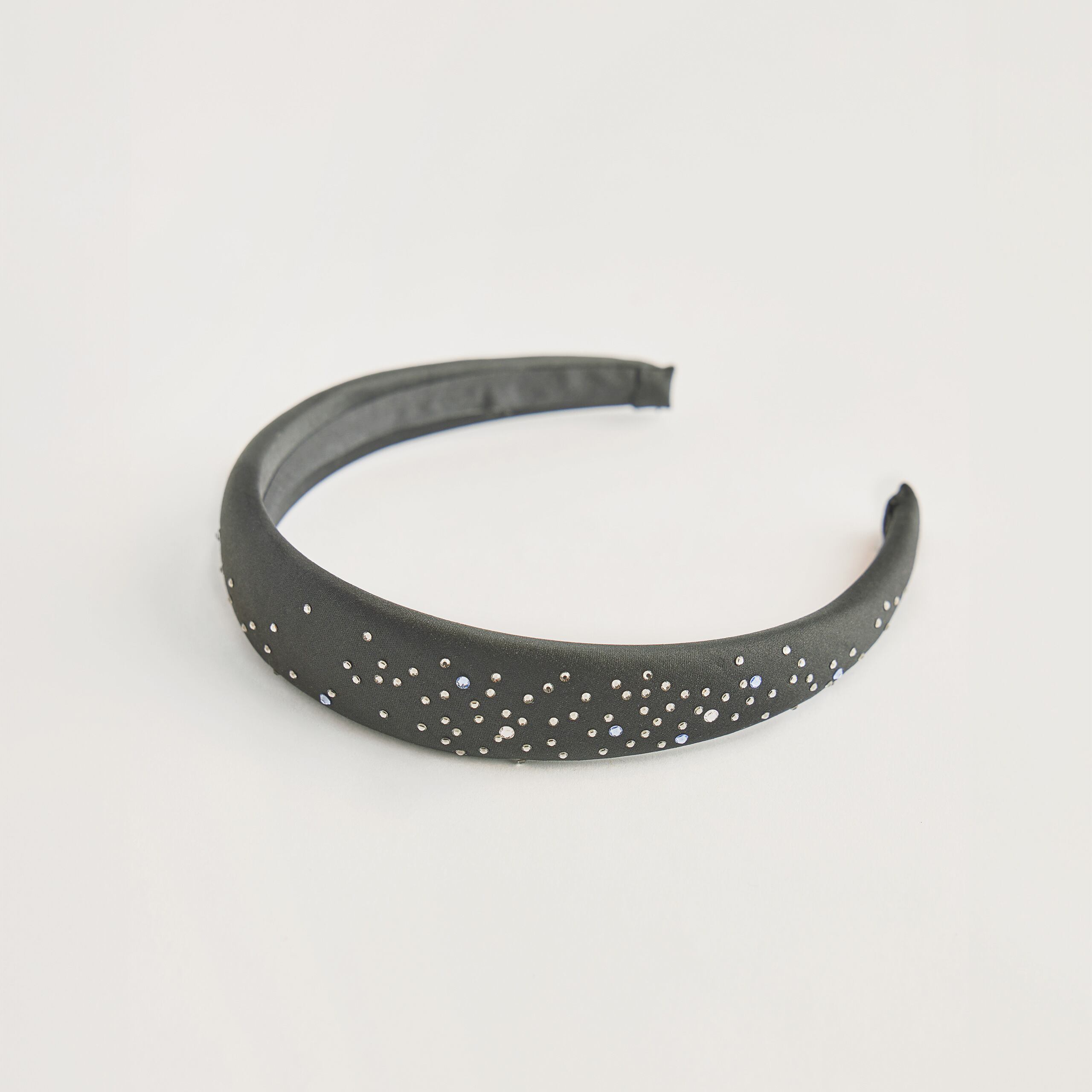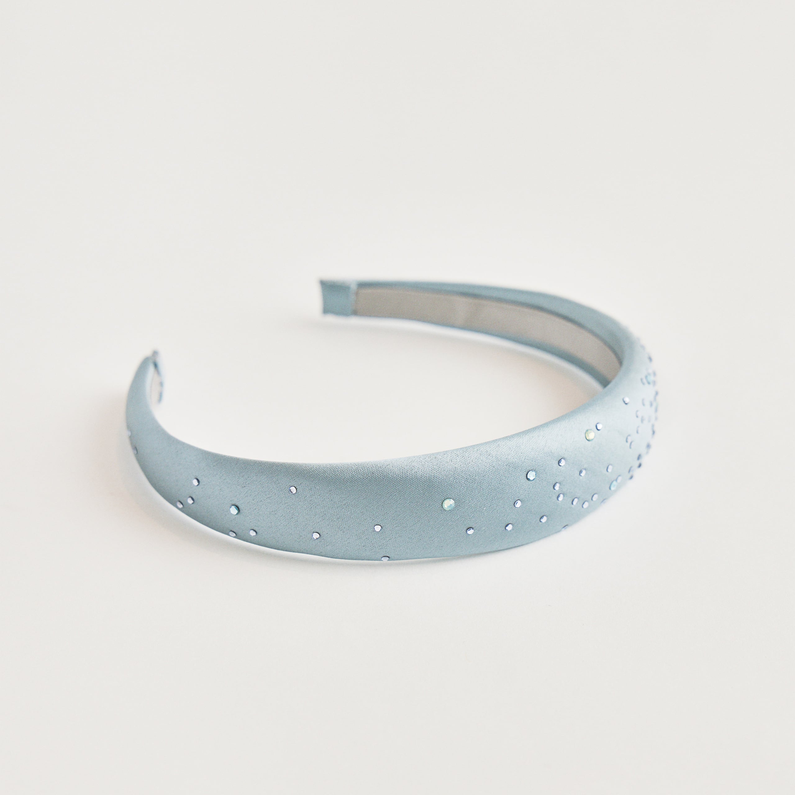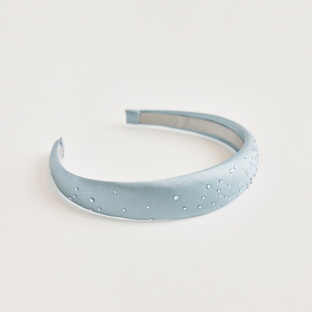 光沢のある上品な肉厚サテン生地に、小さなものは直径約2mmの小粒クリスタルを120粒以上ちりばめたカチューシャです。細かなクリスタルが繊細にきらめき、華やかすぎず上品な印象で、コーディネートのアクセントとして、さりげない輝きを加えます。