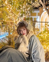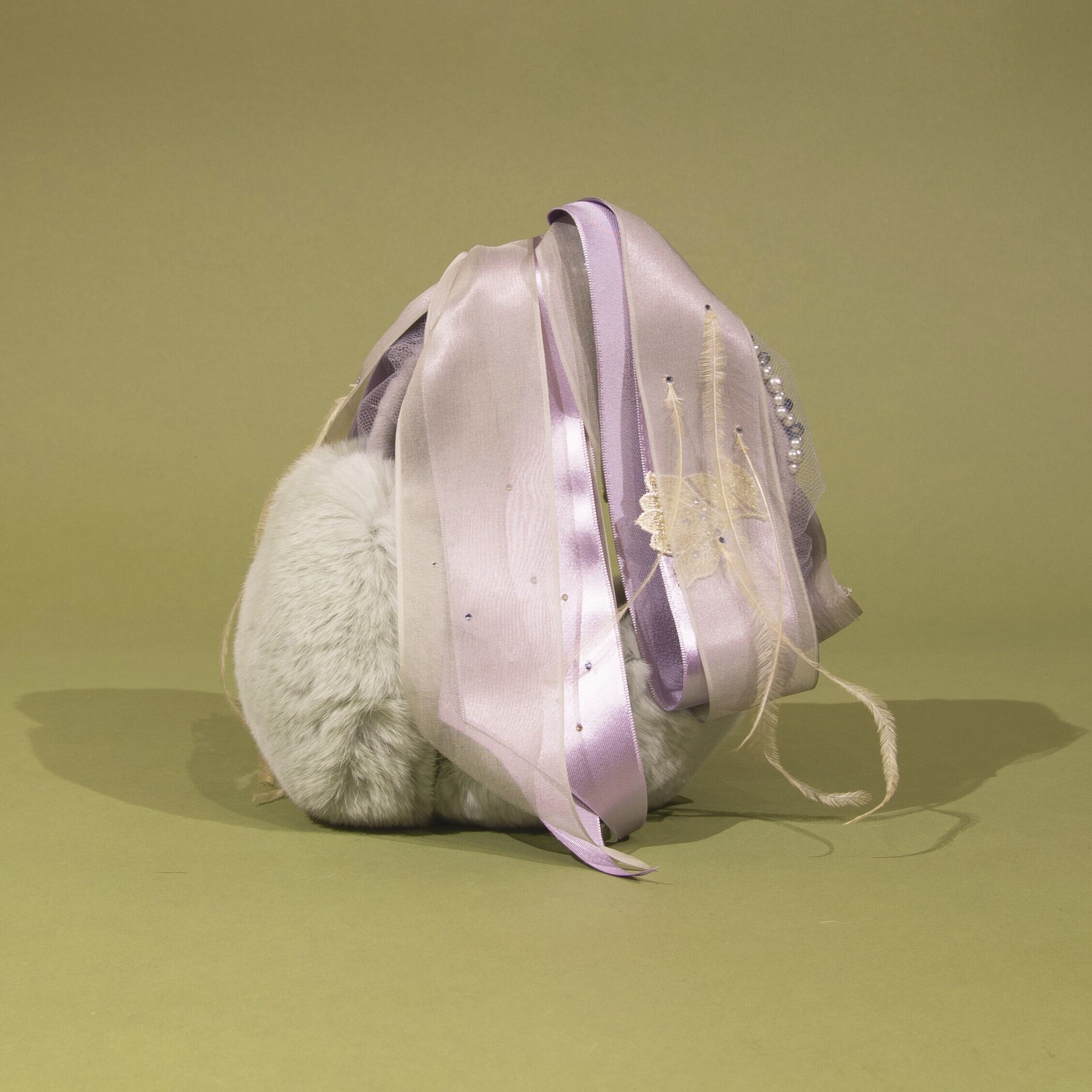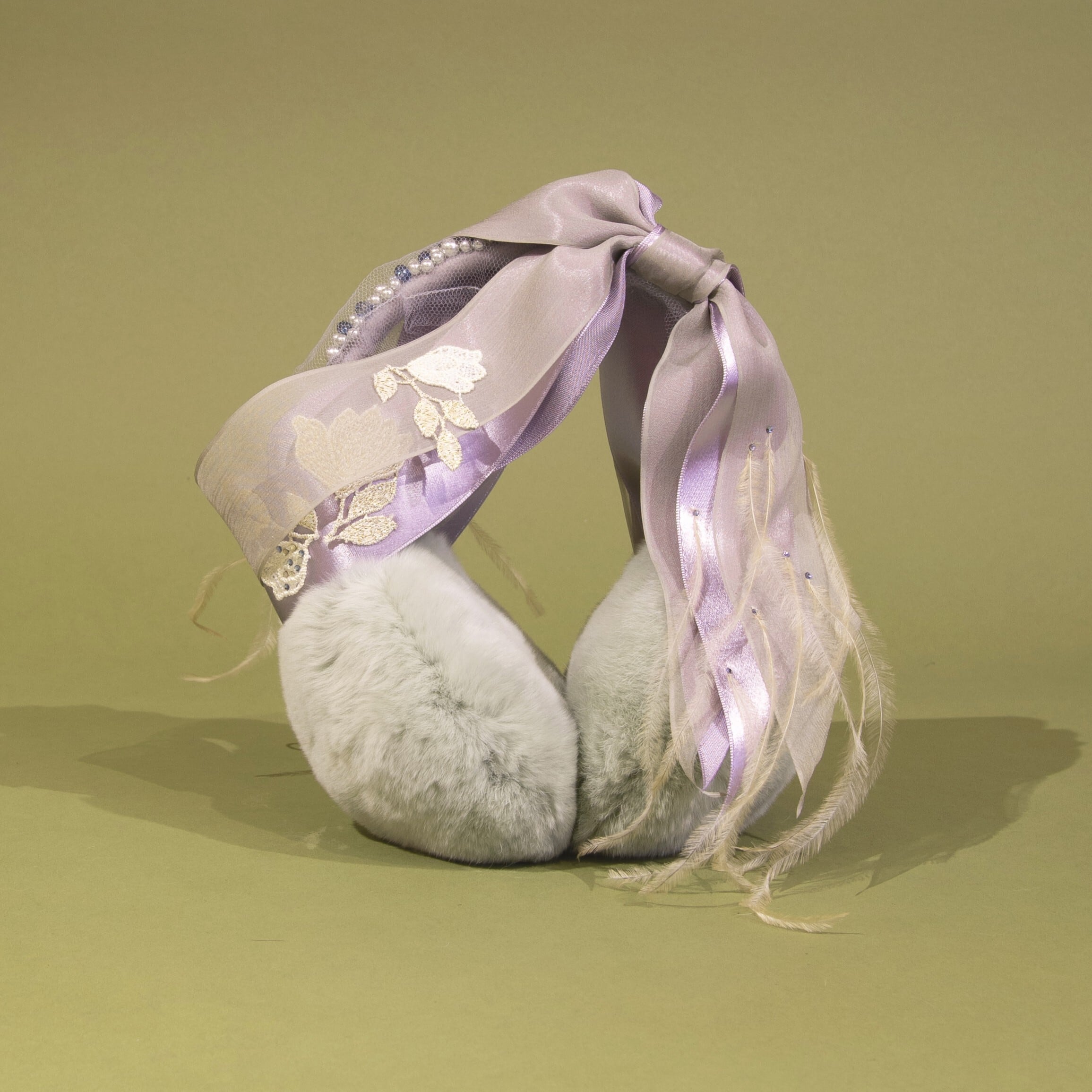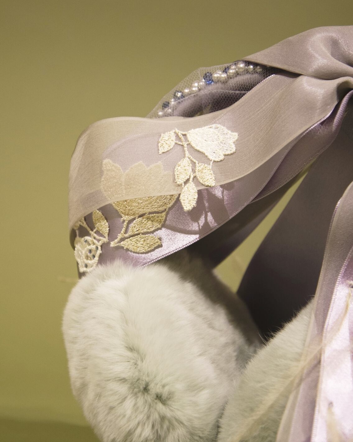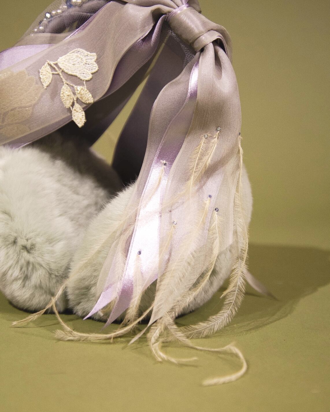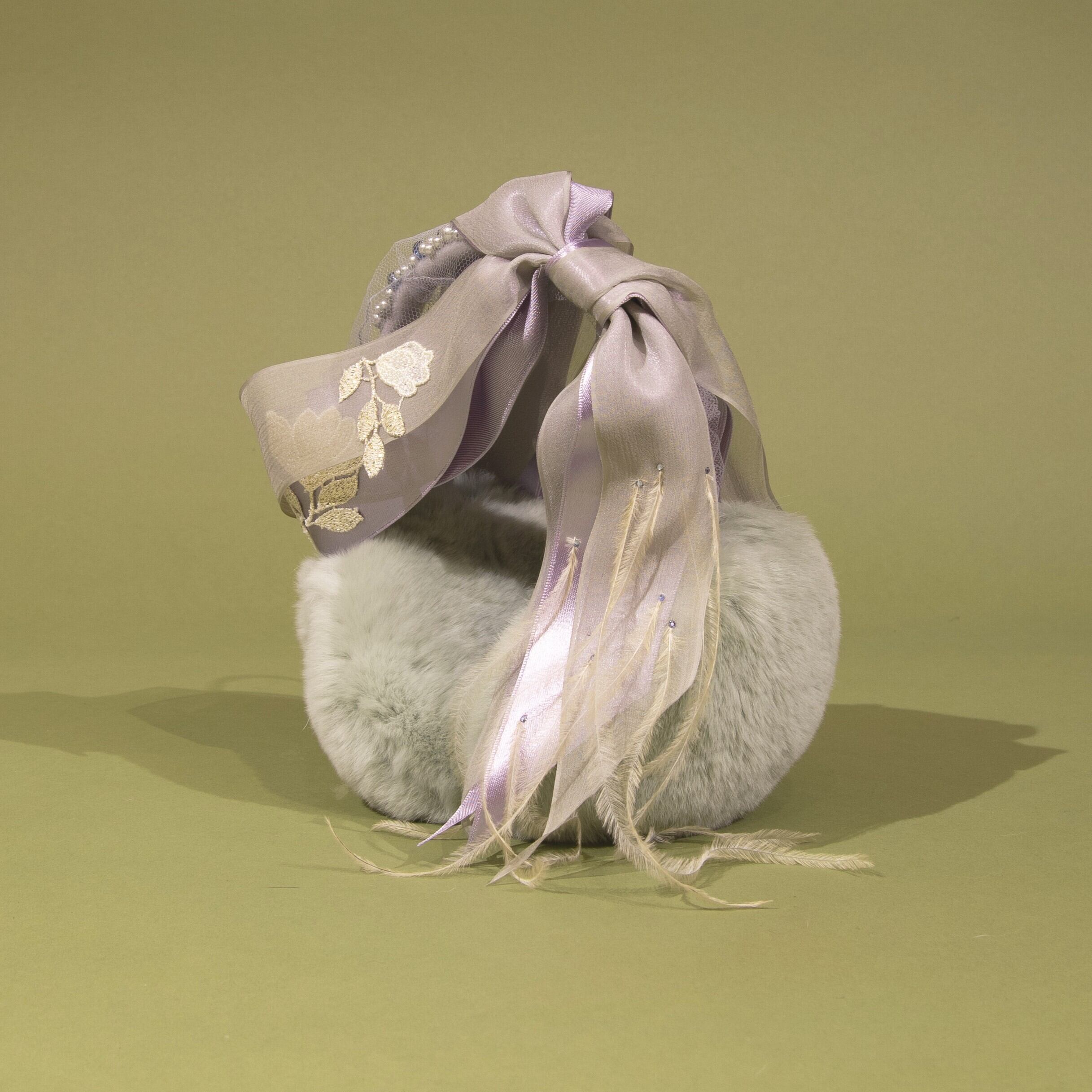 ・リボンは所々、イヤーマフラー本体と縫い留めしております。その部分を強く引っ張ると縫い外れてしまう可能性がございます。またとても繊細なリボンですので、何かに引っ掛けますと傷が付きやすいです。
